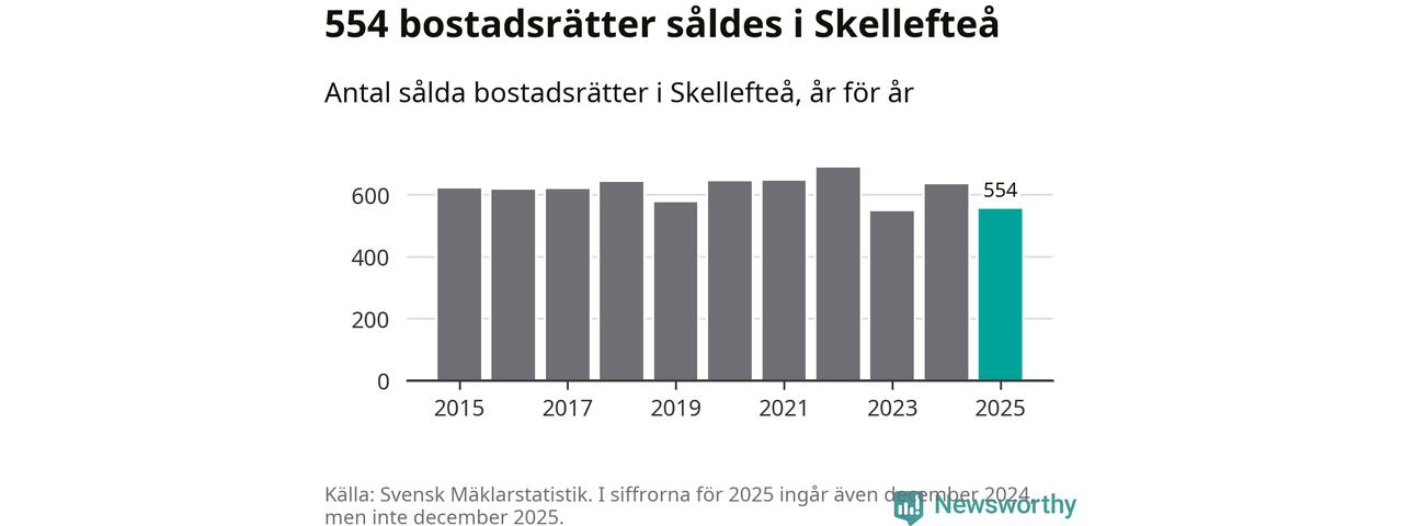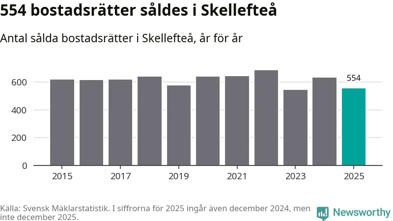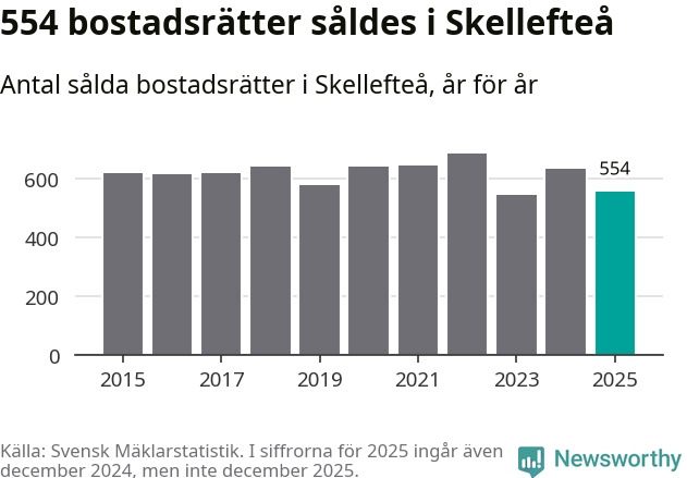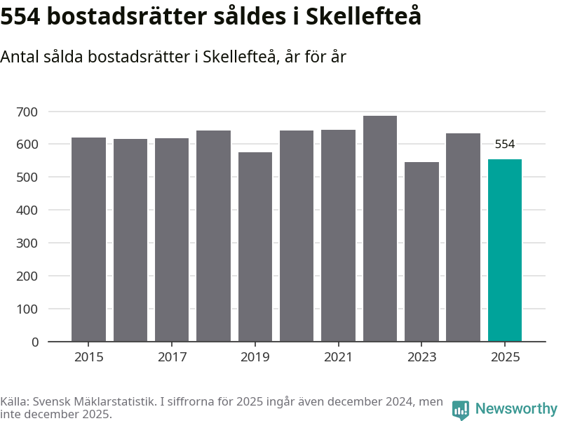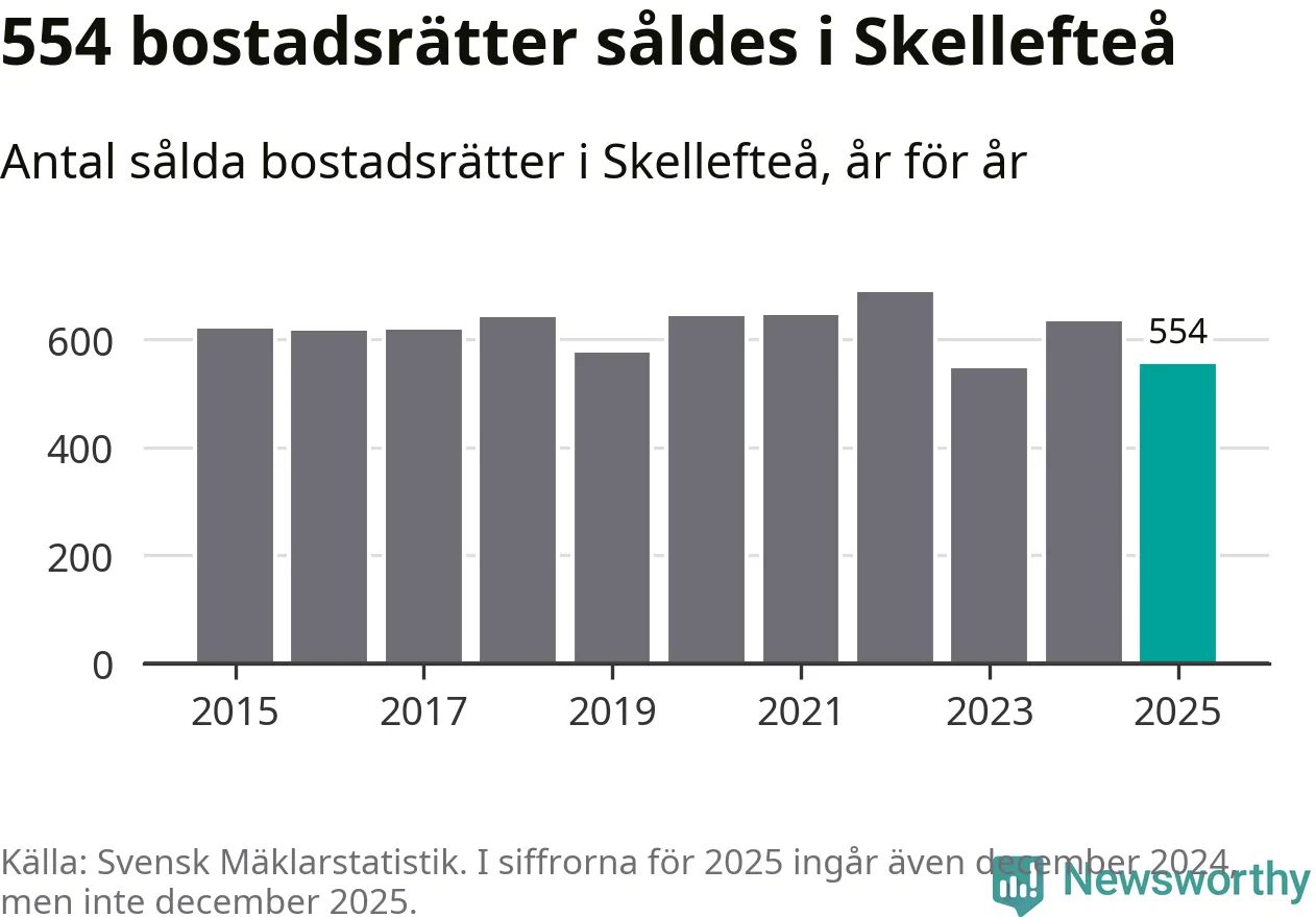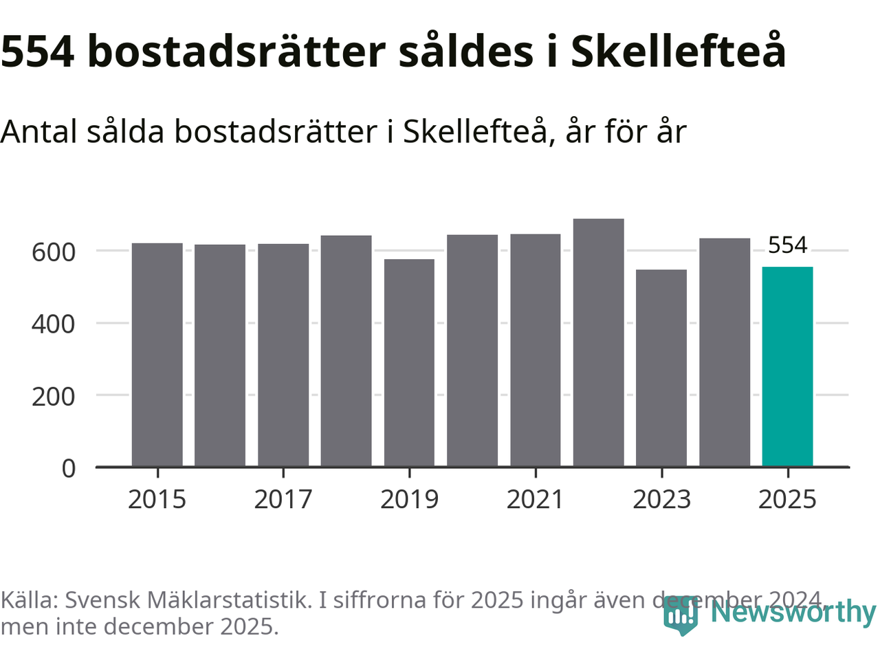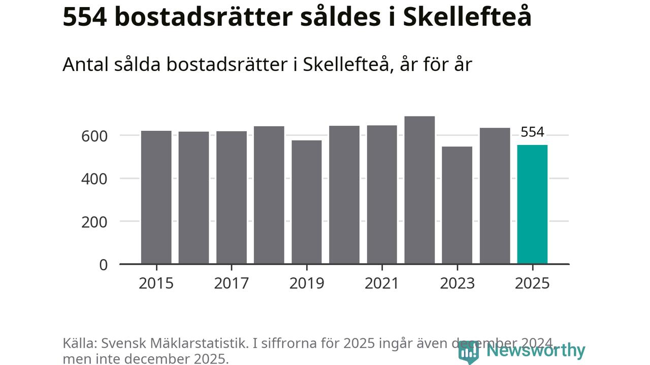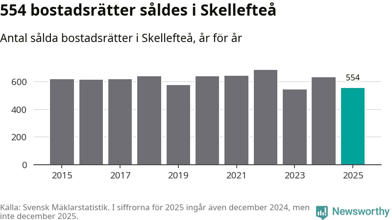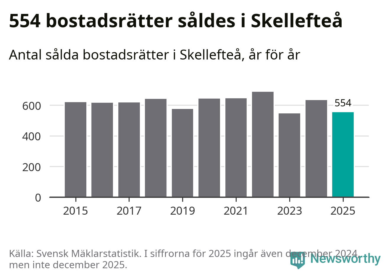 Det såldes totalt 554 bostadsrätter i Skellefteå kommun under året. Genomsnittspriset per kvadratmeter landade på 20 948 kronor. Det är en minskning med 14 procent i kommunen på ett år.