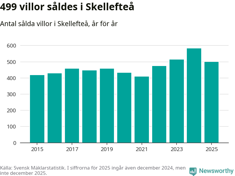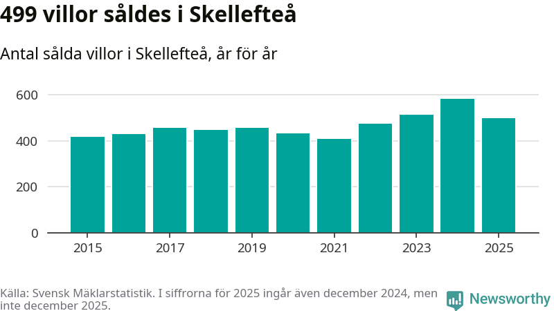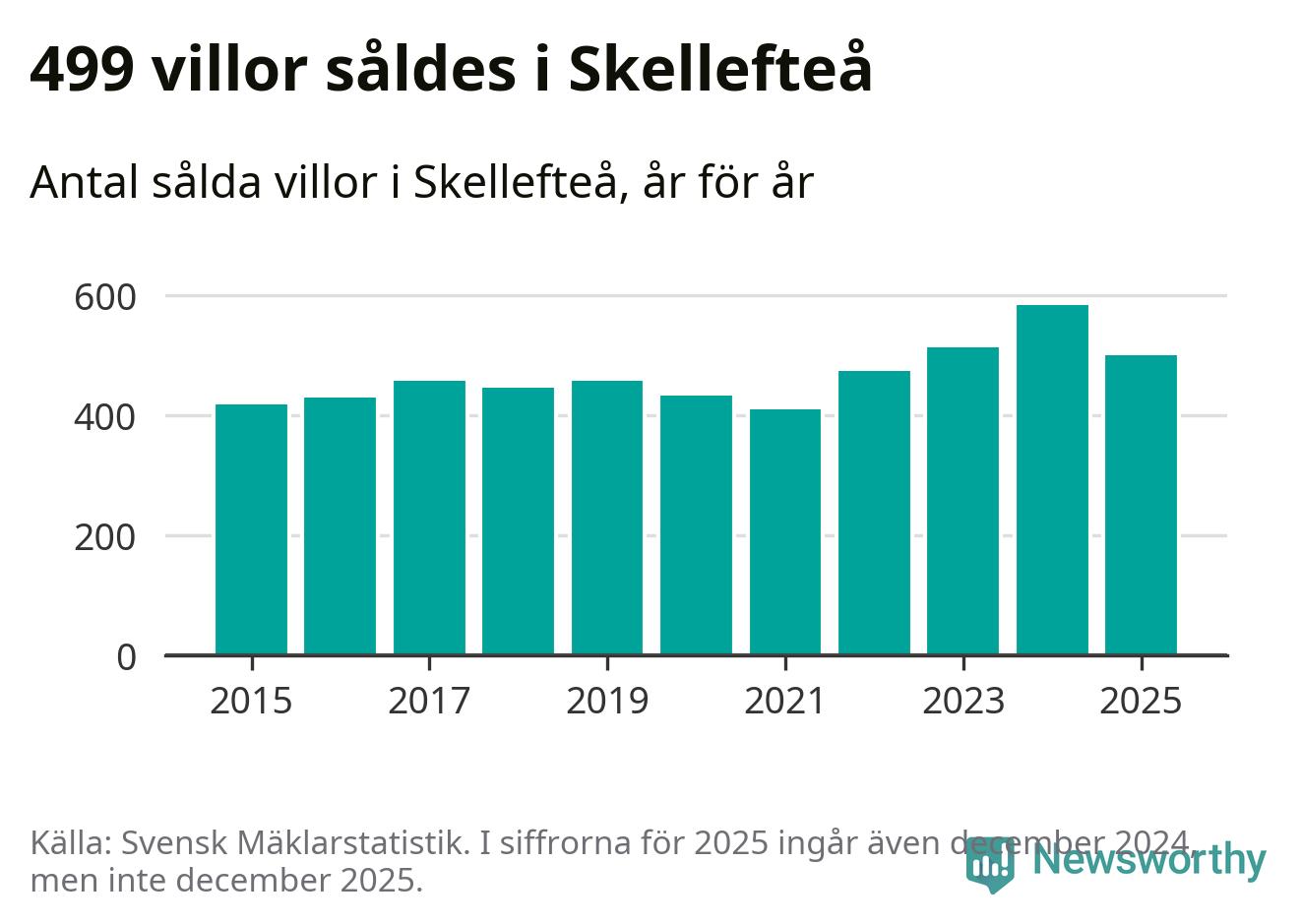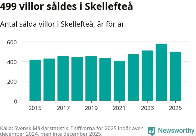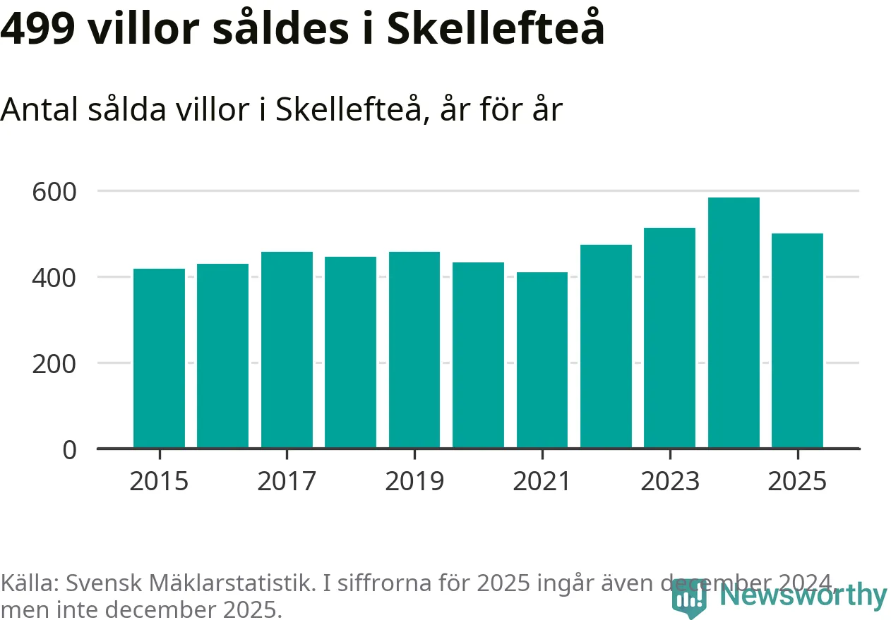 Antalet sålda villor minskade också. Totalt såldes 499 villor, att jämföra med 583 under 2024.