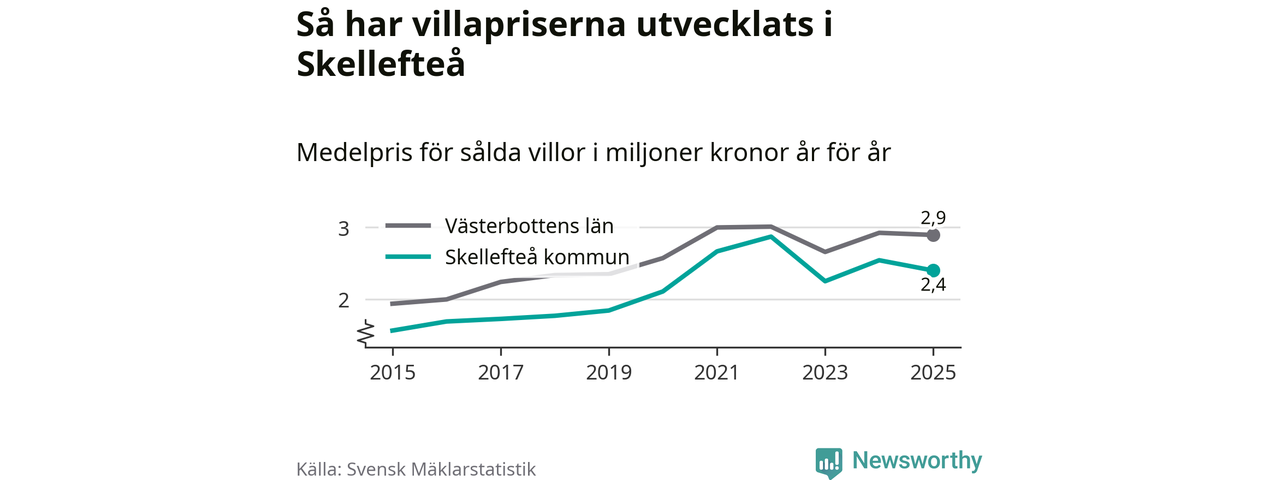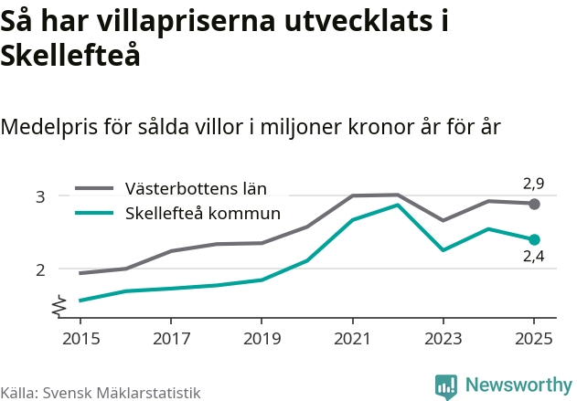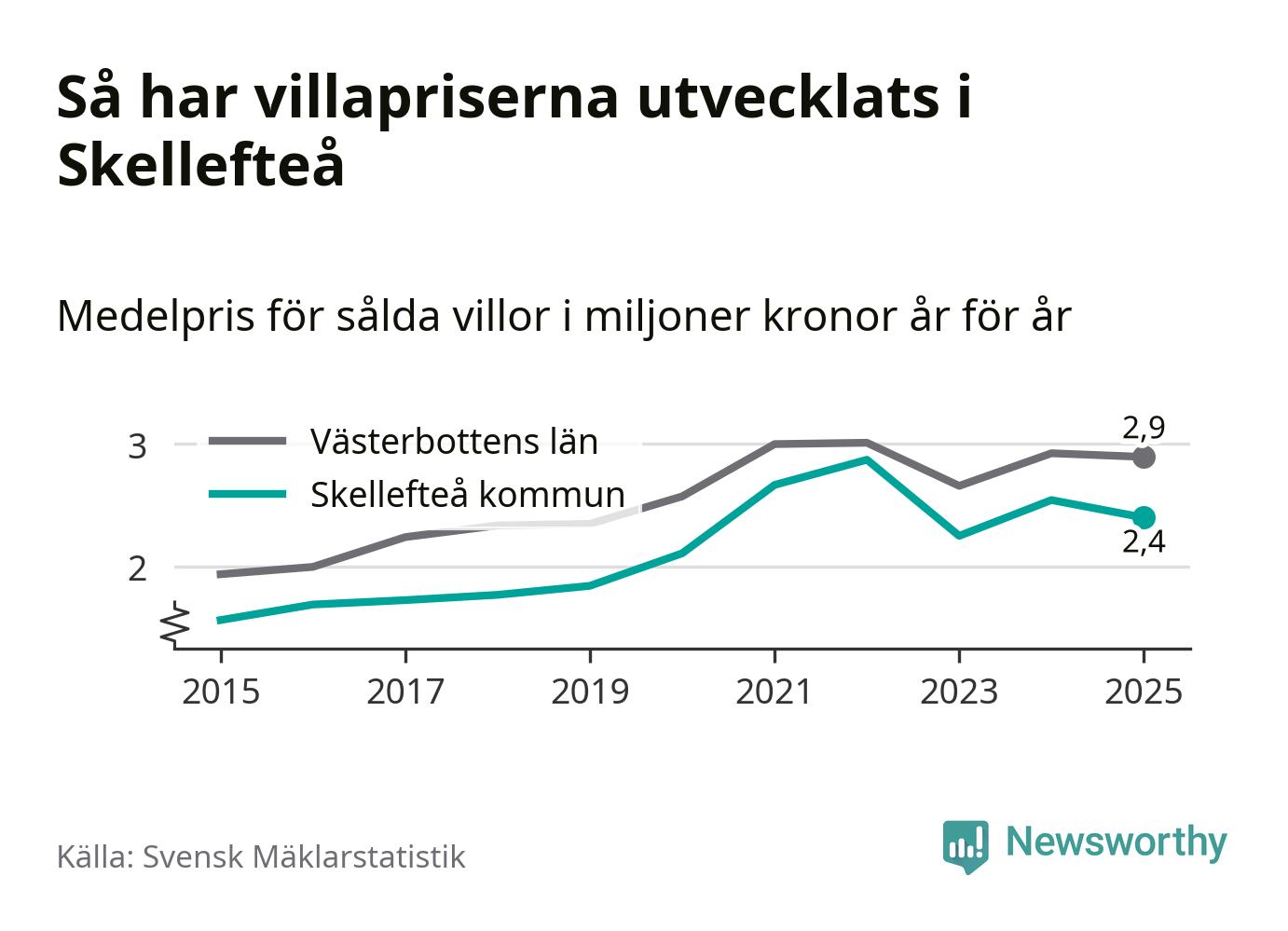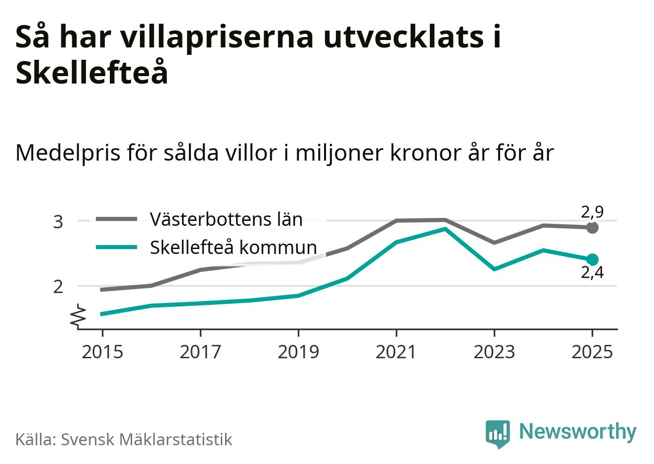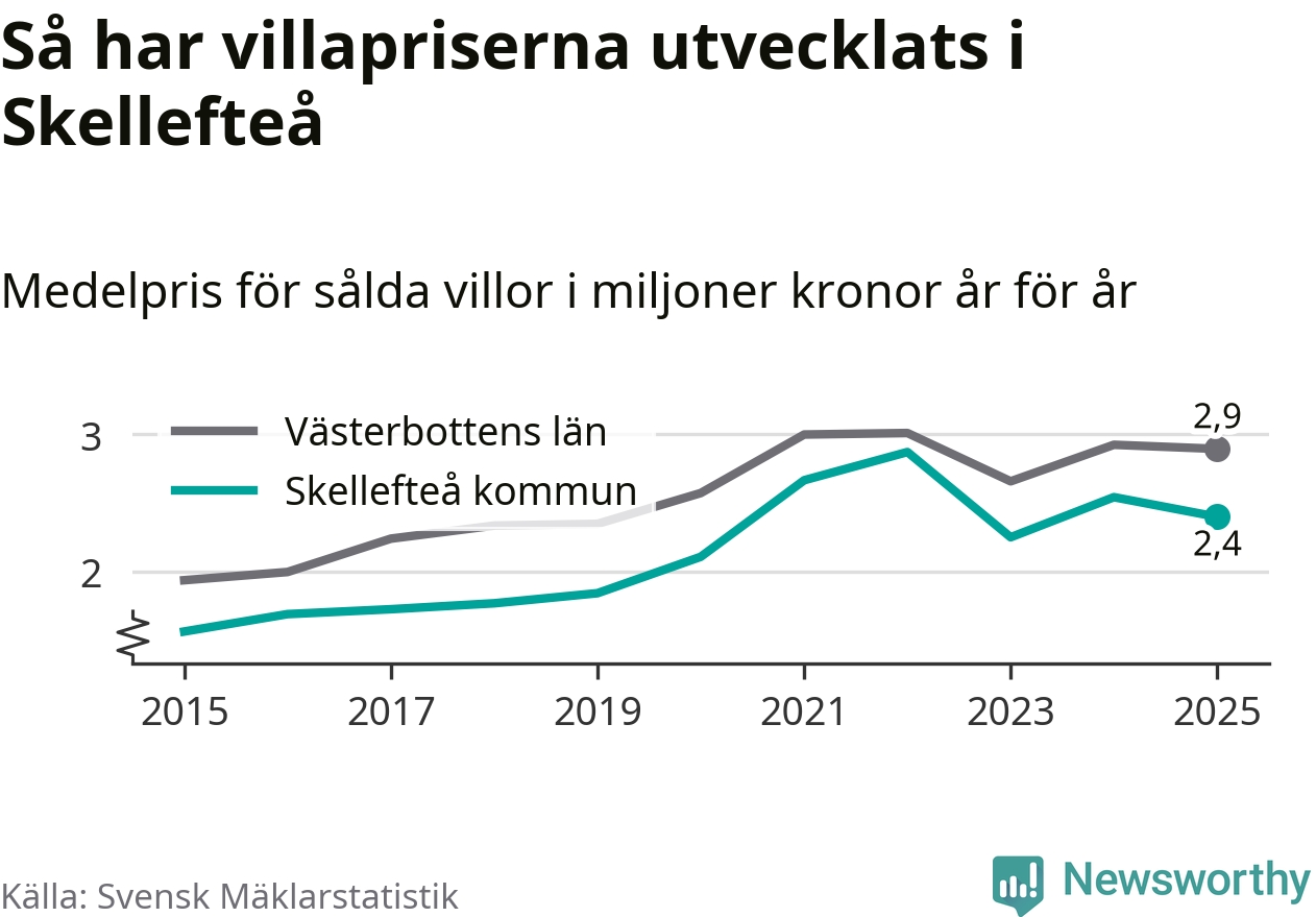 2,4 miljoner kronor är medelpriset för de villor som såldes i Skellefteå kommun under året, eller 19 195 kronor per kvadratmeter. Det innebär en prisminskning med sex procent på ett år.