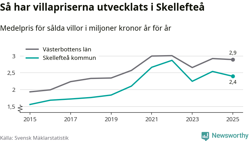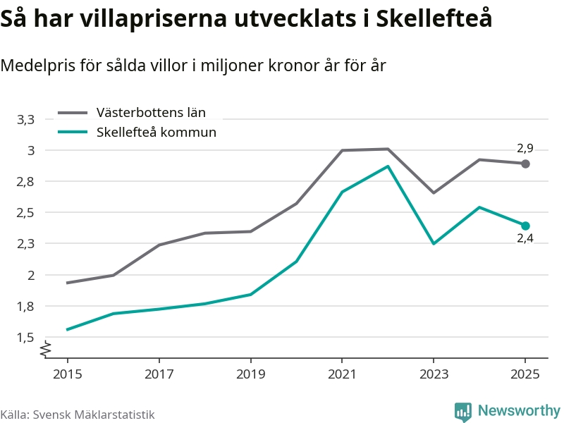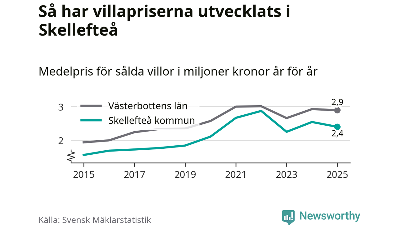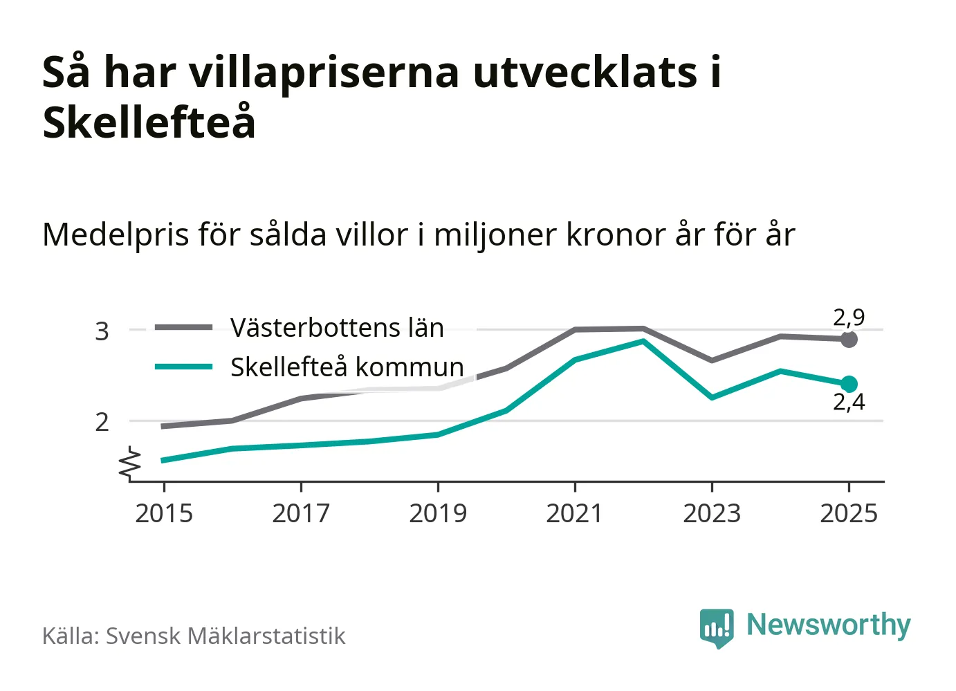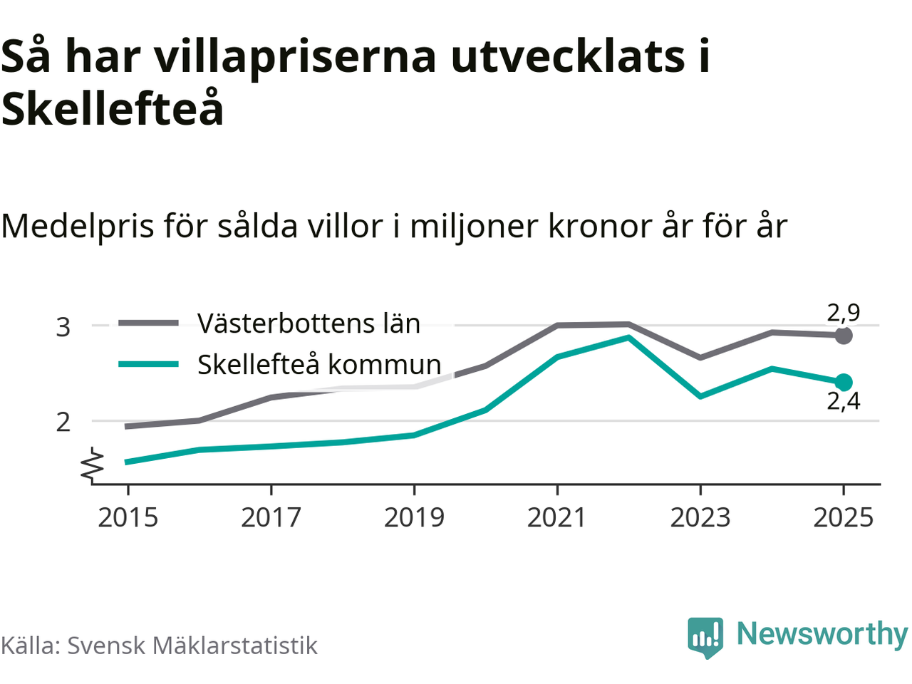 2,4 miljoner kronor är medelpriset för de villor som såldes i Skellefteå kommun under året, eller 19 195 kronor per kvadratmeter. Det innebär en prisminskning med sex procent på ett år.