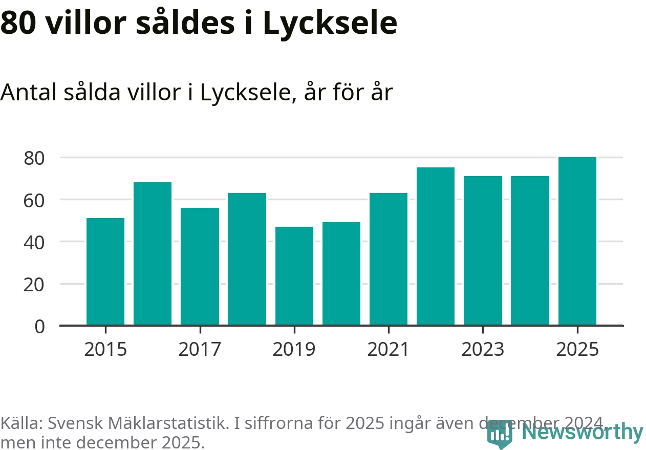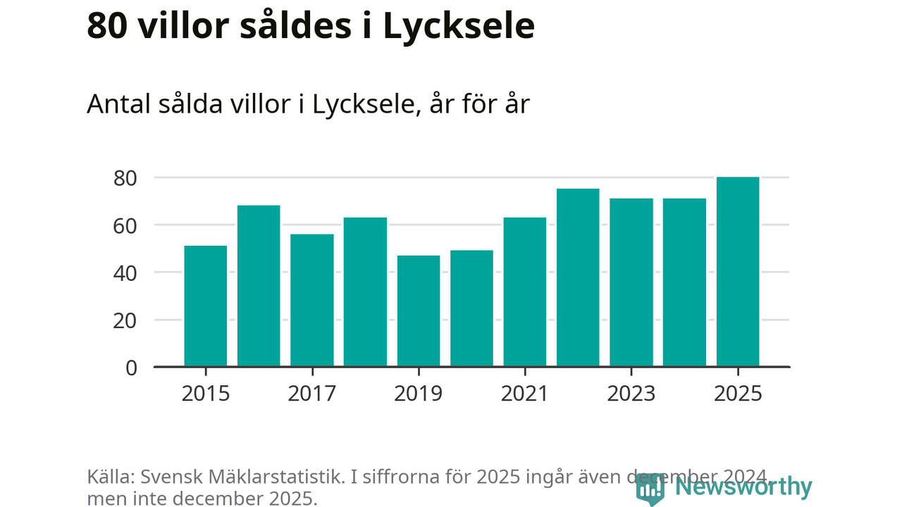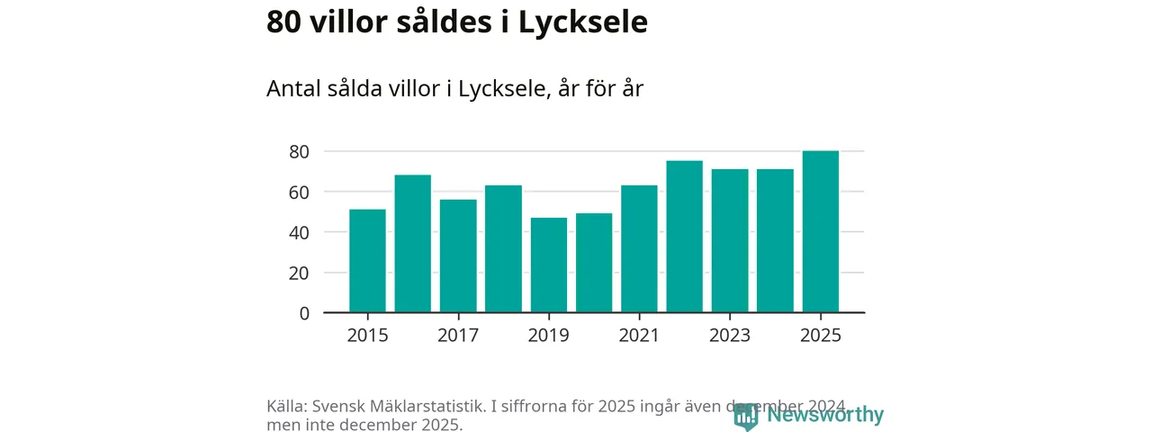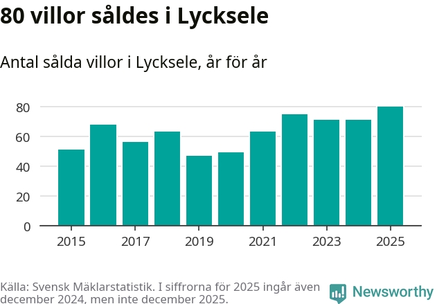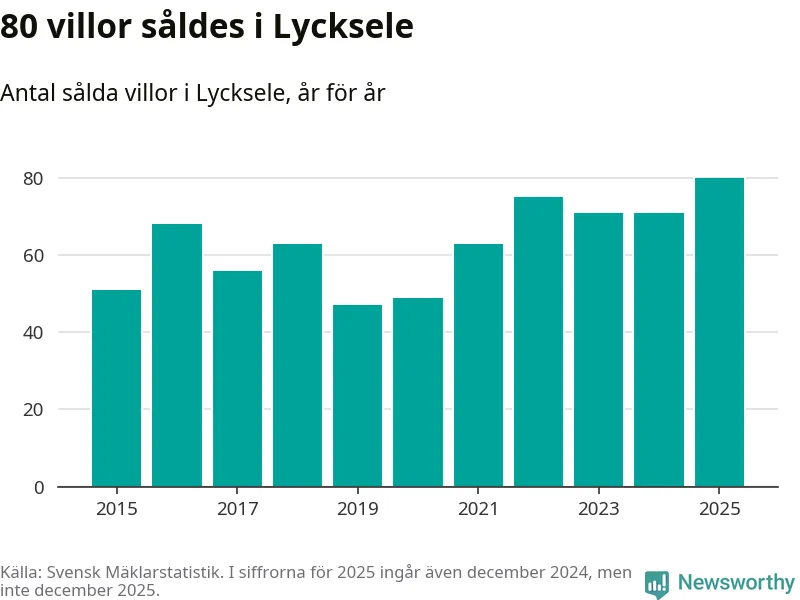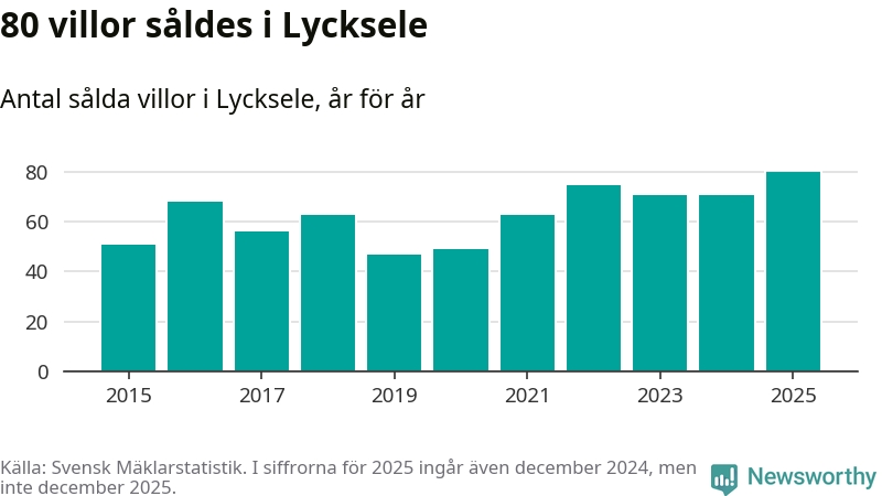 Däremot ökade antalet sålda villor. Totalt såldes 80 villor, att jämföra med 71 under 2024. Det är fler än något annat år sedan 2015.