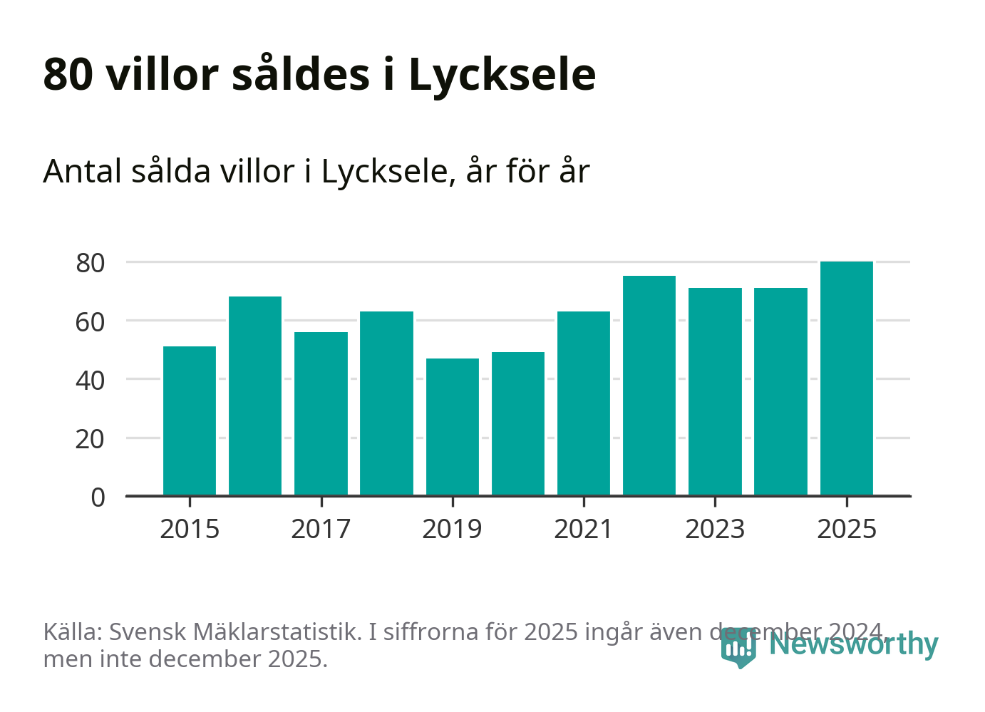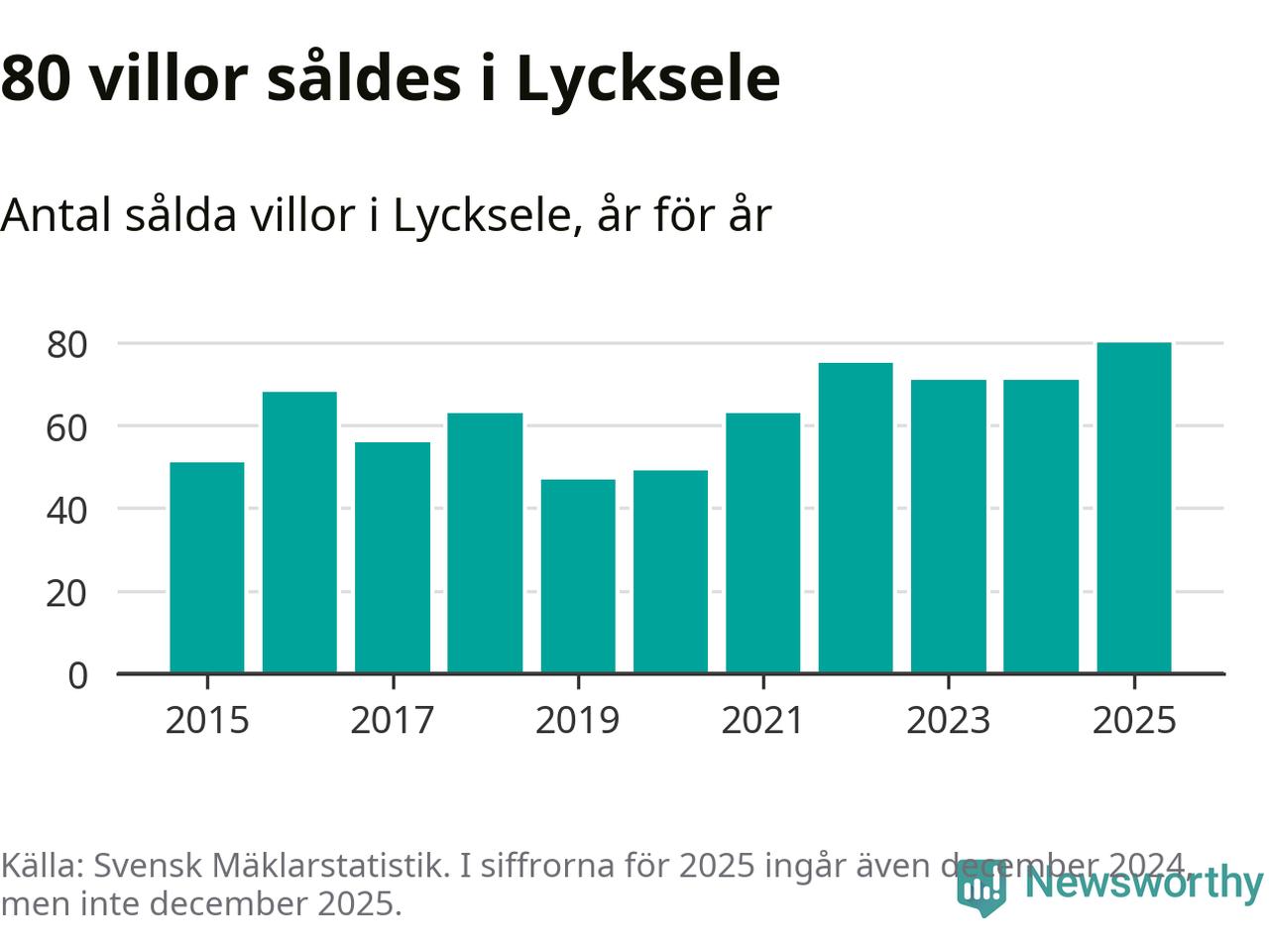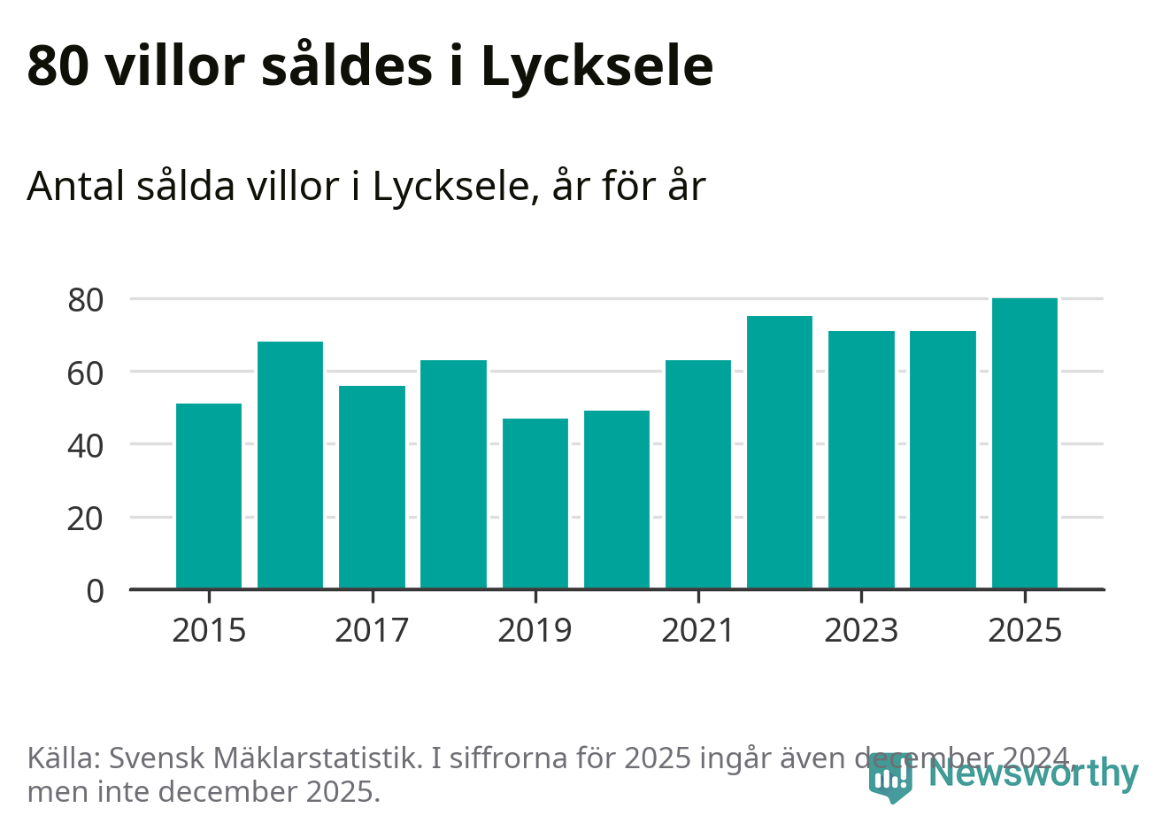 Däremot ökade antalet sålda villor. Totalt såldes 80 villor, att jämföra med 71 under 2024. Det är fler än något annat år sedan 2015.