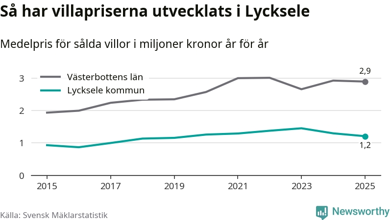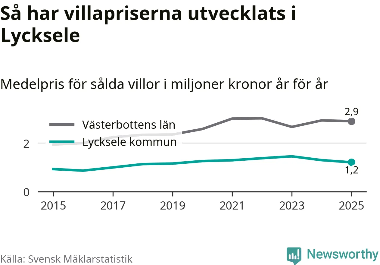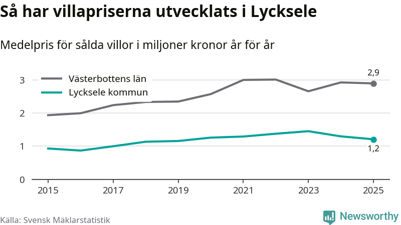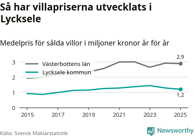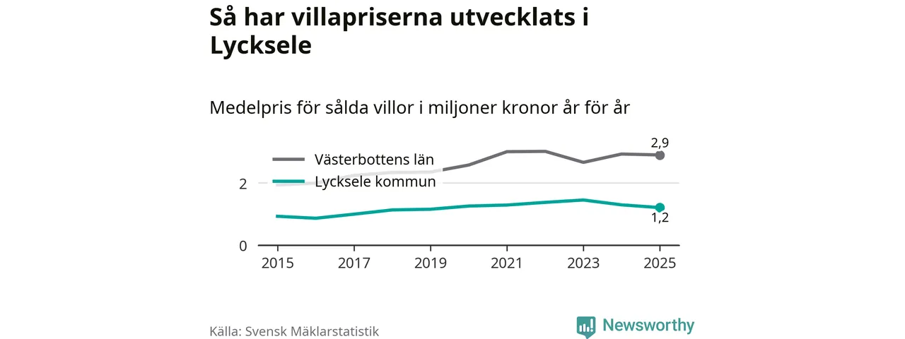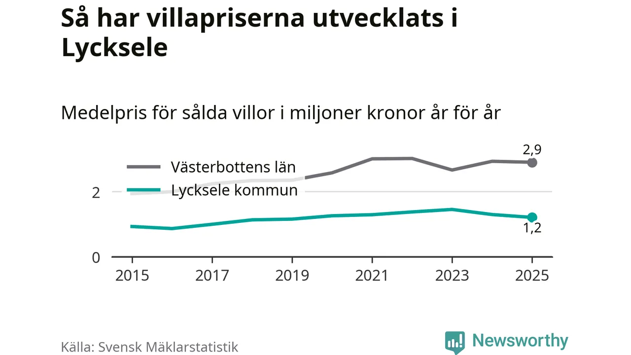 1,2 miljoner kronor är medelpriset för de villor som såldes i Lycksele kommun under året, eller 10 395 kronor per kvadratmeter. Det innebär en prisminskning med sju procent på ett år och är andra året i rad som priserna sjunker i kommunen.