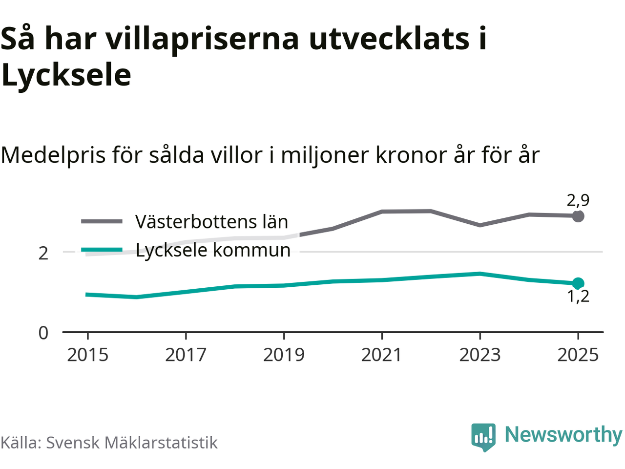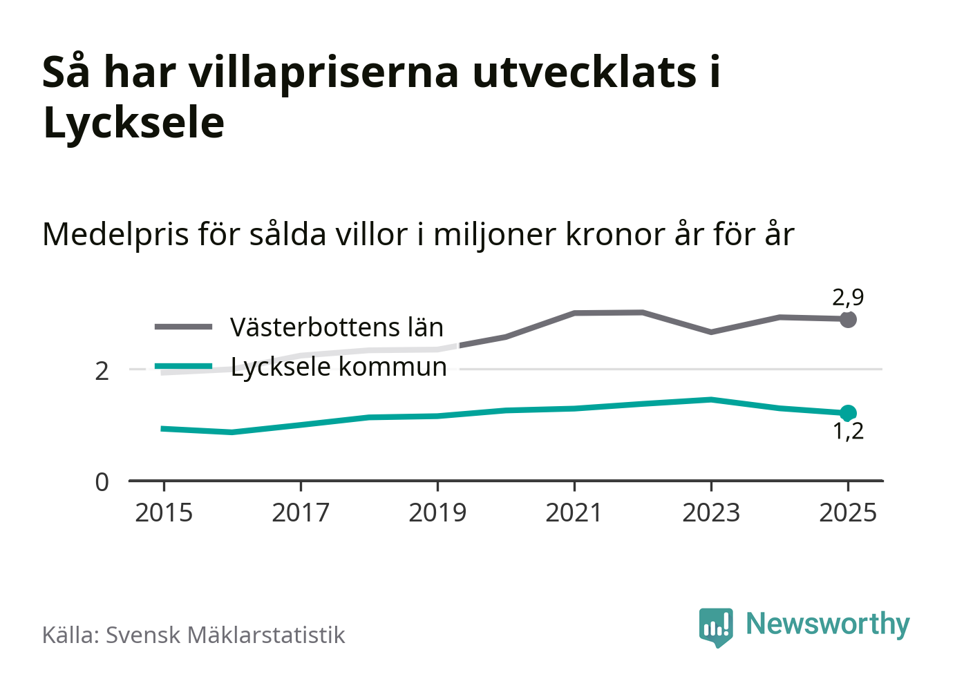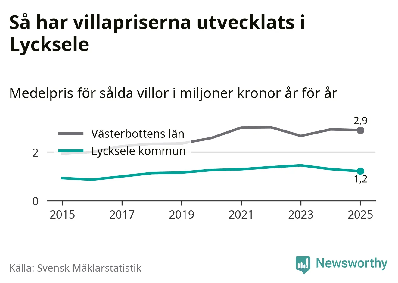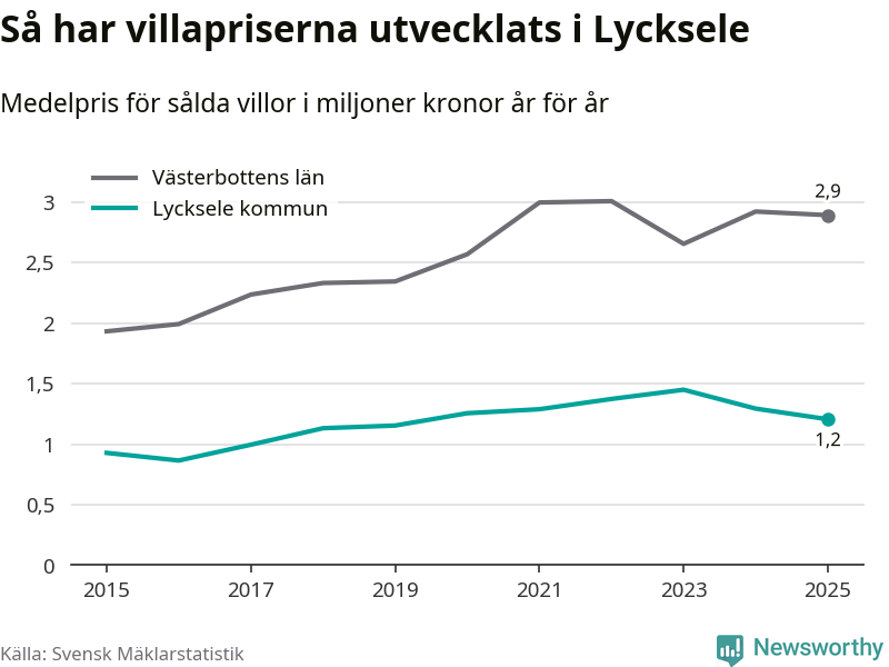 1,2 miljoner kronor är medelpriset för de villor som såldes i Lycksele kommun under året, eller 10 395 kronor per kvadratmeter. Det innebär en prisminskning med sju procent på ett år och är andra året i rad som priserna sjunker i kommunen.
