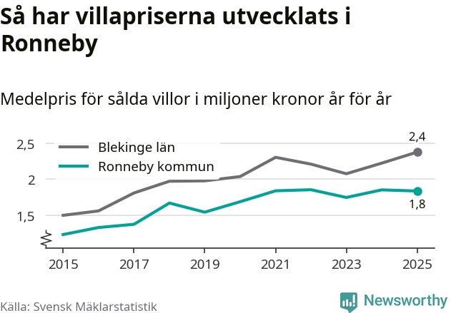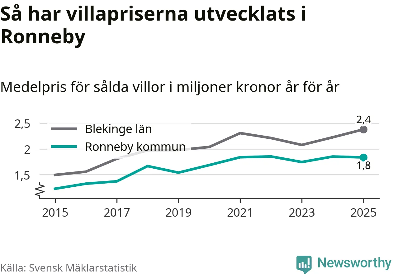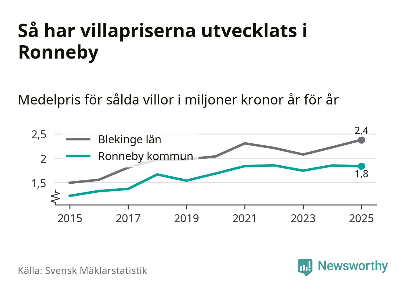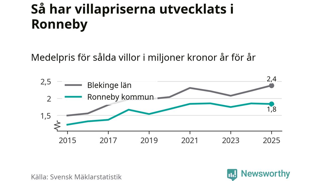 1,8 miljoner kronor är medelpriset för de villor som såldes i Ronneby kommun under året, eller 16 127 kronor per kvadratmeter. Det innebär att priserna har legat i stort sett stilla sedan förra året.