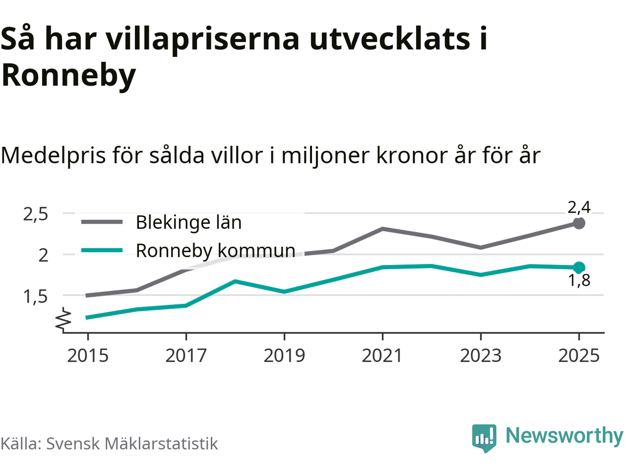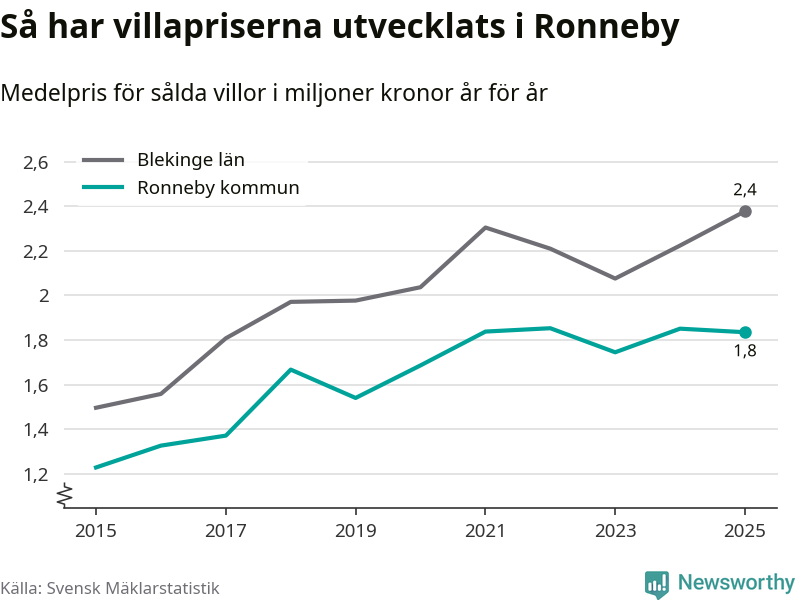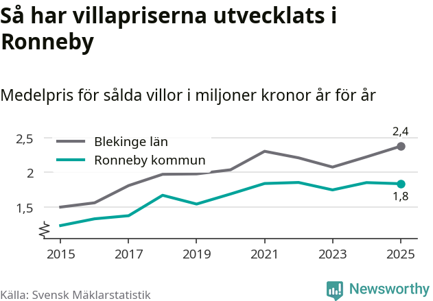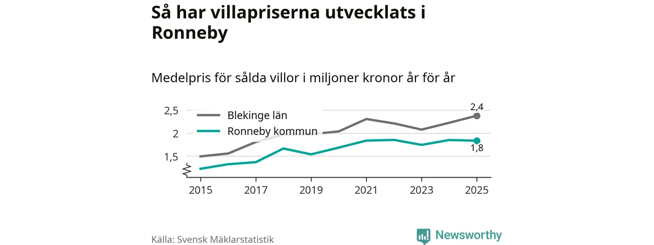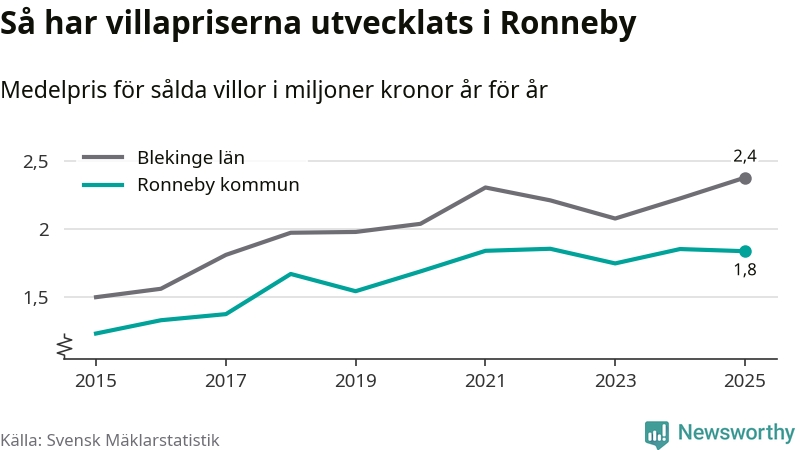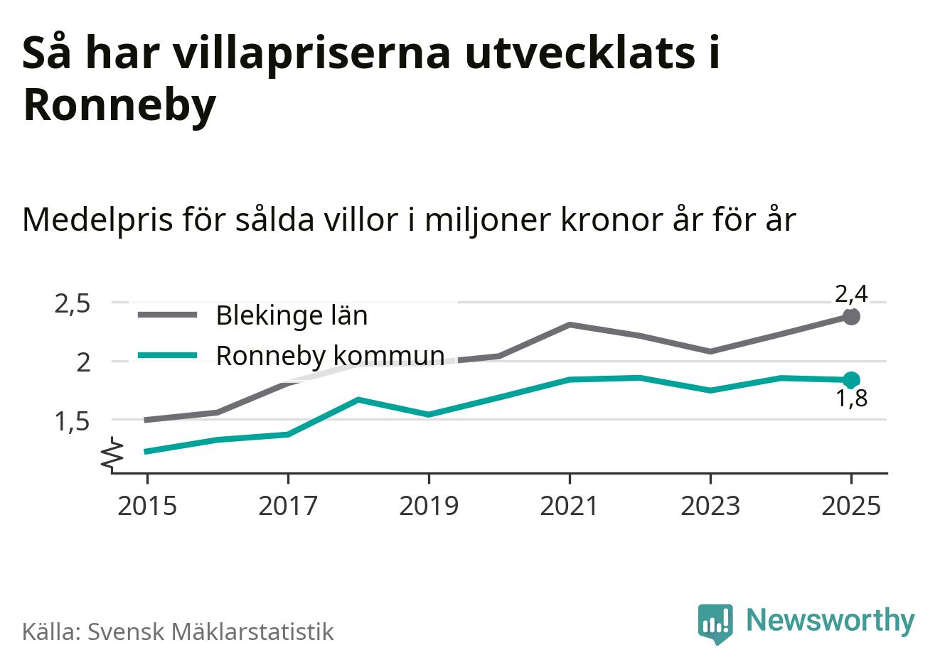 1,8 miljoner kronor är medelpriset för de villor som såldes i Ronneby kommun under året, eller 16 127 kronor per kvadratmeter. Det innebär att priserna har legat i stort sett stilla sedan förra året.