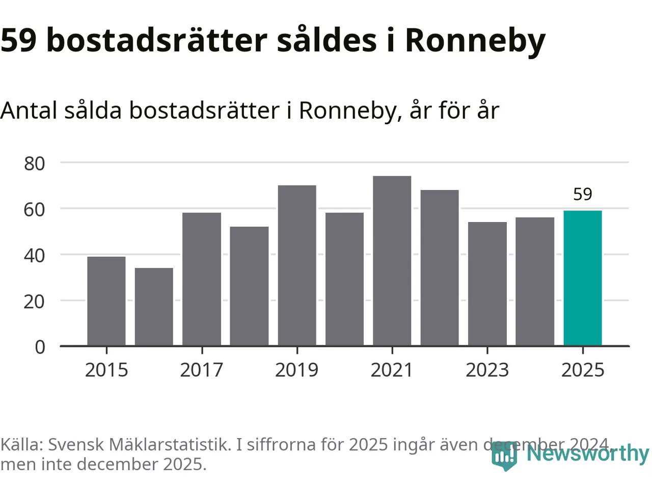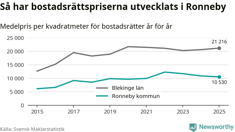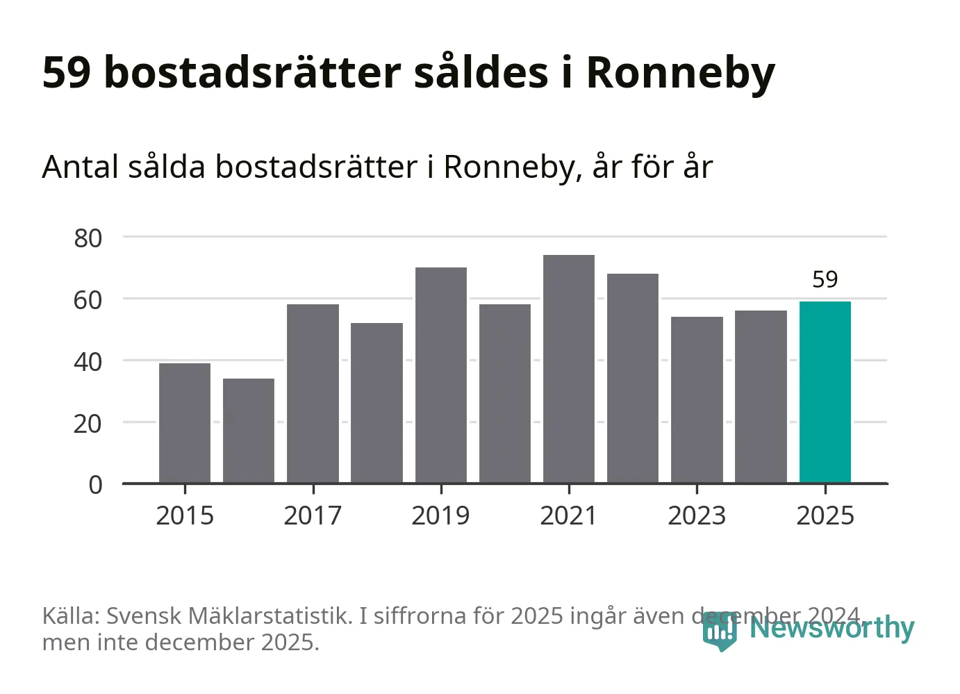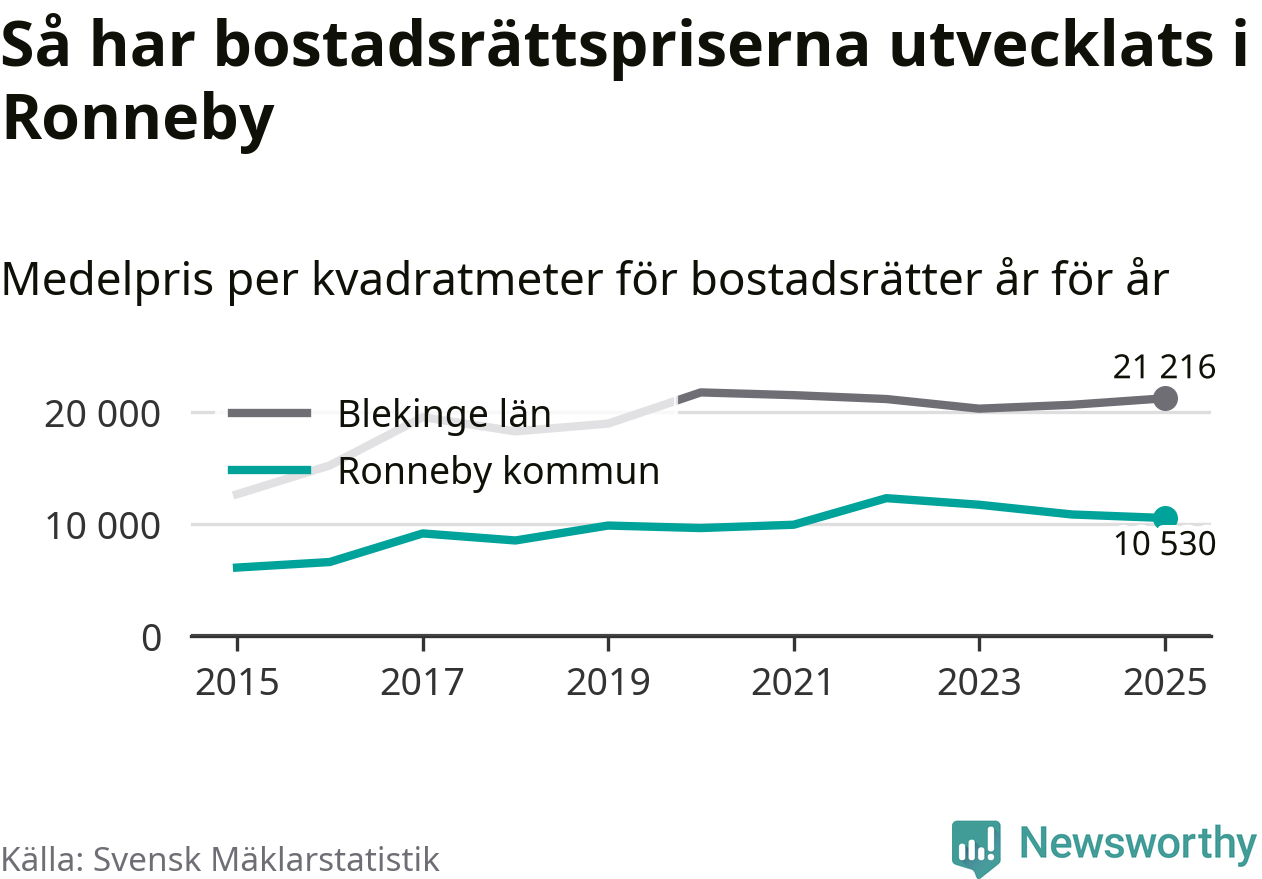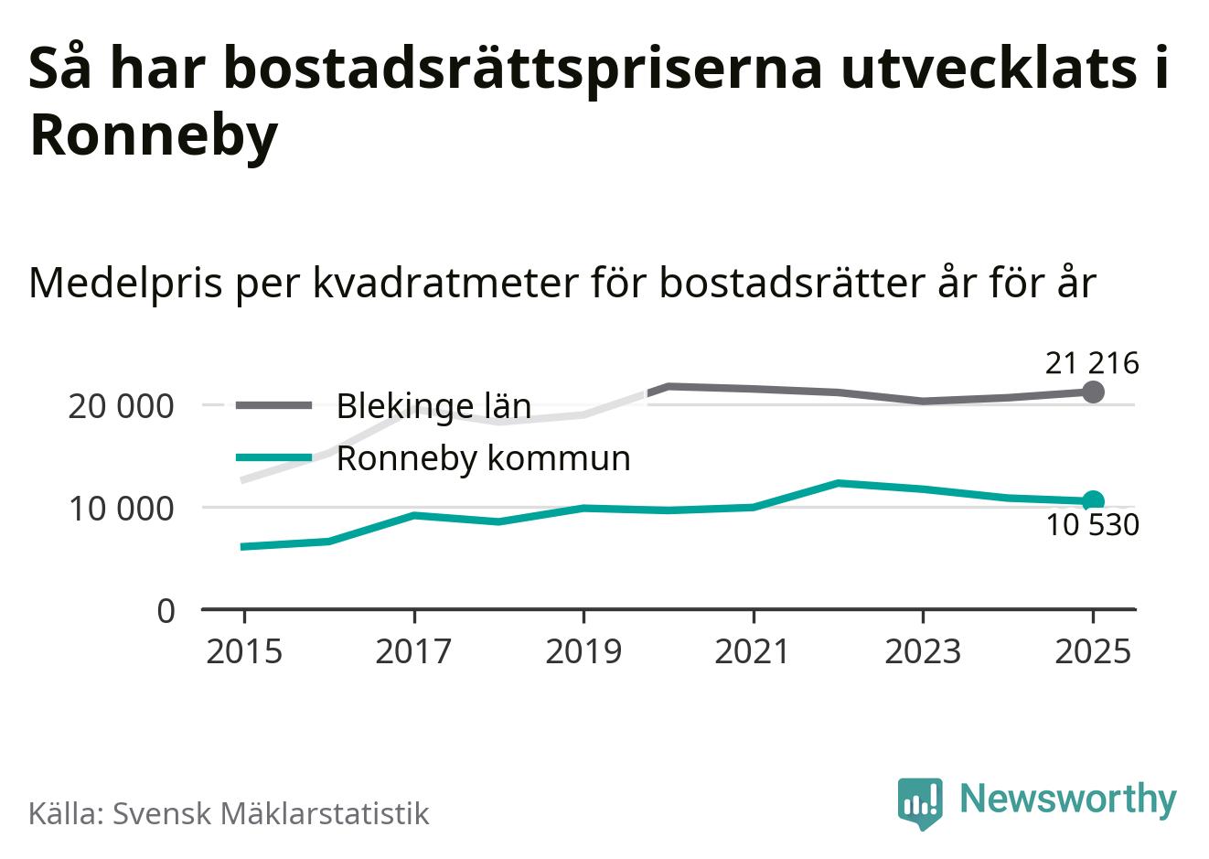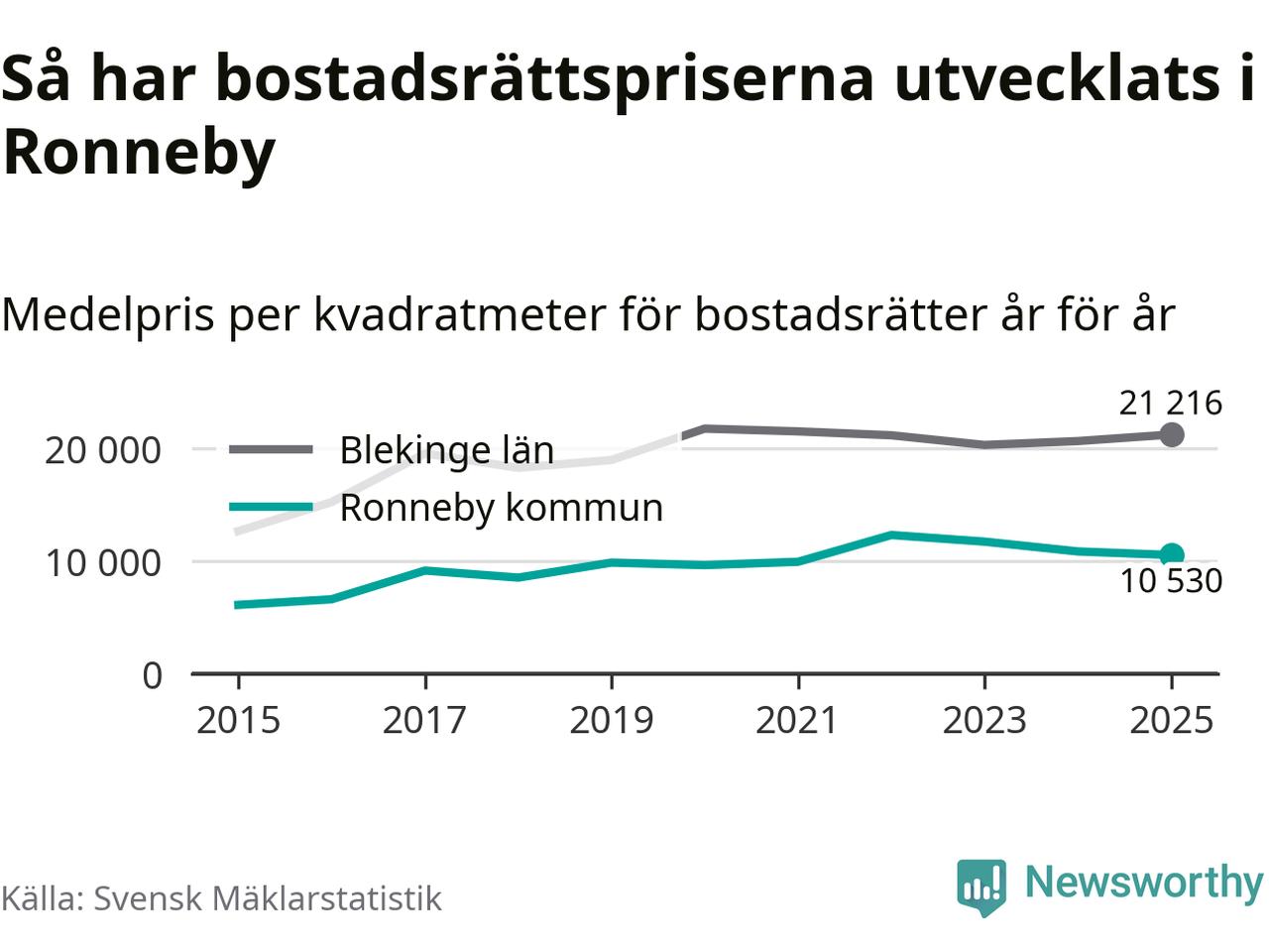 Det såldes totalt 59 bostadsrätter i Ronneby kommun under året. Genomsnittspriset per kvadratmeter landade på 10 530 kronor. Det är en minskning med tre procent i kommunen på ett år.