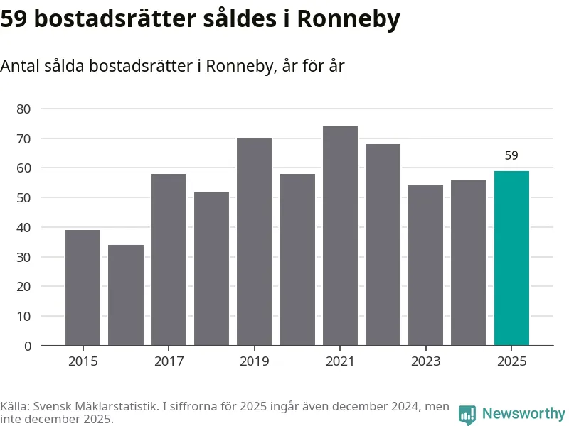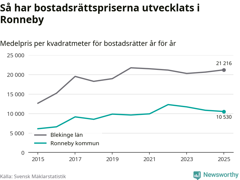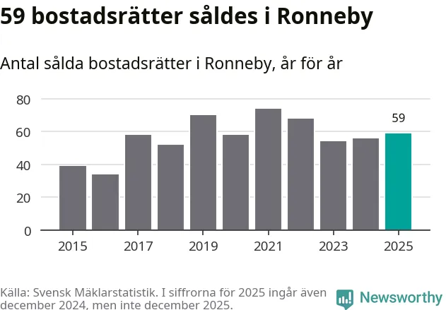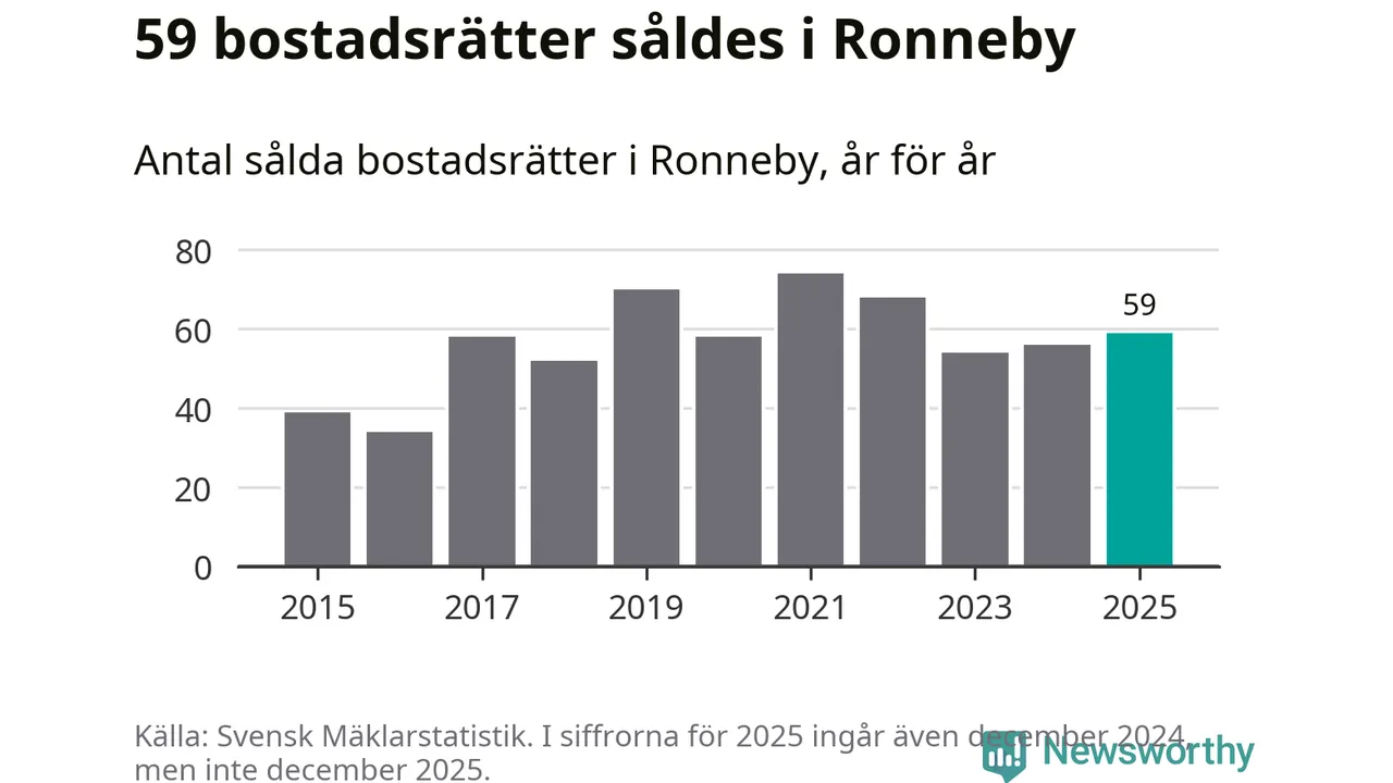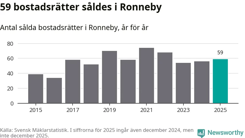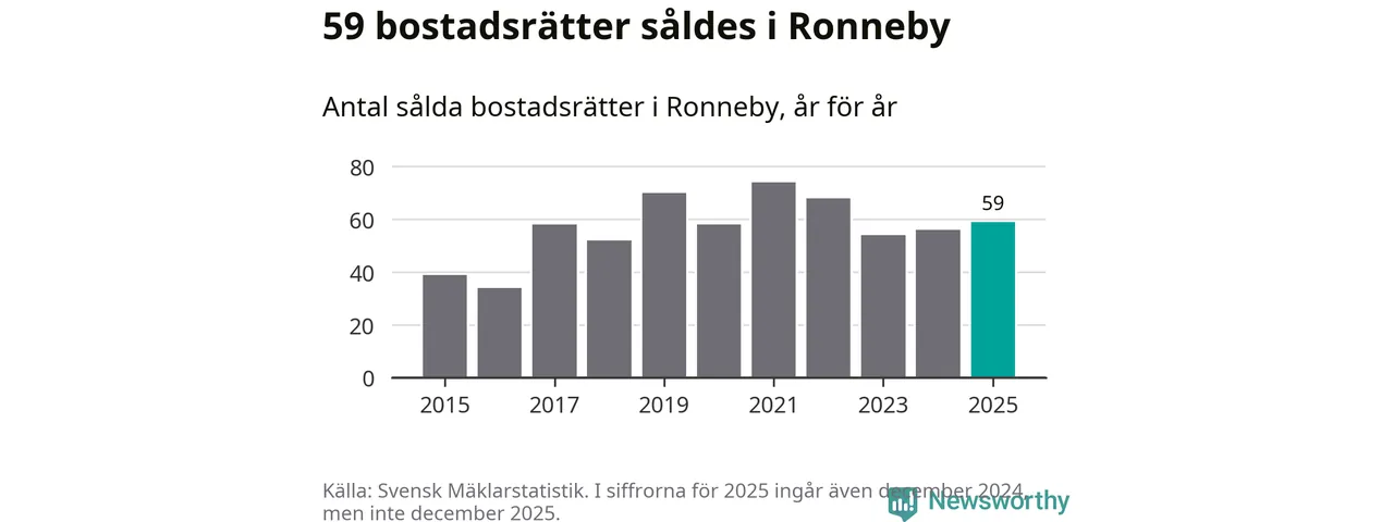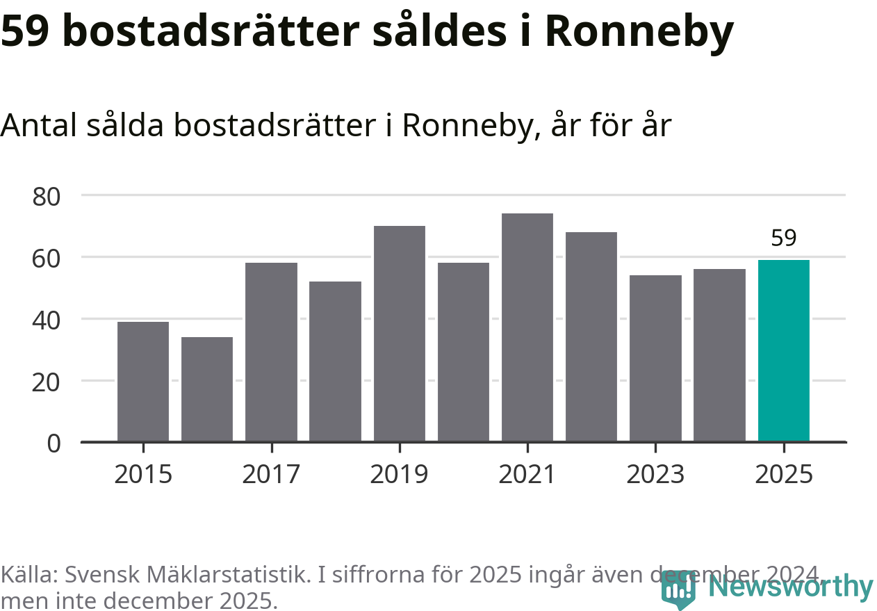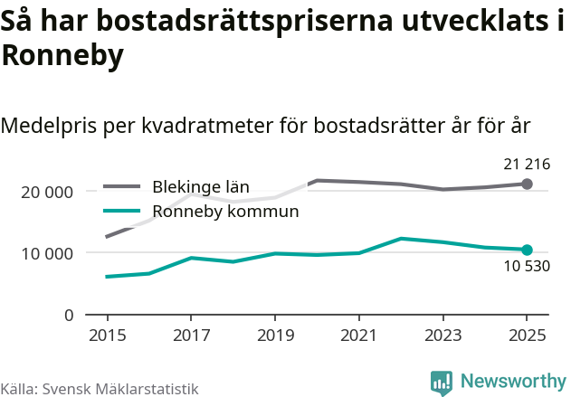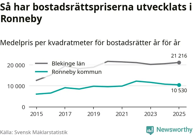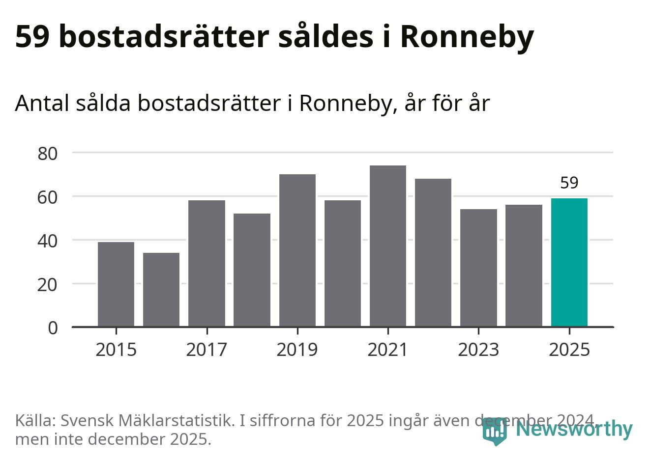Det såldes totalt 59 bostadsrätter i Ronneby kommun under året. Genomsnittspriset per kvadratmeter landade på 10 530 kronor. Det är en minskning med tre procent i kommunen på ett år.