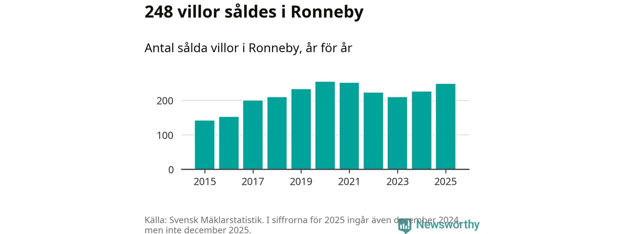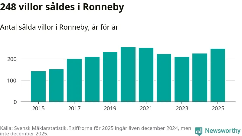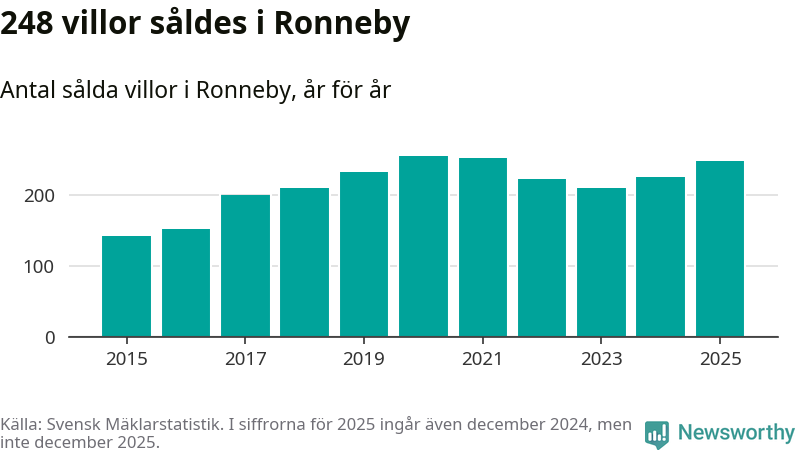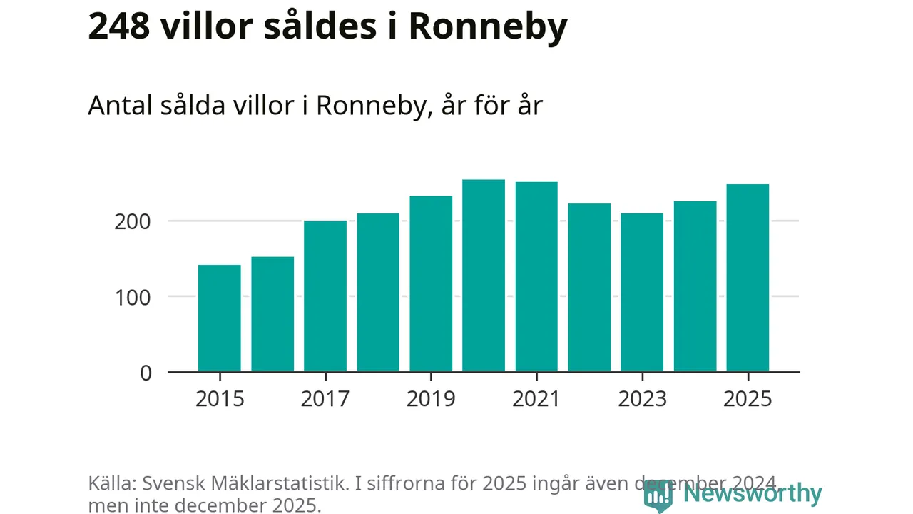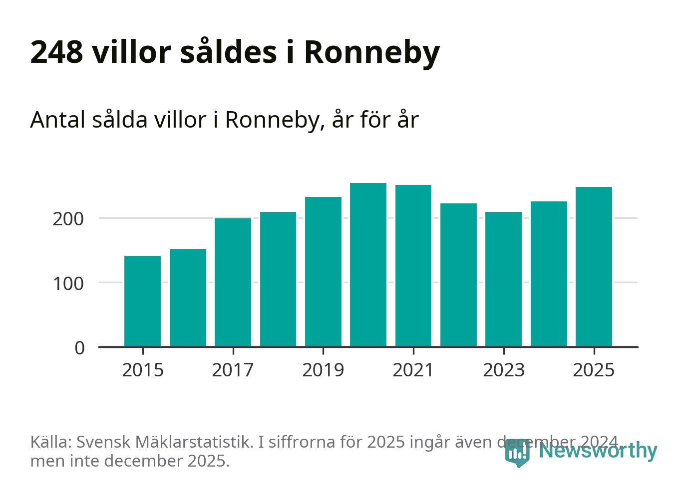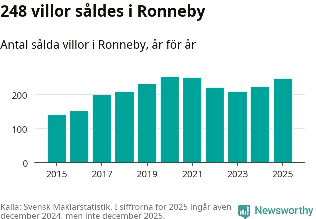 Däremot ökade antalet sålda villor. Totalt såldes 248 villor, att jämföra med 225 under 2024. Det är andra året i rad som antalet sålda villor ökar i kommunen.
