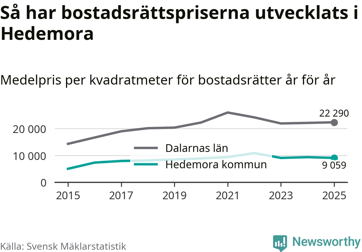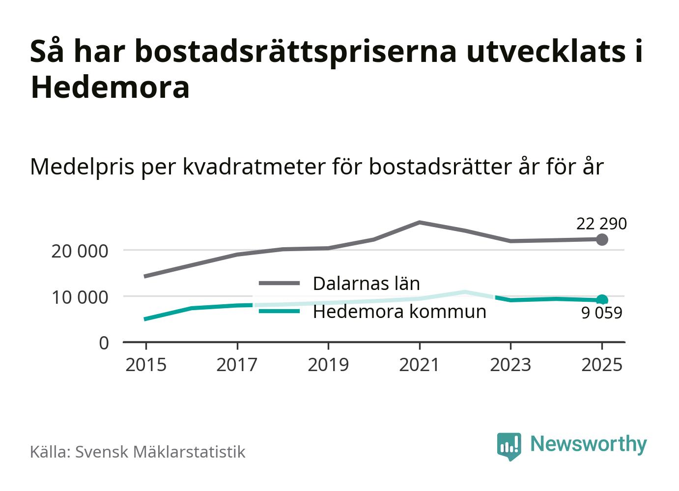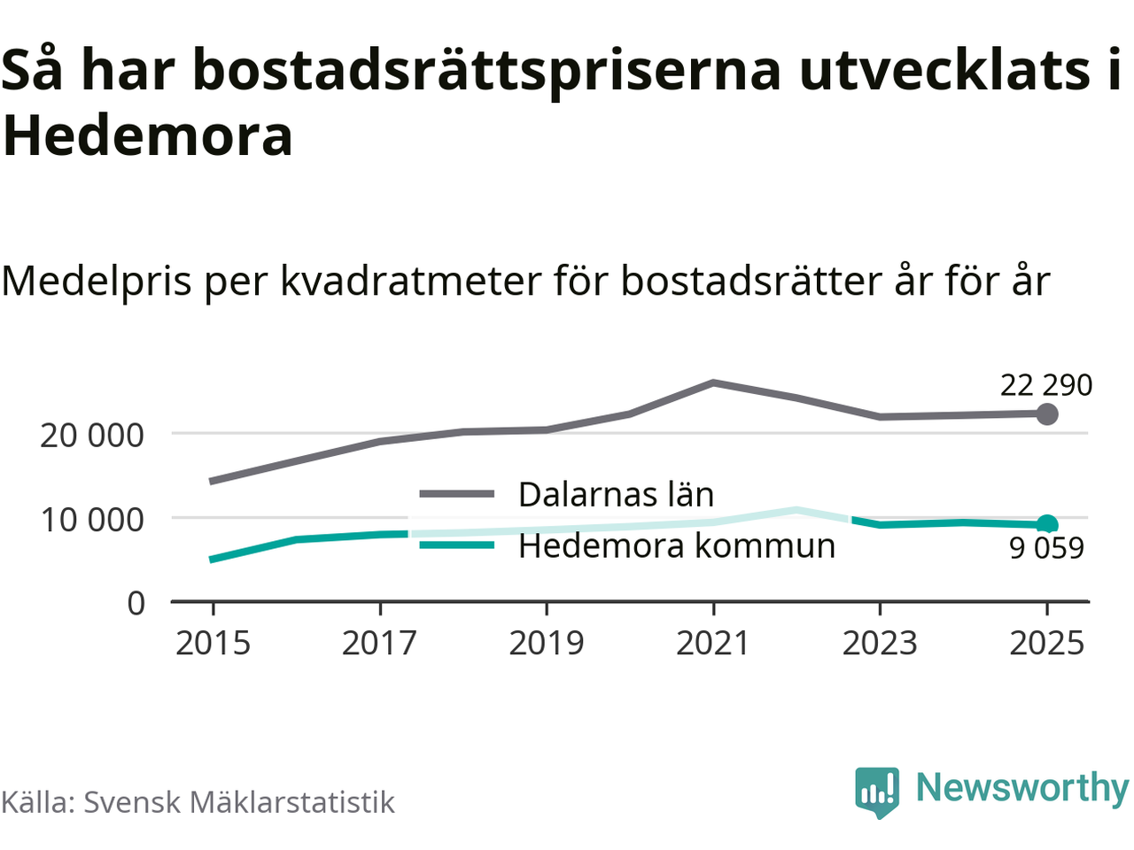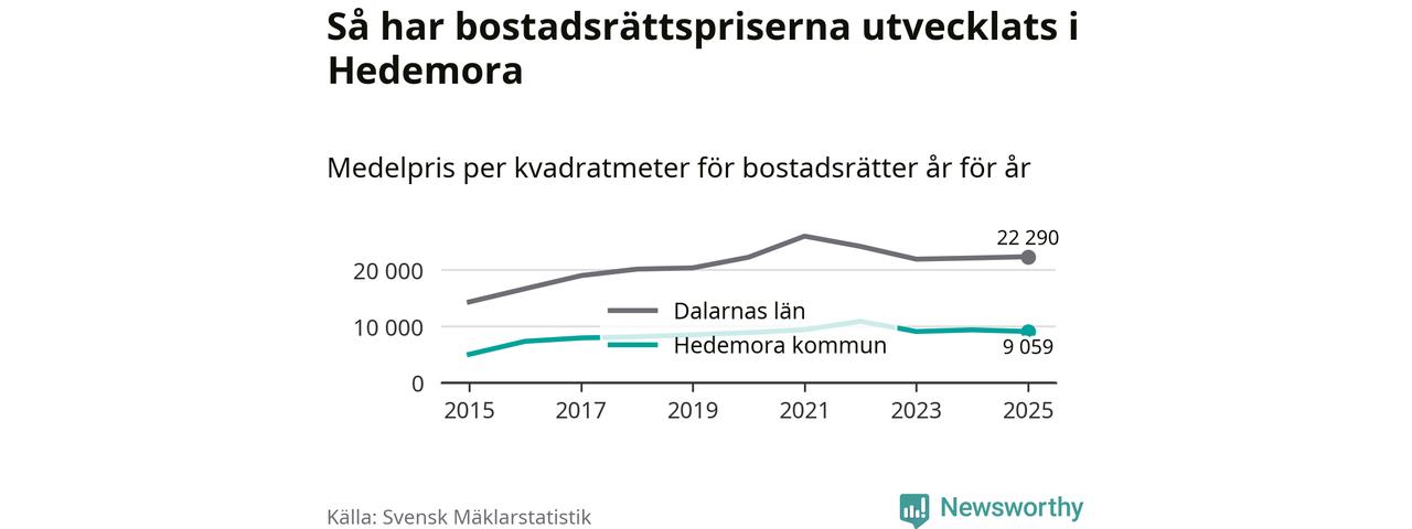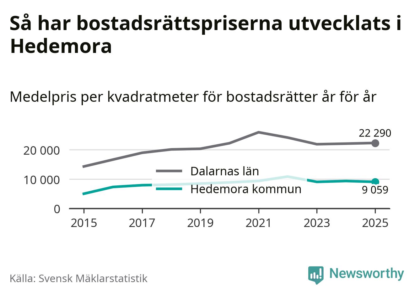 Det såldes totalt 71 bostadsrätter i Hedemora kommun under året. Genomsnittspriset per kvadratmeter landade på 9 059 kronor. Det är en minskning med tre procent i kommunen på ett år.