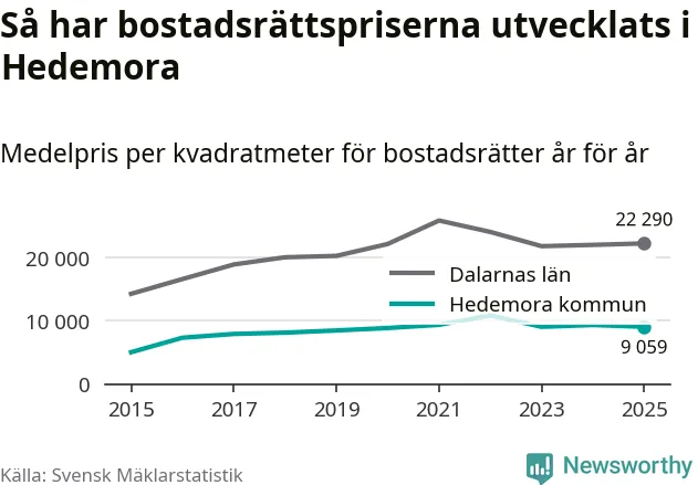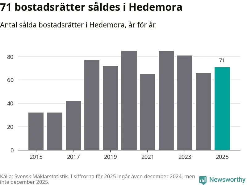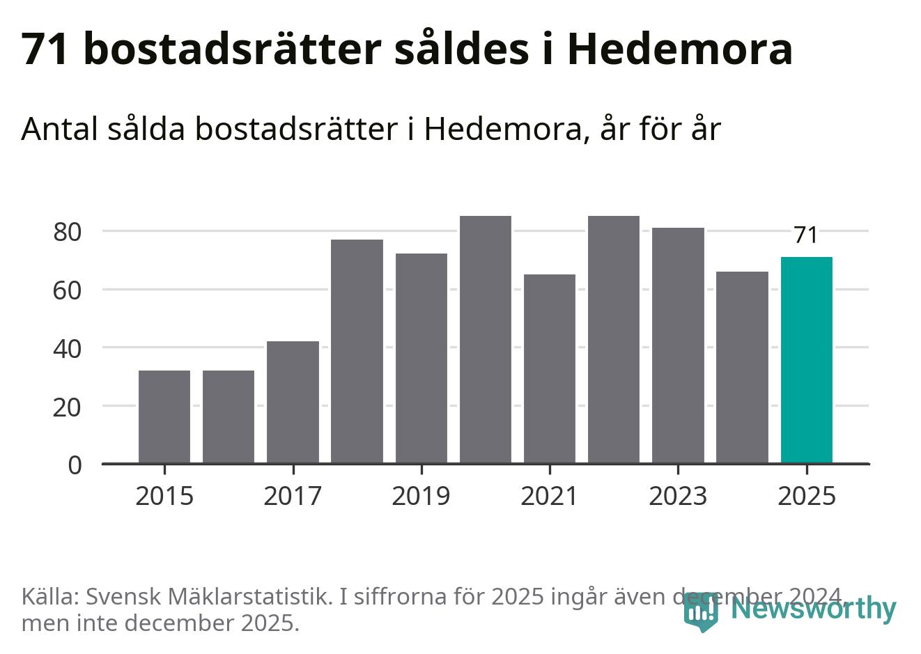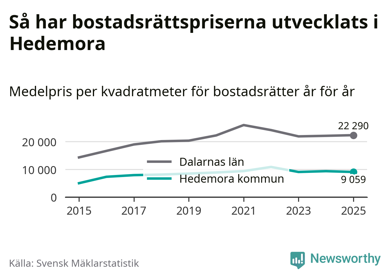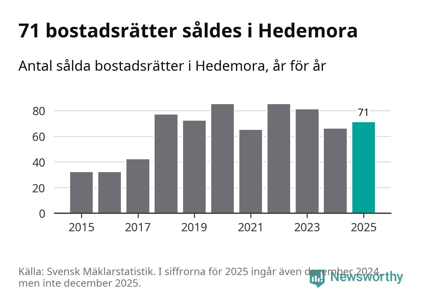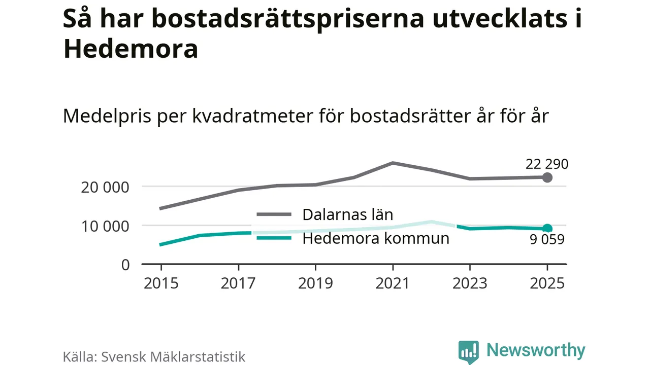 Det såldes totalt 71 bostadsrätter i Hedemora kommun under året. Genomsnittspriset per kvadratmeter landade på 9 059 kronor. Det är en minskning med tre procent i kommunen på ett år.