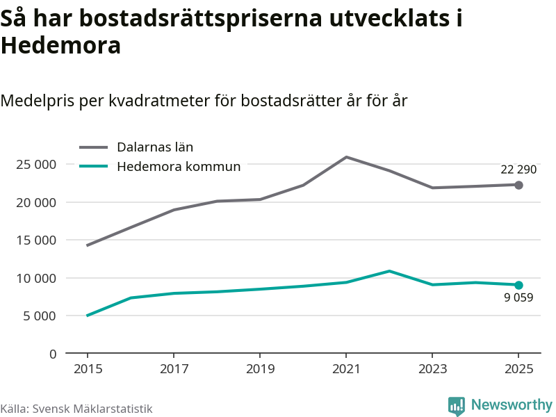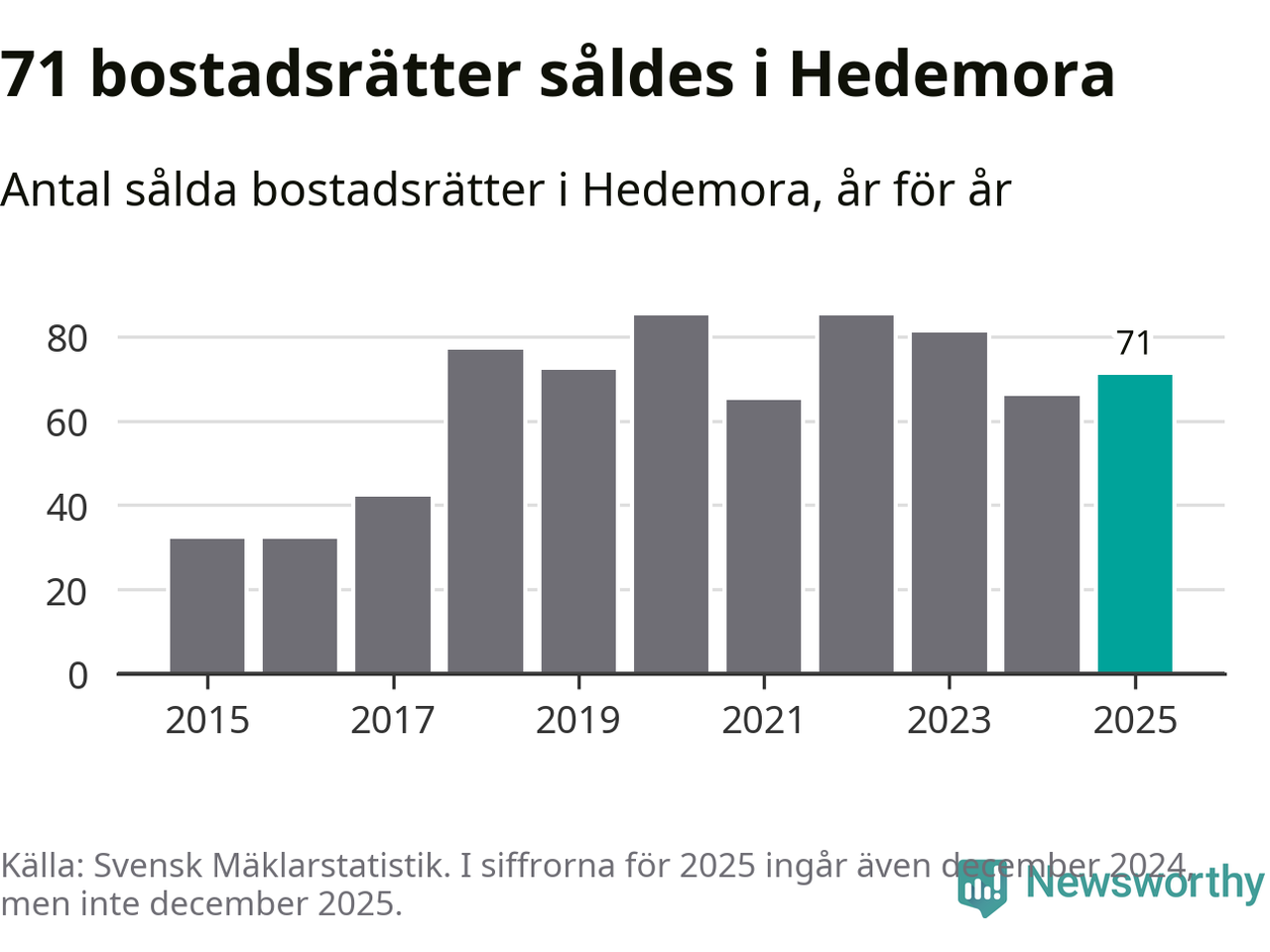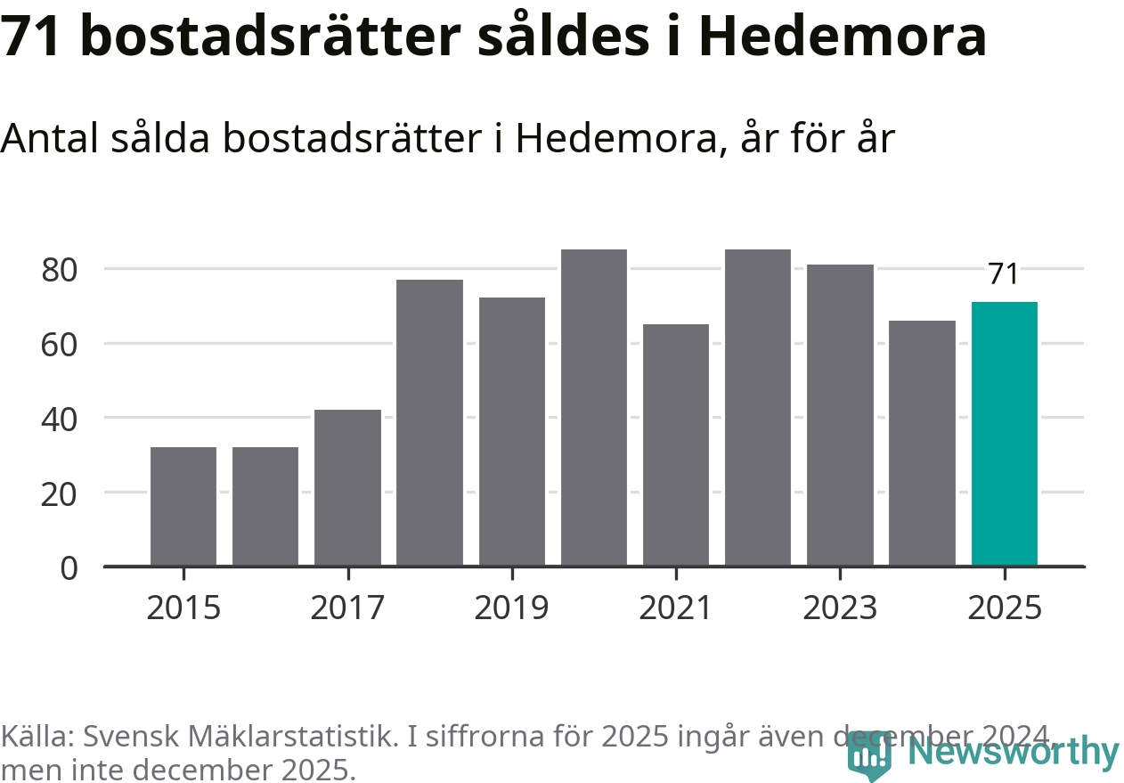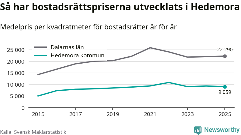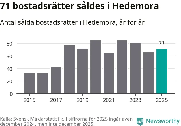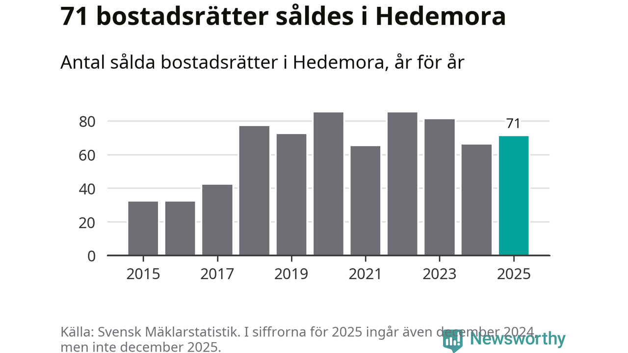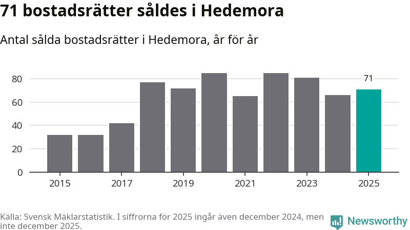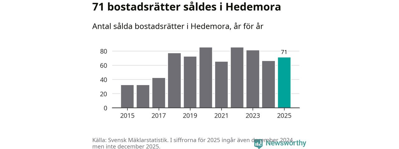 Det såldes totalt 71 bostadsrätter i Hedemora kommun under året. Genomsnittspriset per kvadratmeter landade på 9 059 kronor. Det är en minskning med tre procent i kommunen på ett år.