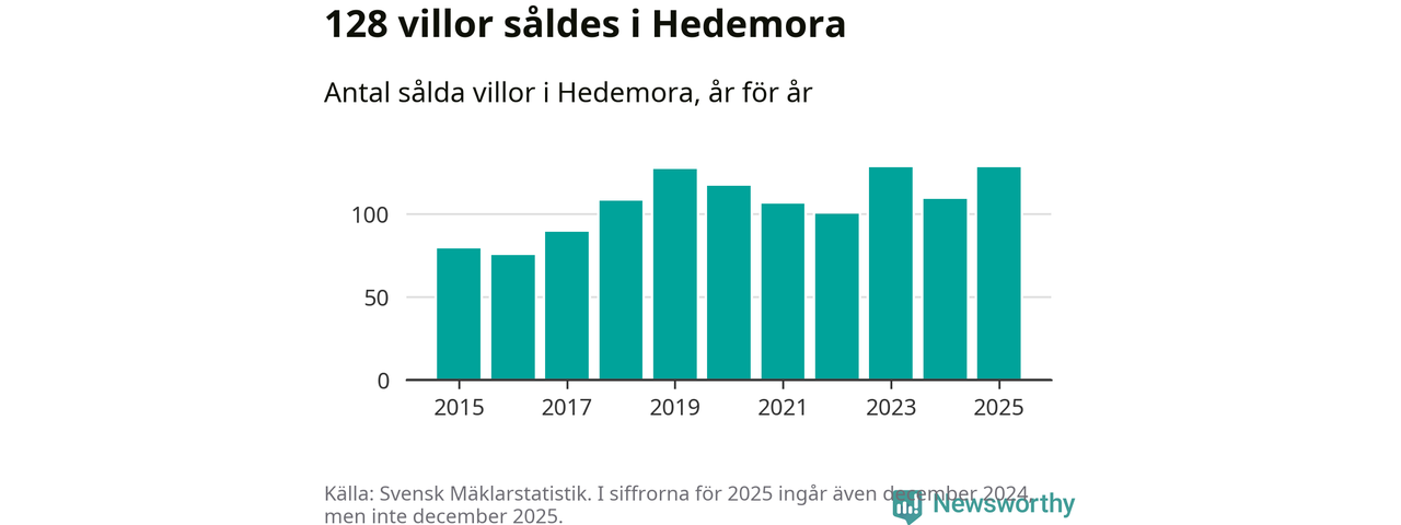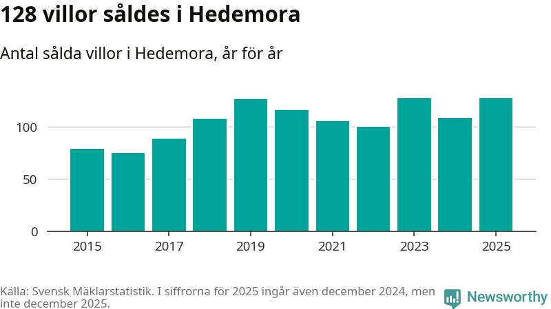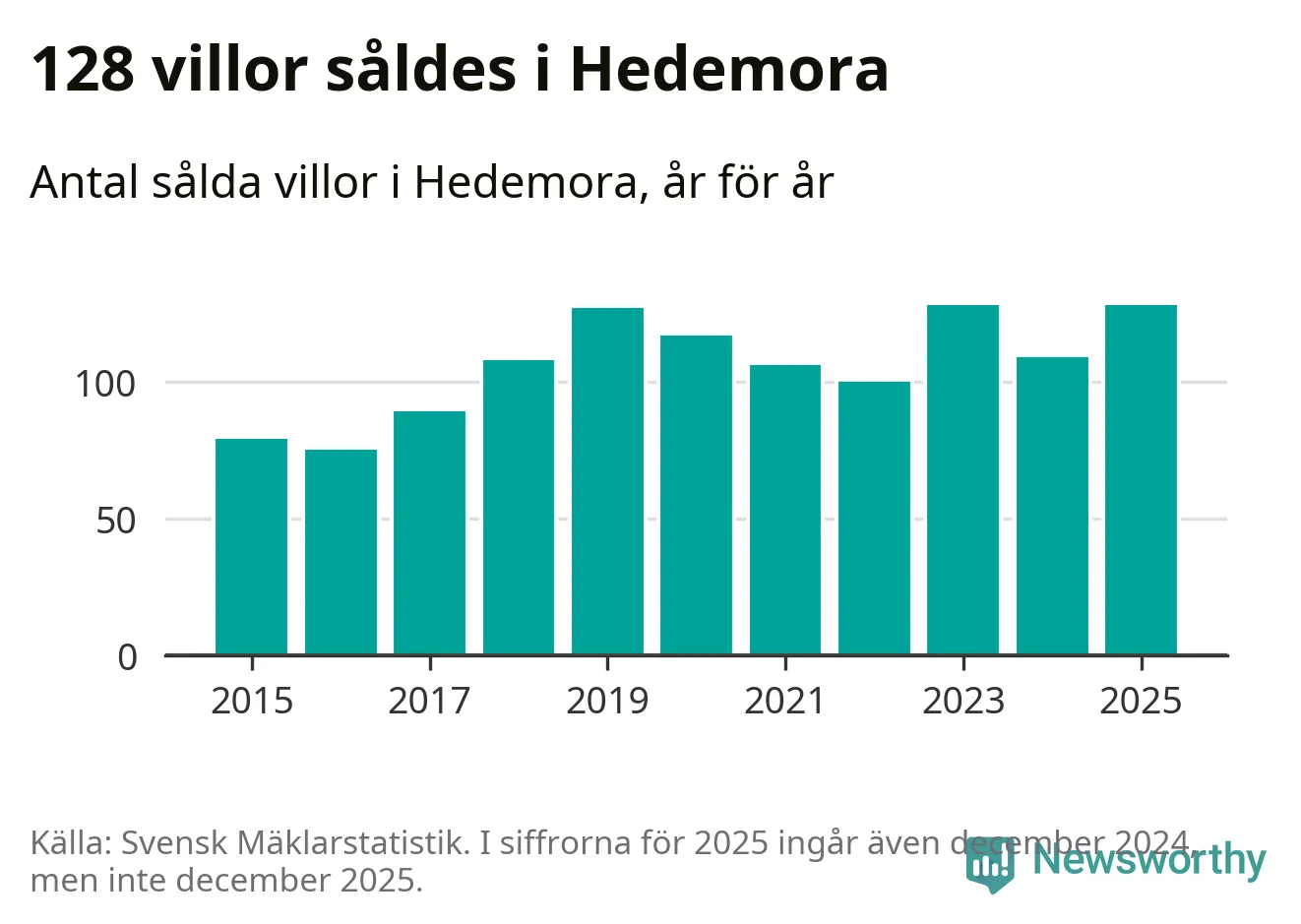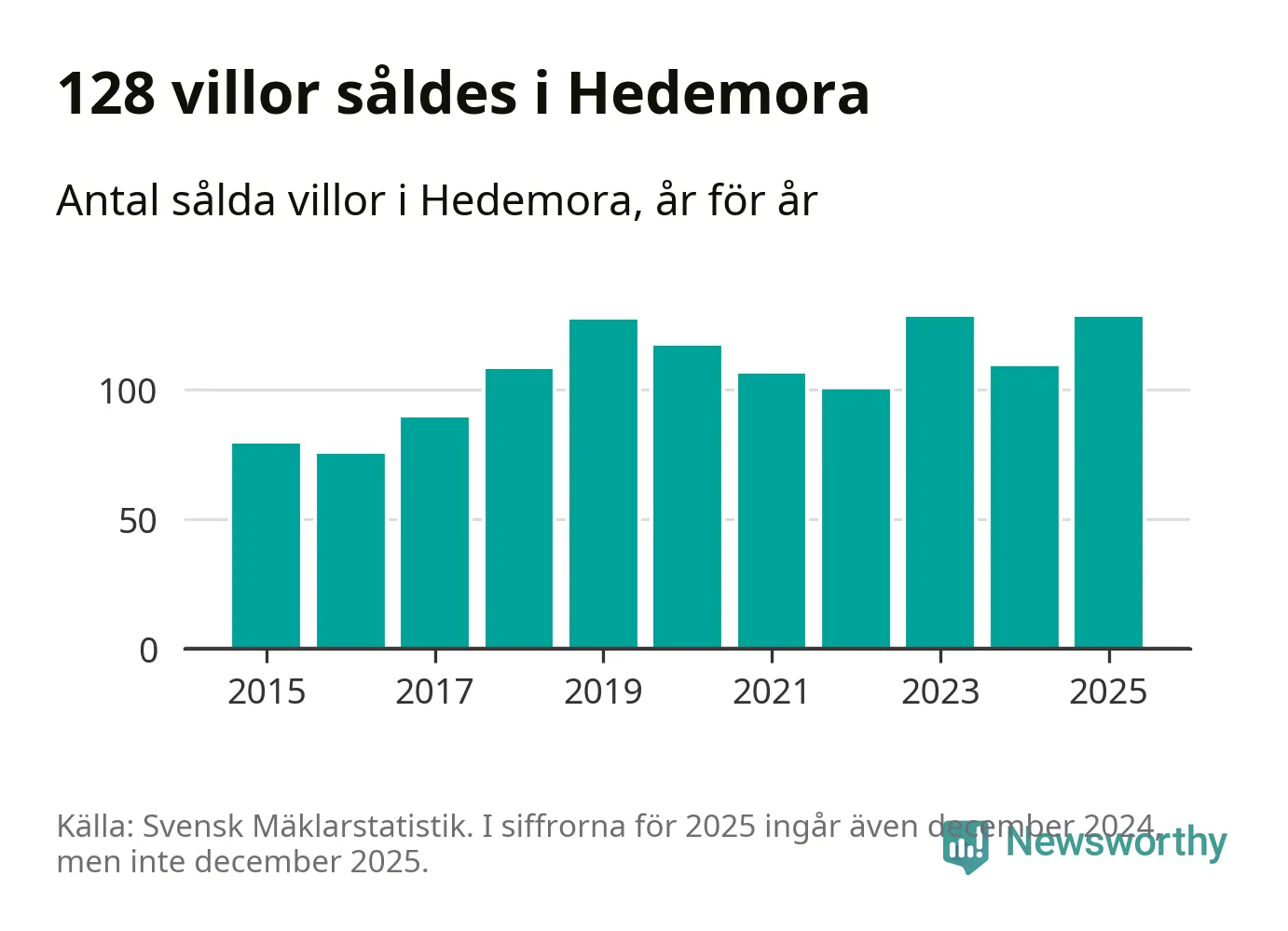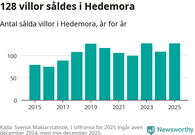 Däremot ökade antalet sålda villor. Totalt såldes 128 villor, att jämföra med 109 under 2024.