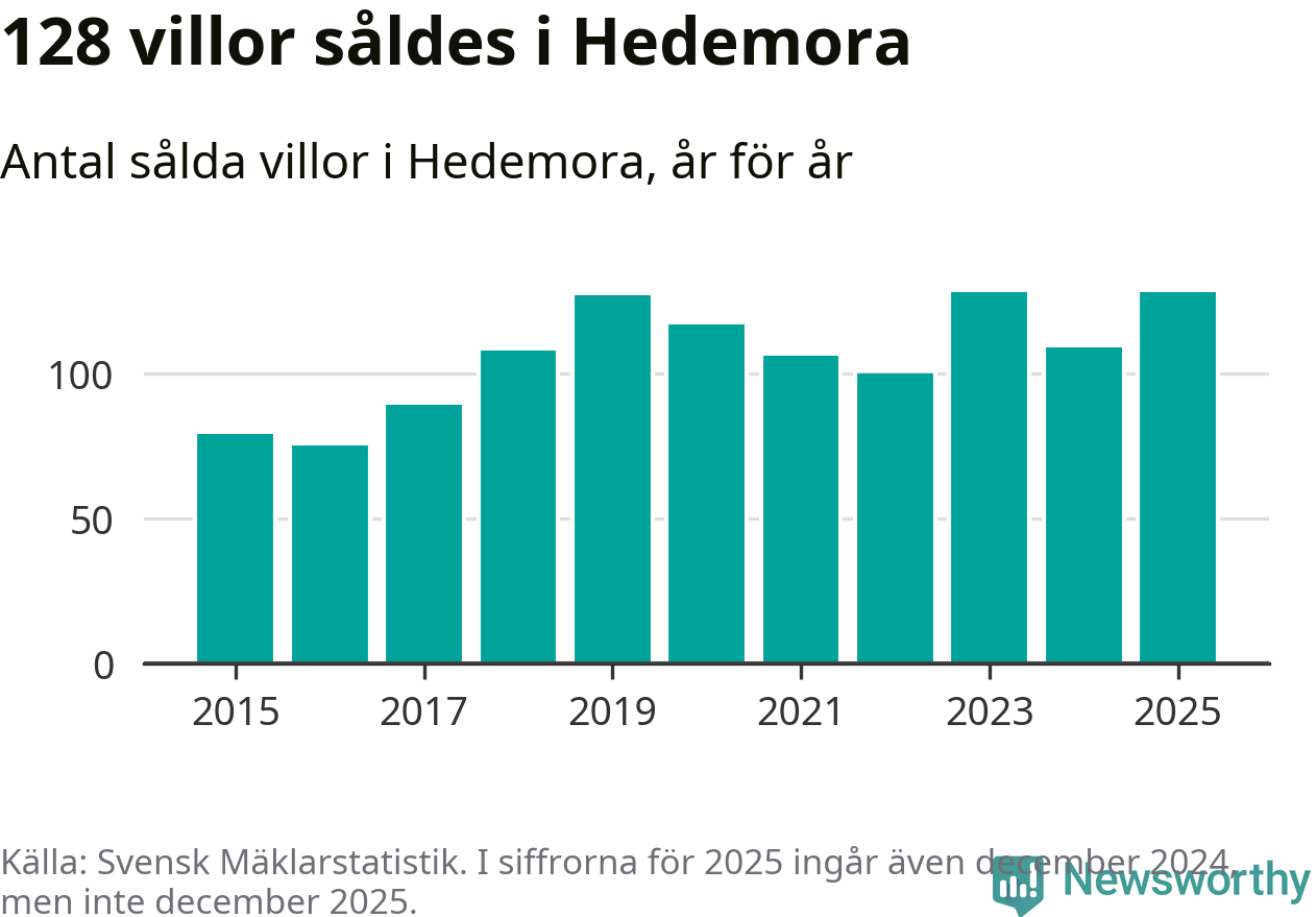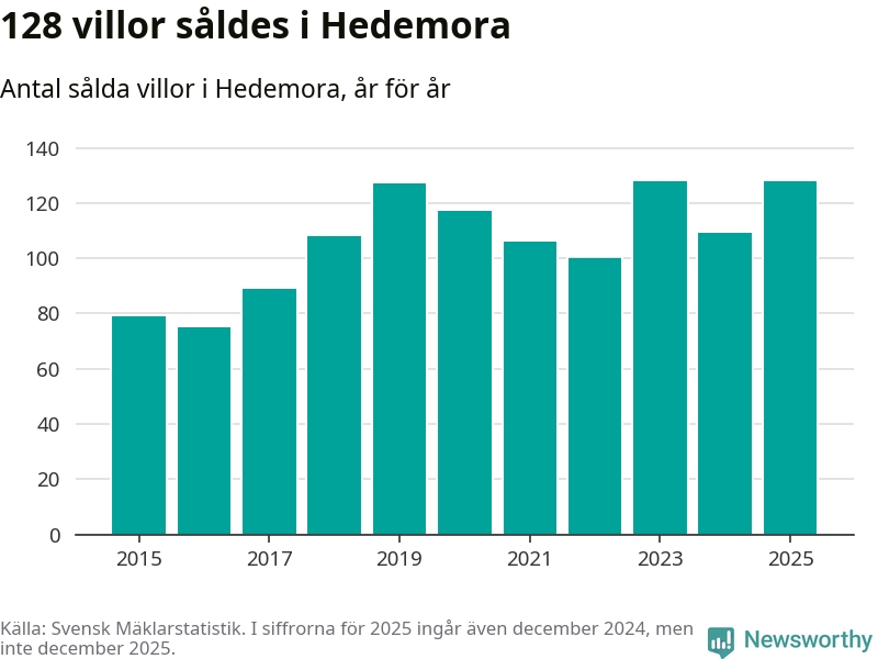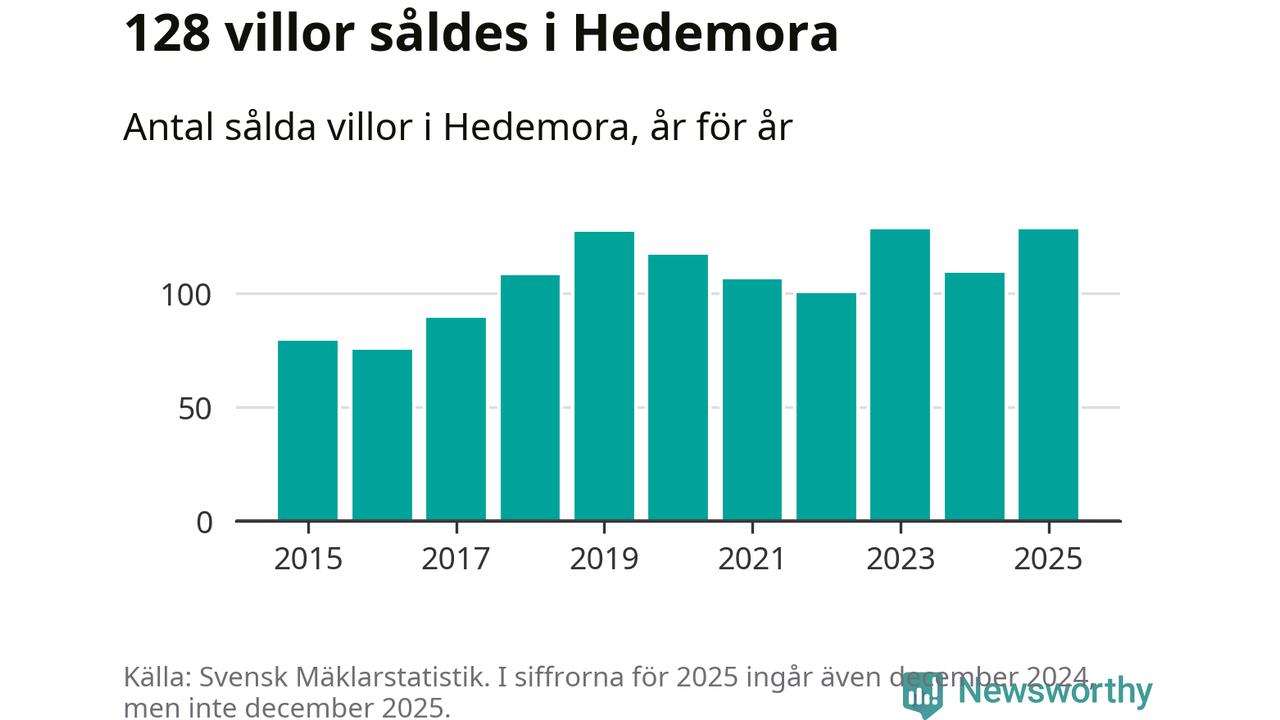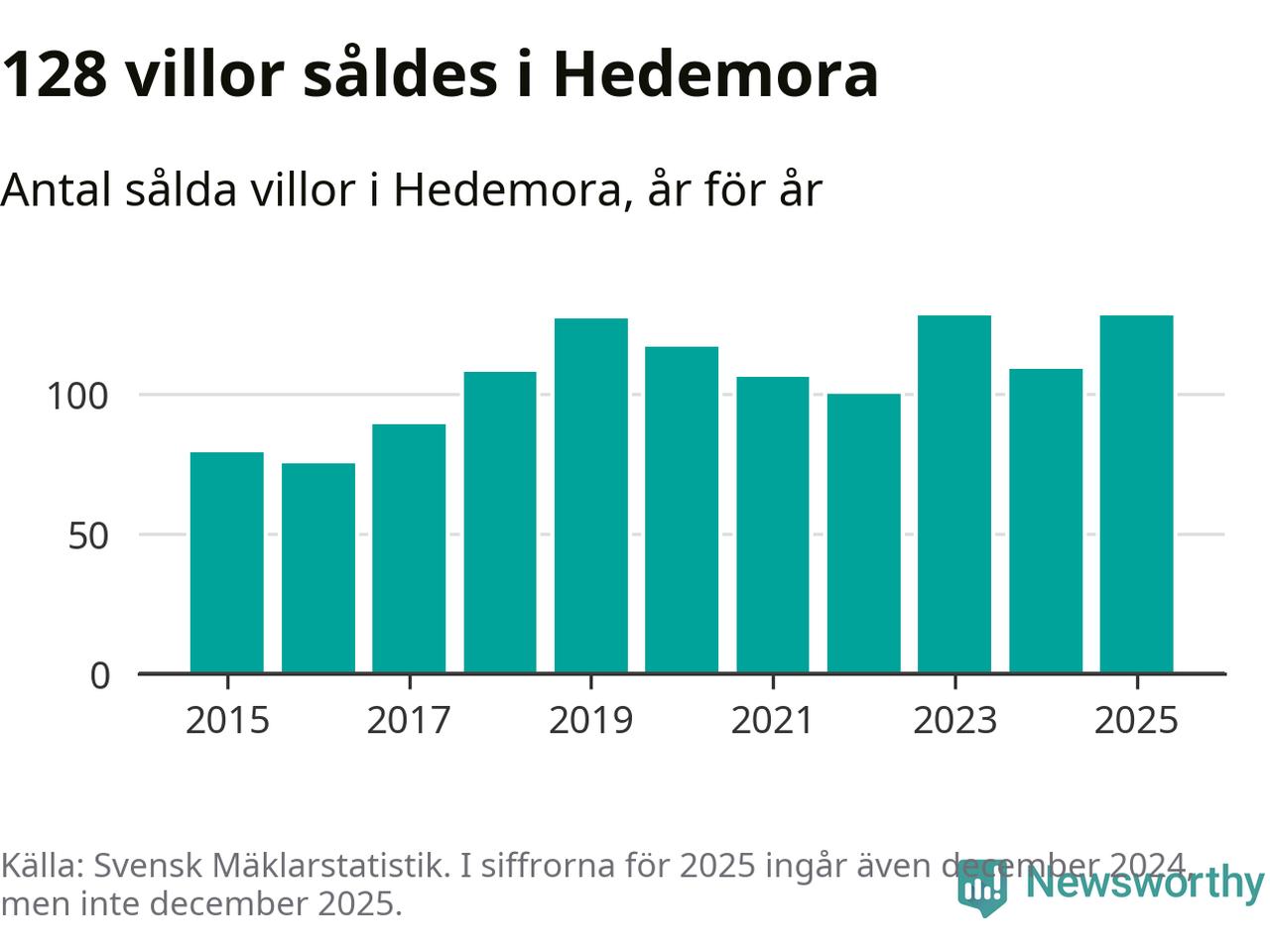 Däremot ökade antalet sålda villor. Totalt såldes 128 villor, att jämföra med 109 under 2024.