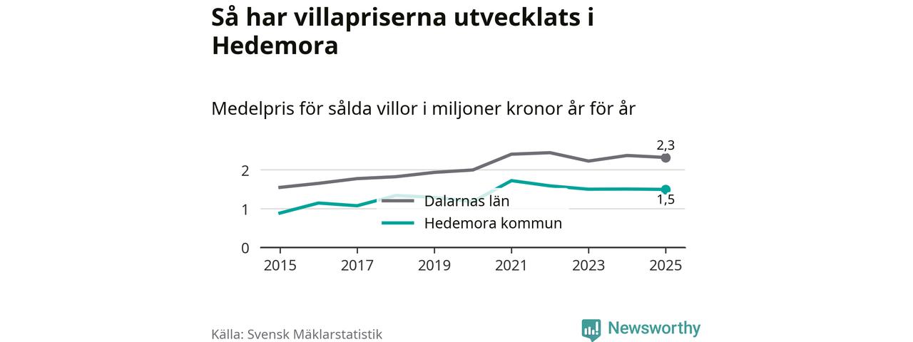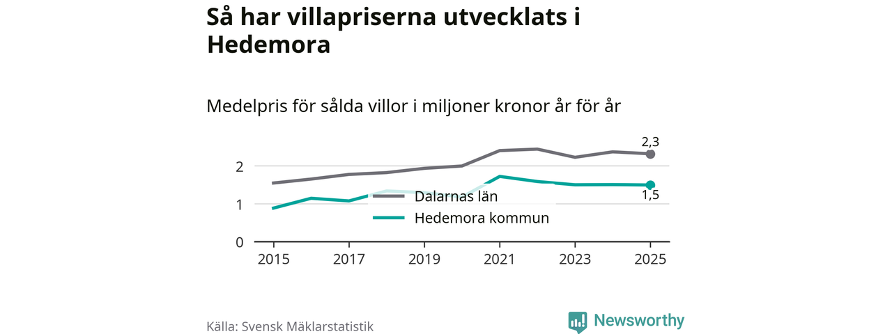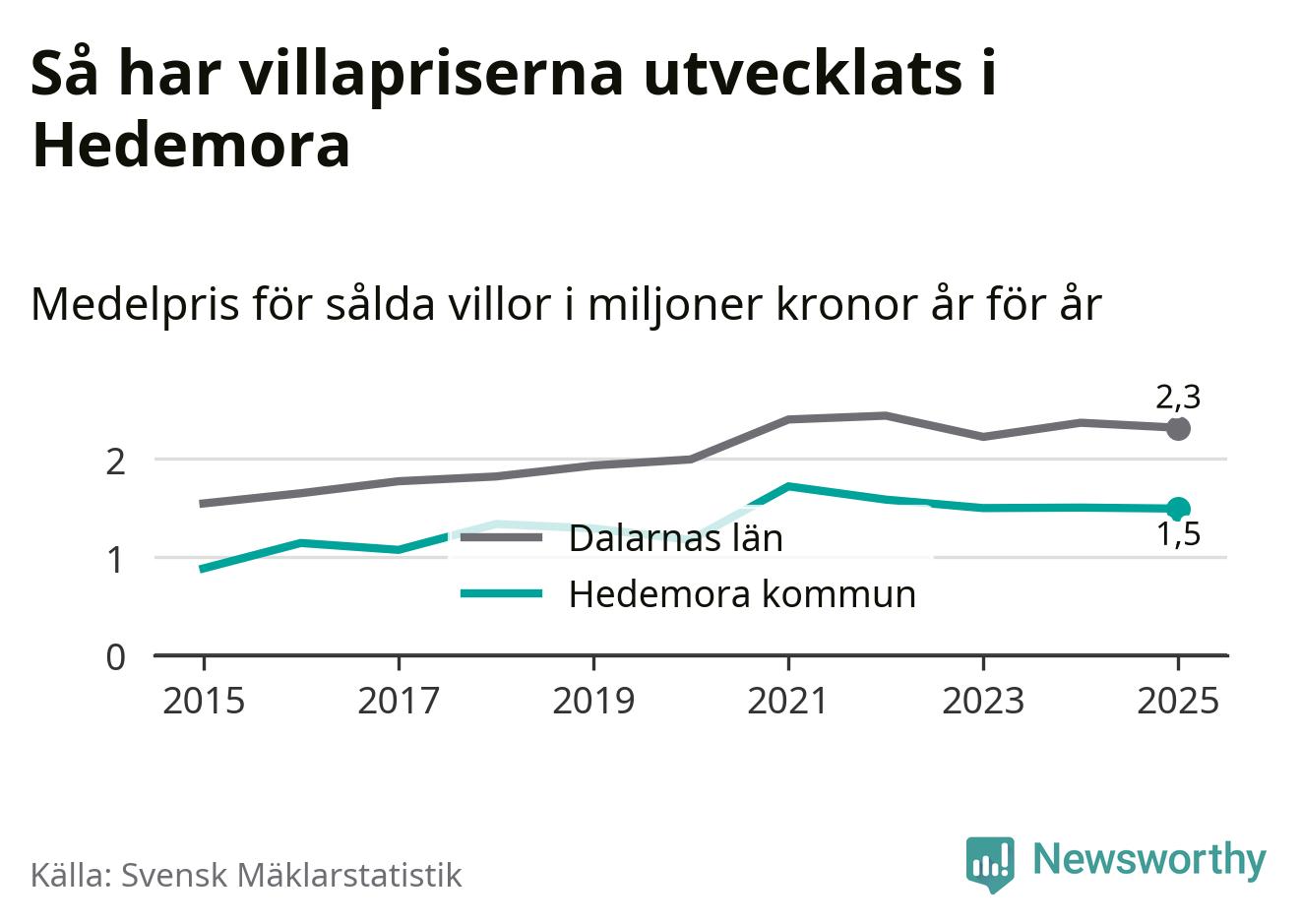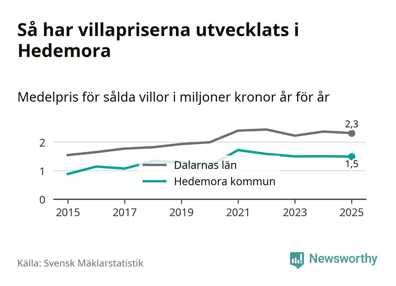 1,5 miljoner kronor är medelpriset för de villor som såldes i Hedemora kommun under året, eller 13 917 kronor per kvadratmeter. Det innebär att priserna har legat i stort sett stilla sedan förra året.