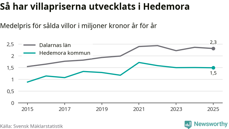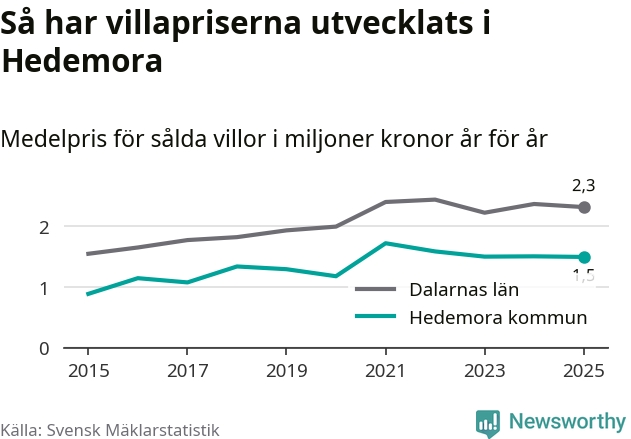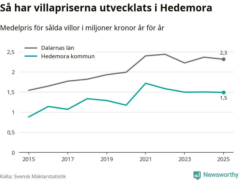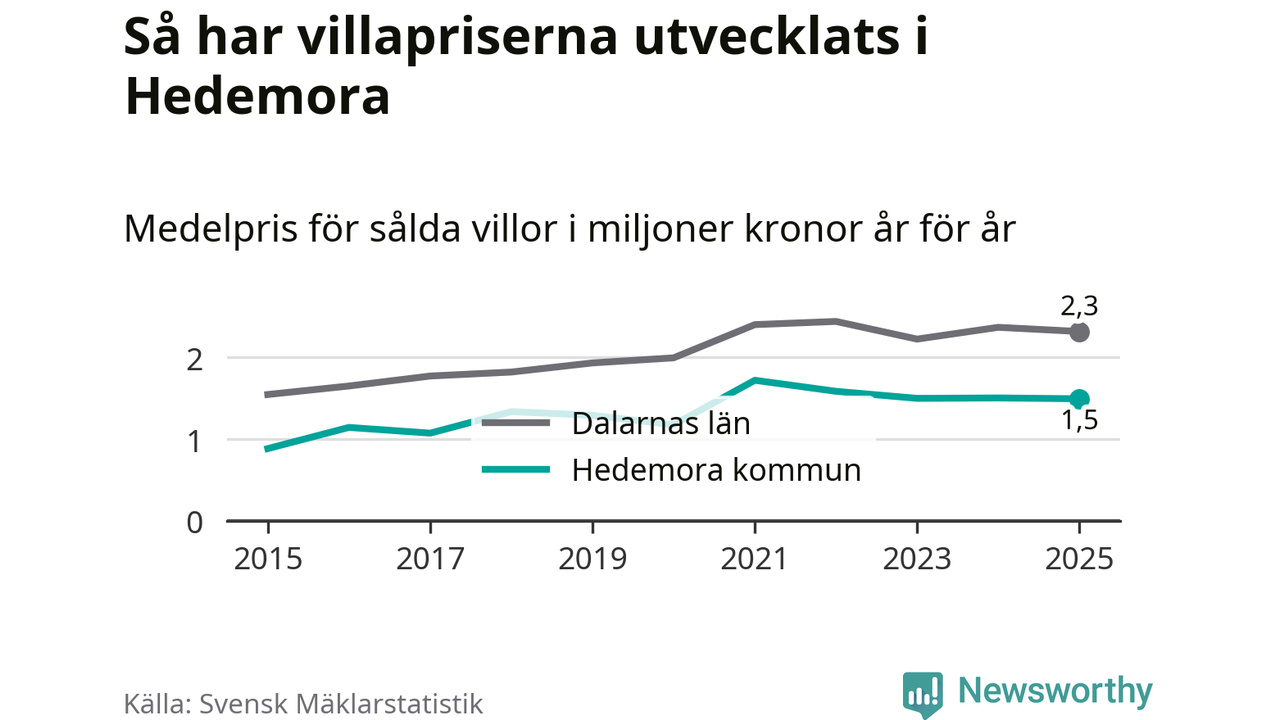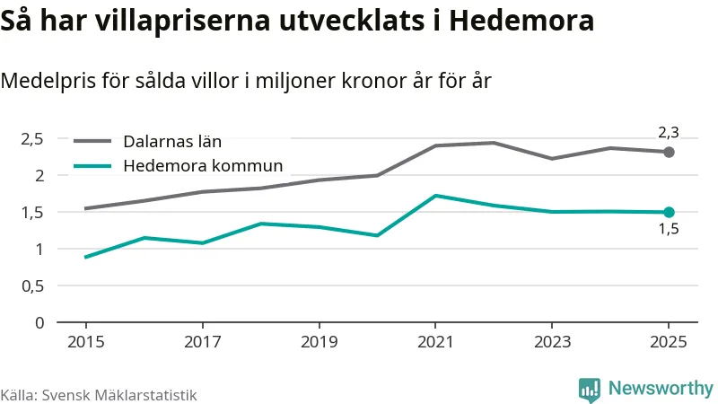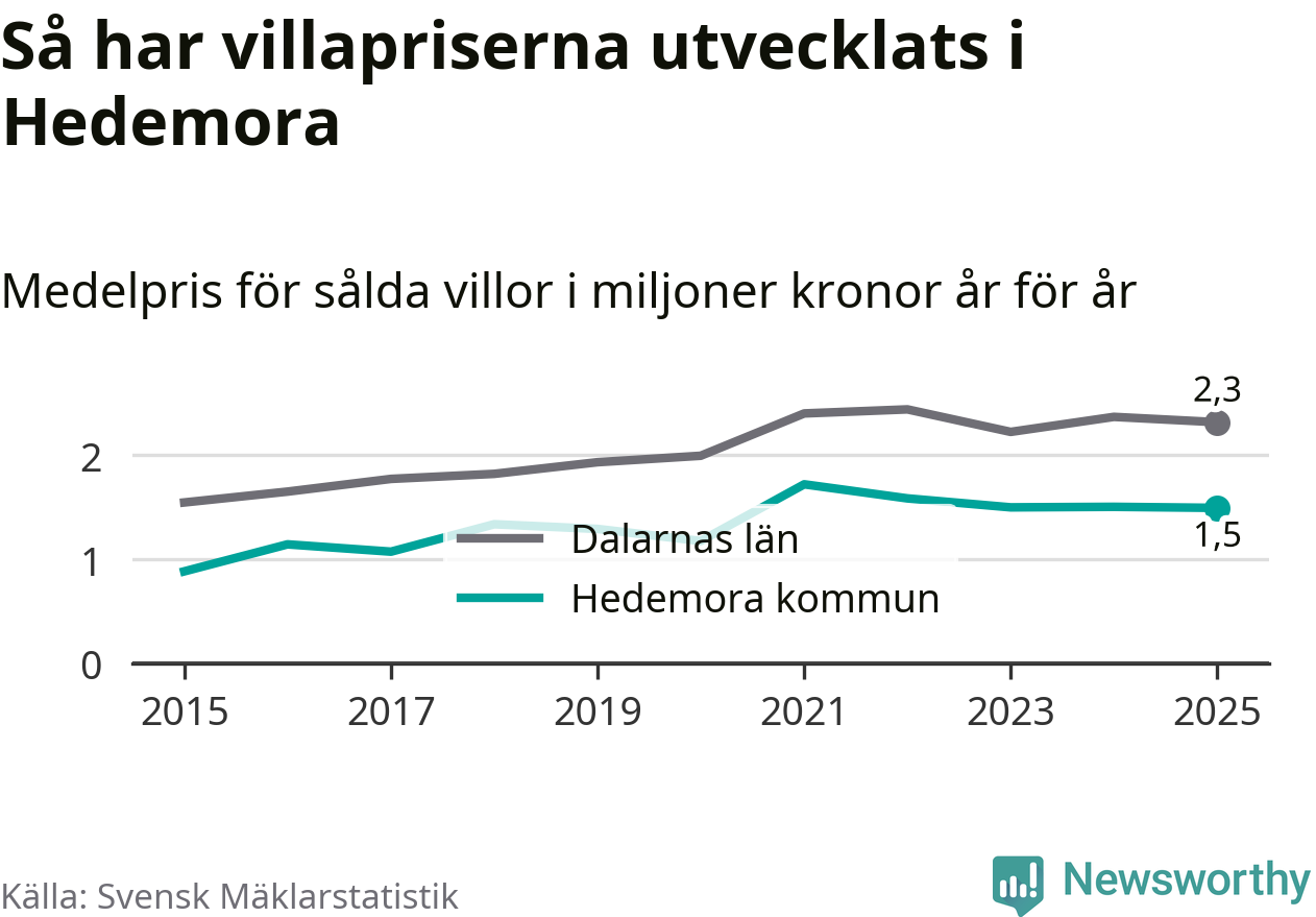 1,5 miljoner kronor är medelpriset för de villor som såldes i Hedemora kommun under året, eller 13 917 kronor per kvadratmeter. Det innebär att priserna har legat i stort sett stilla sedan förra året.