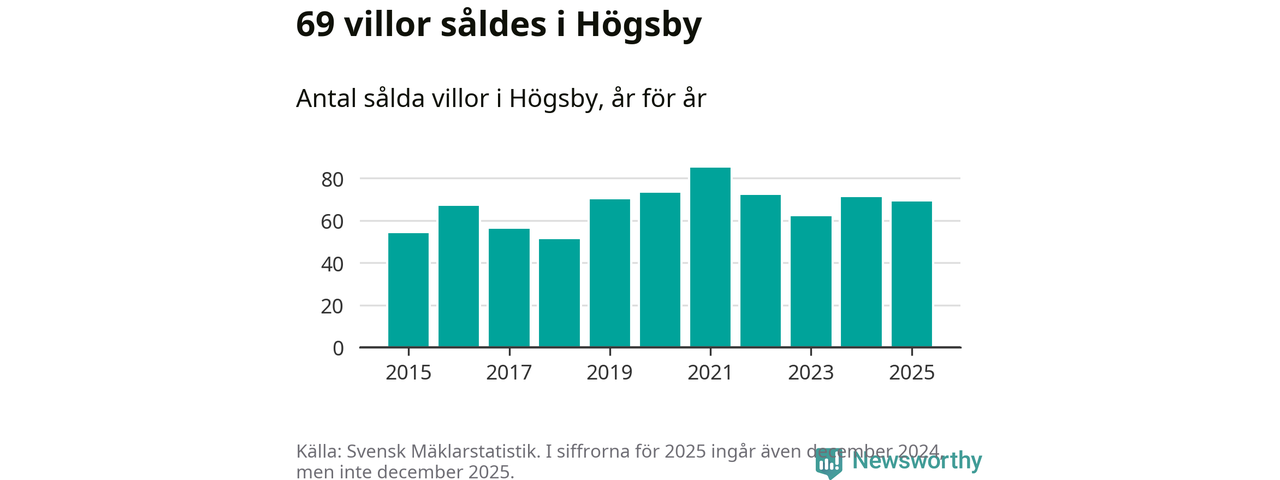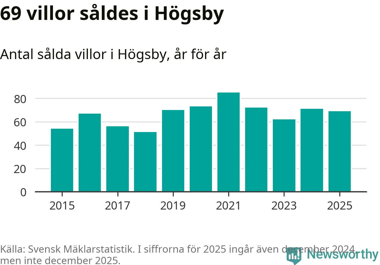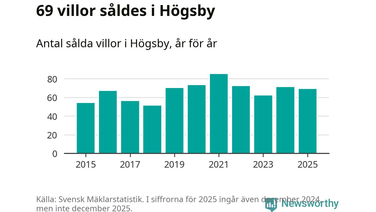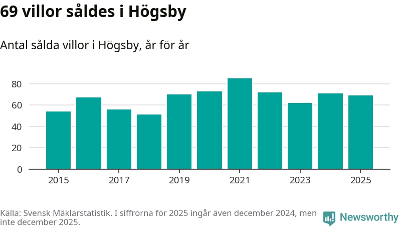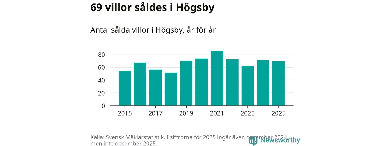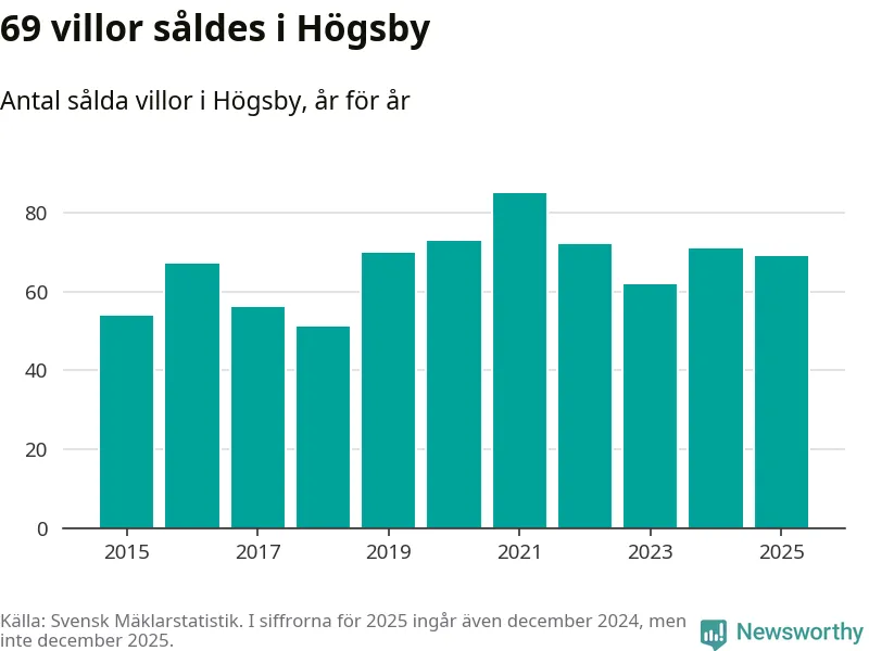 Antalet sålda villor minskade också något. Totalt såldes 69 villor, att jämföra med 71 under 2024.