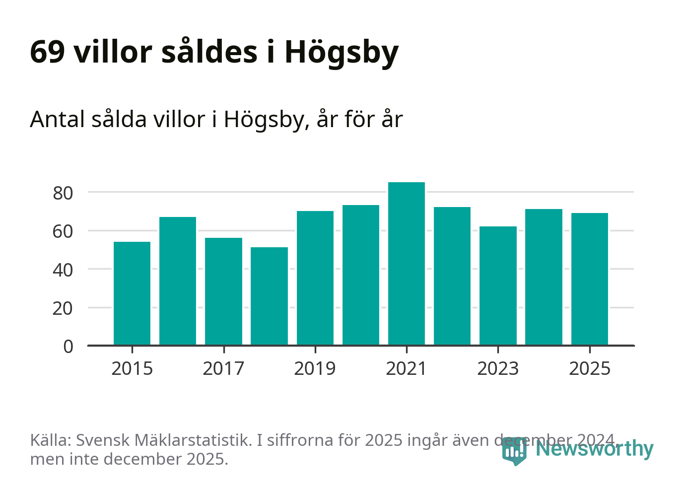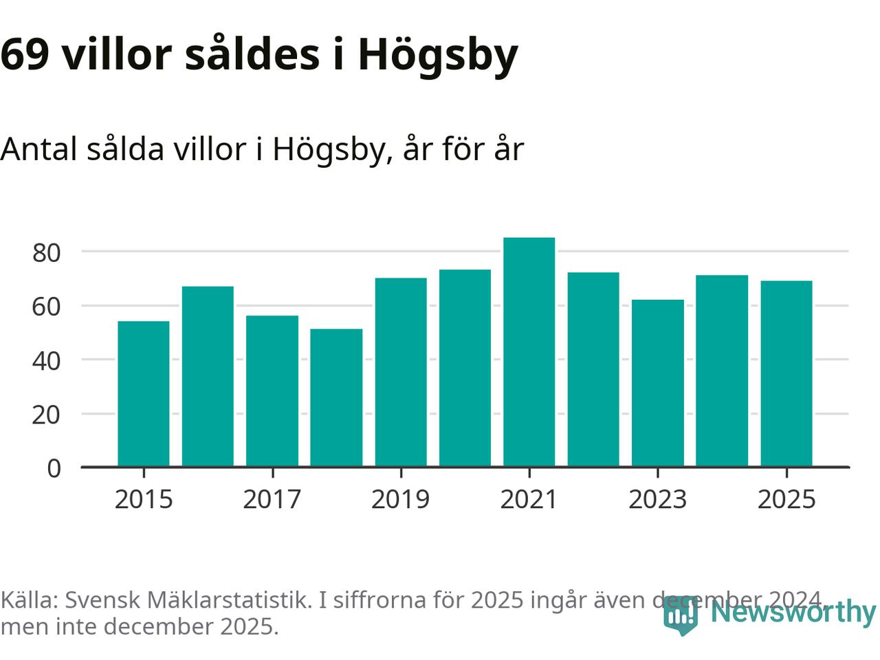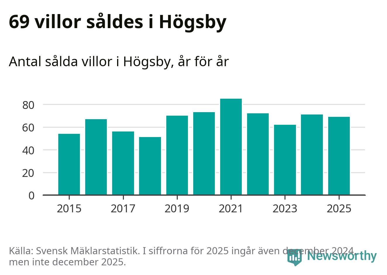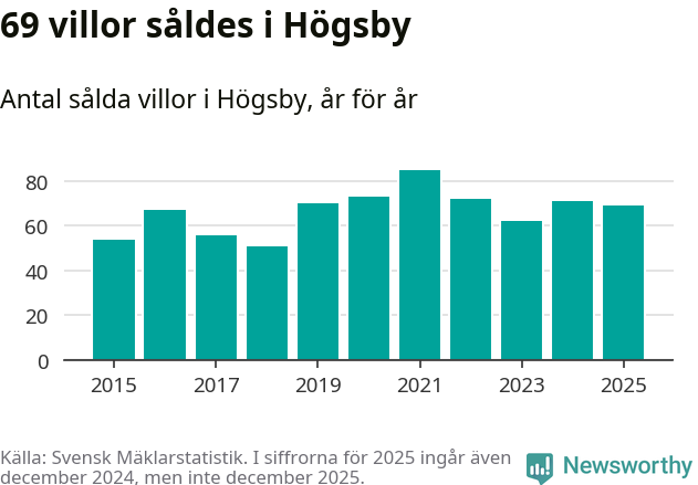 Antalet sålda villor minskade också något. Totalt såldes 69 villor, att jämföra med 71 under 2024.