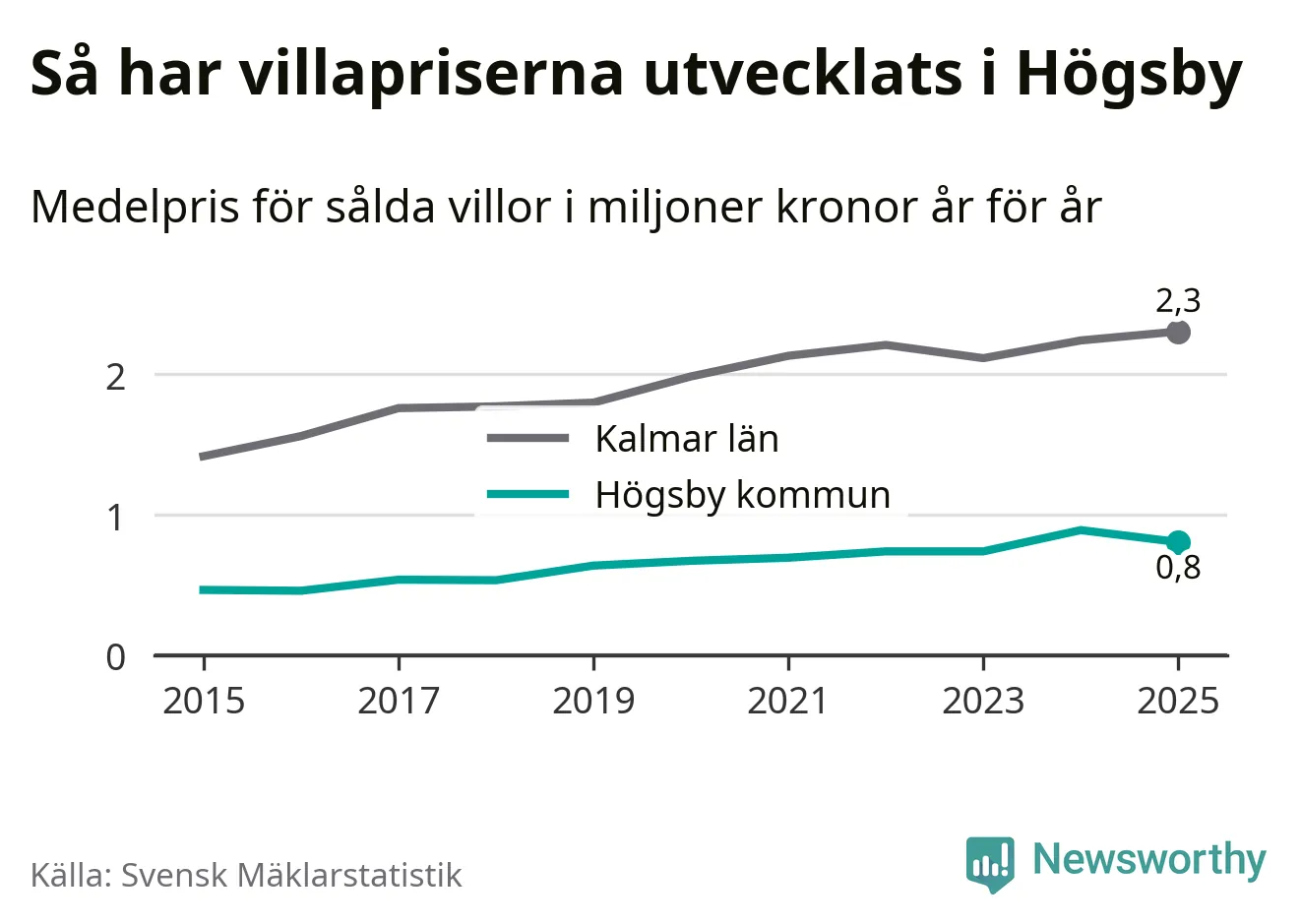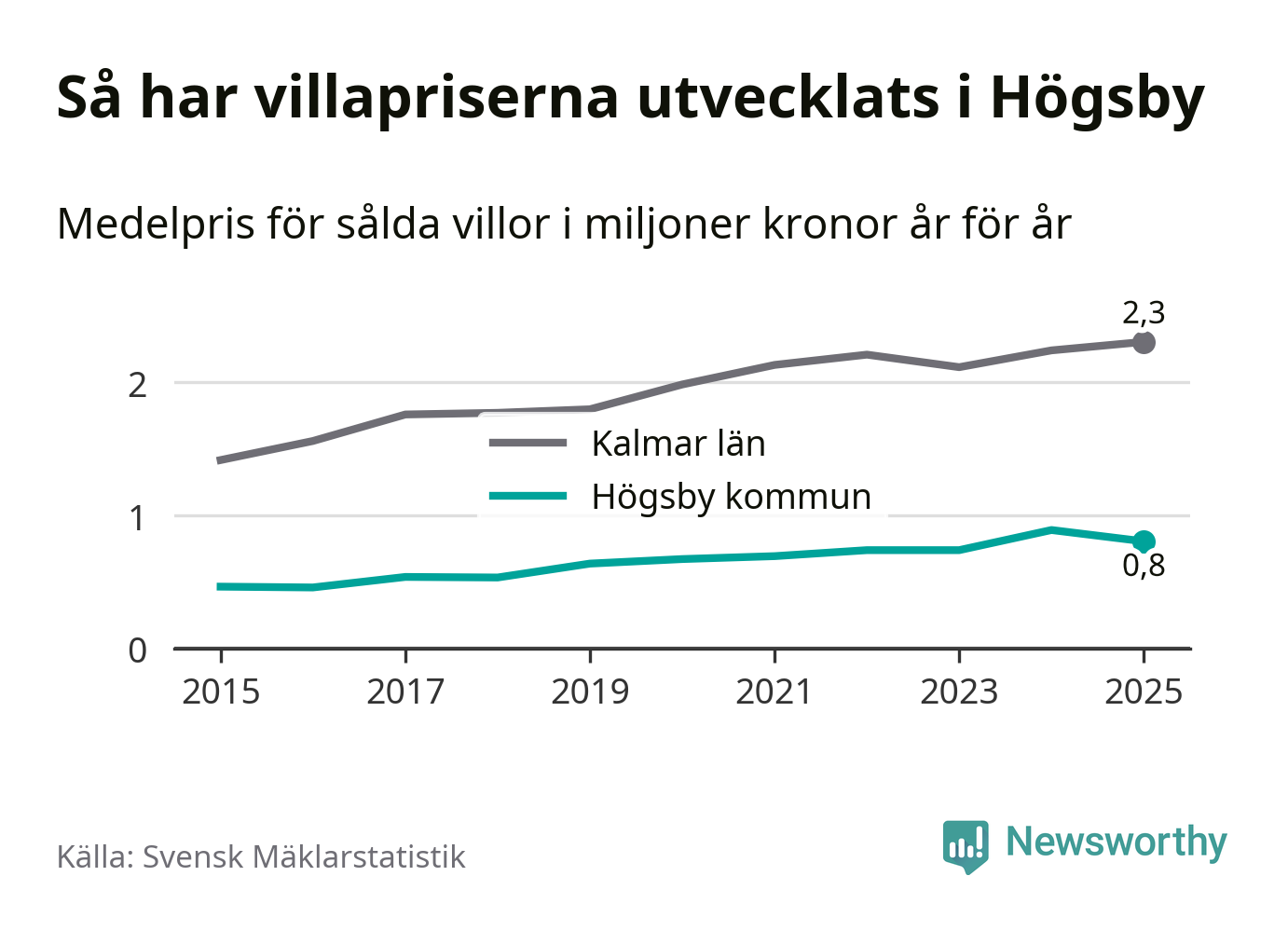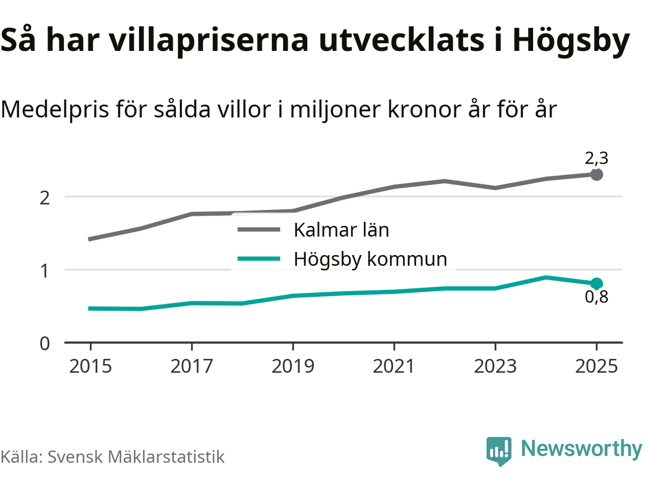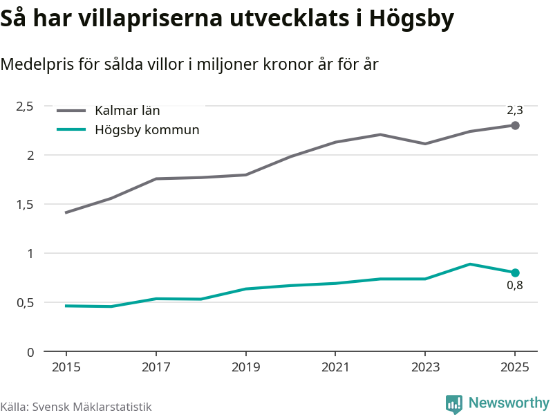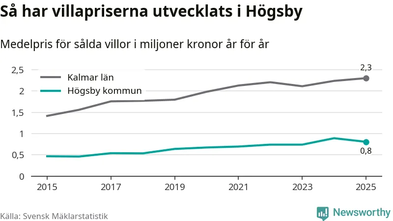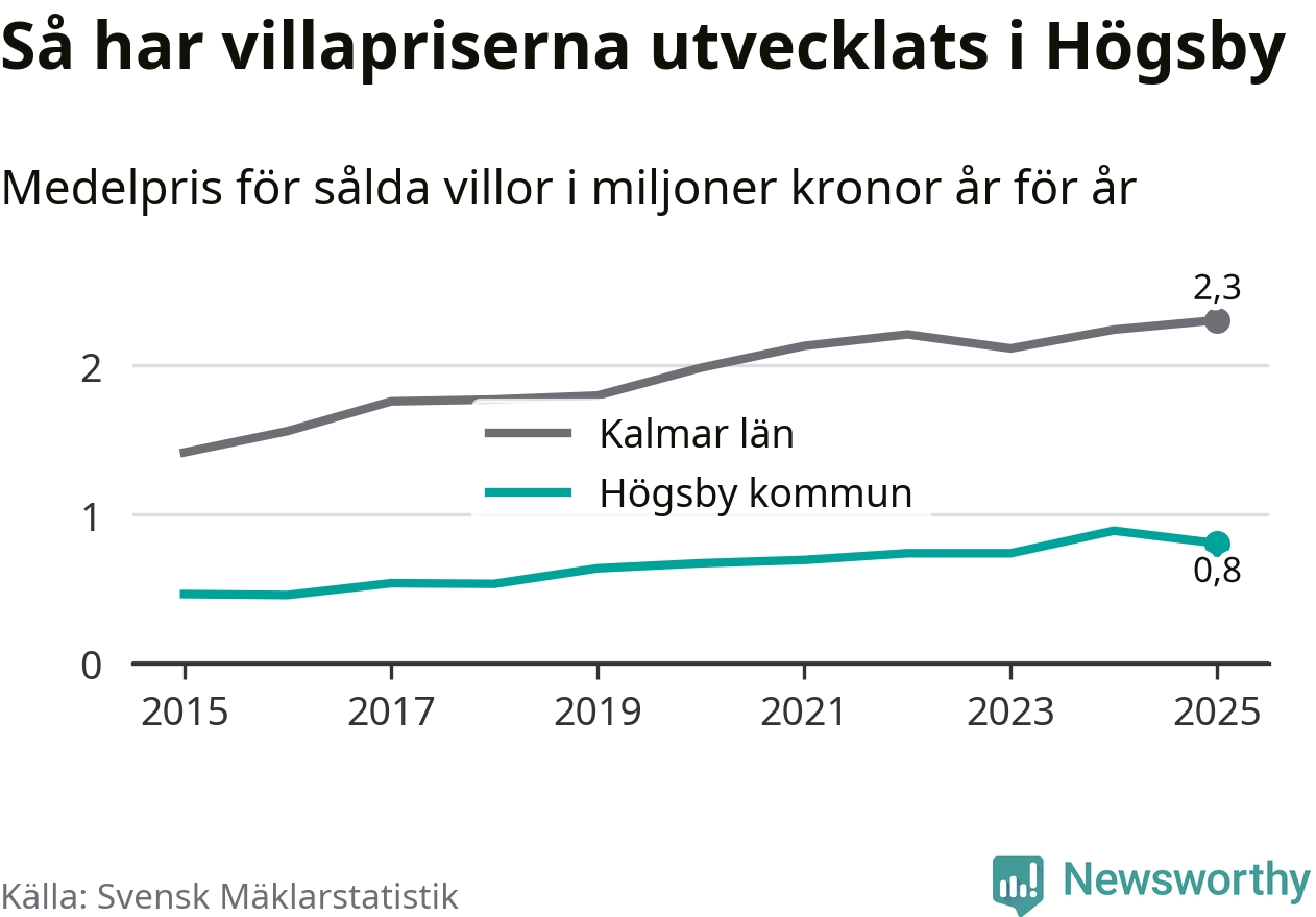 805 000 kronor är medelpriset för de villor som såldes i Högsby kommun under året, eller 7 549 kronor per kvadratmeter. Det innebär en prisminskning med tio procent på ett år.