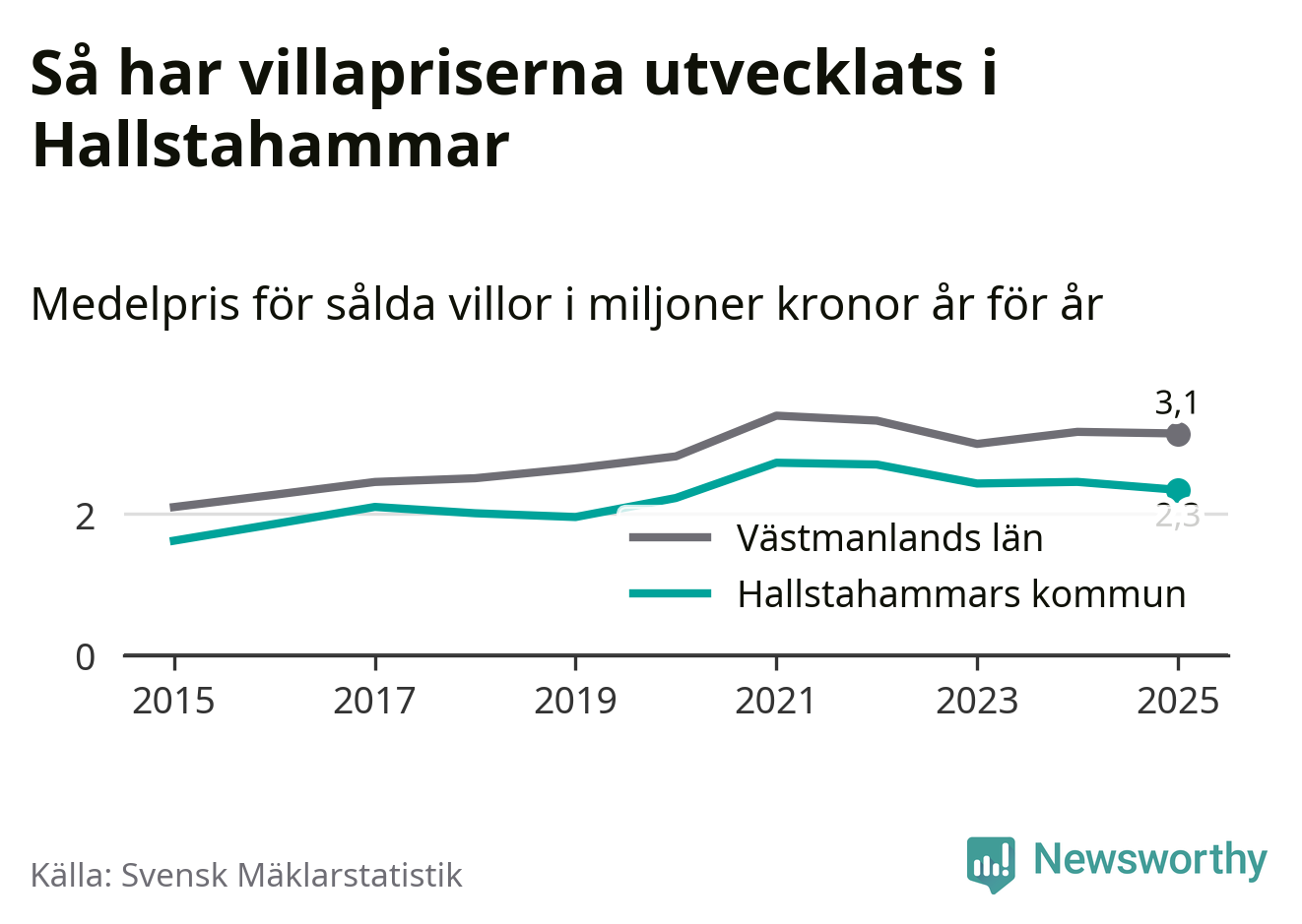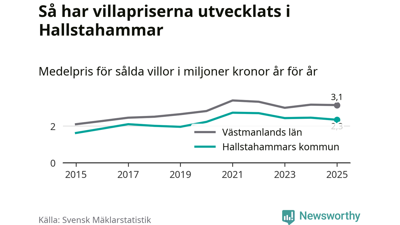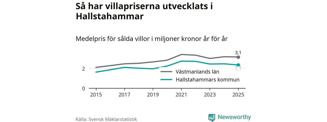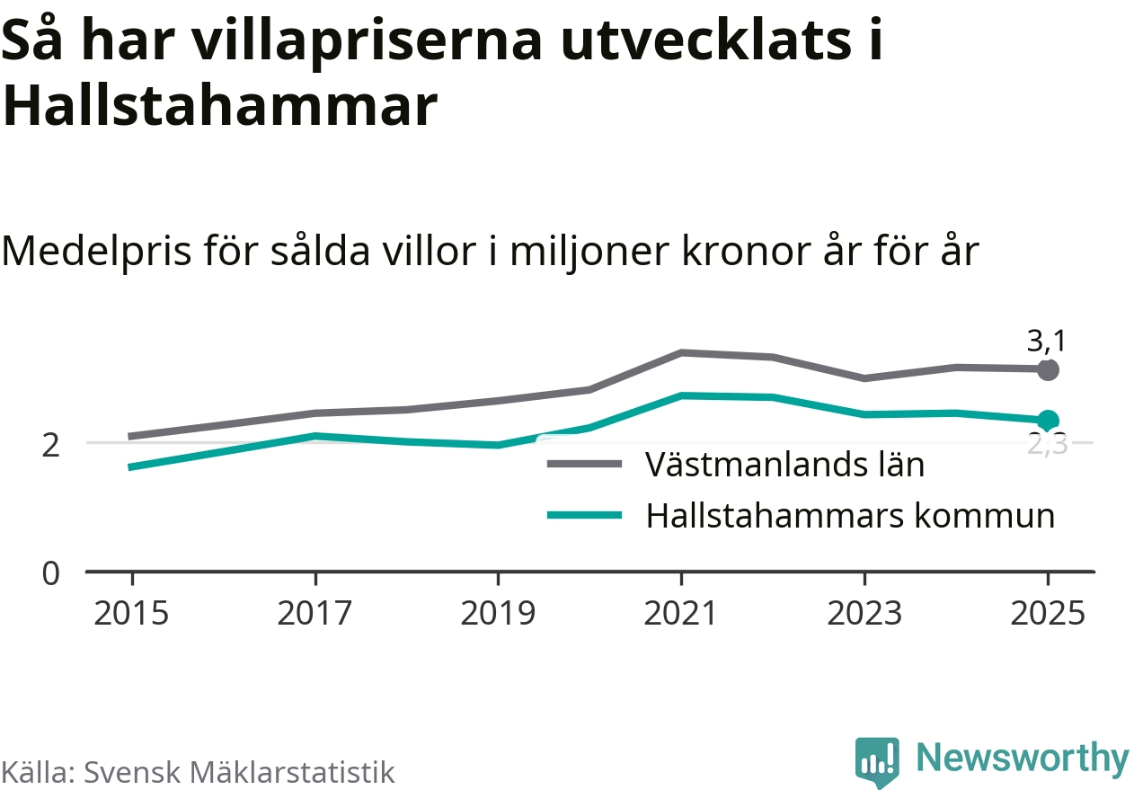 2,3 miljoner kronor är medelpriset för de villor som såldes i Hallstahammars kommun under året, eller 20 220 kronor per kvadratmeter. Det innebär en prisminskning med fem procent på ett år.