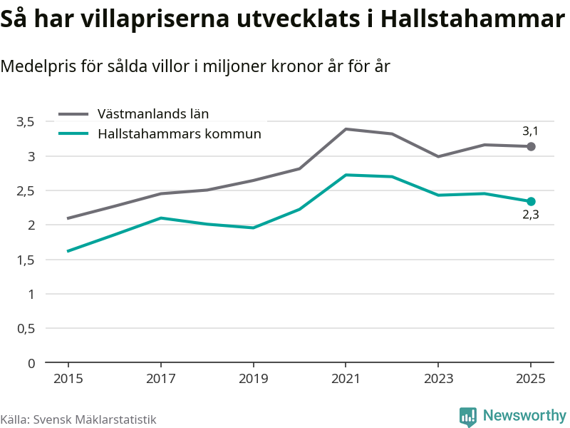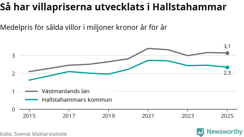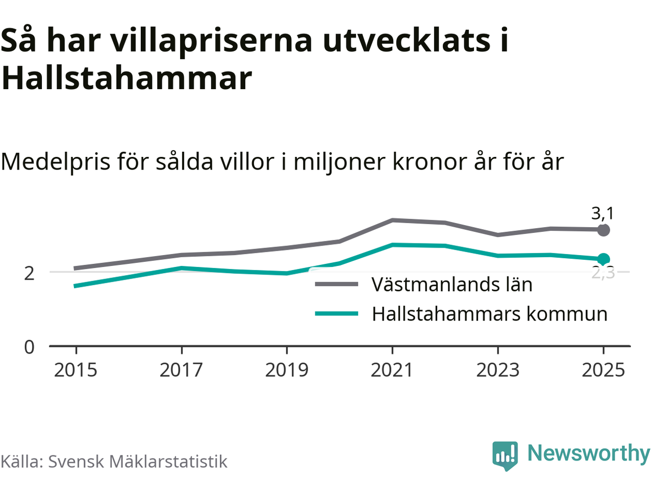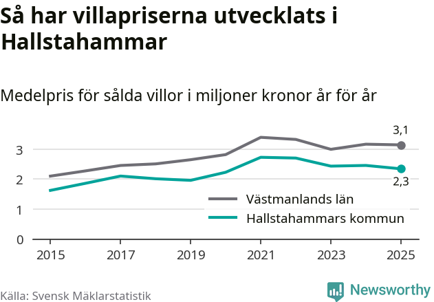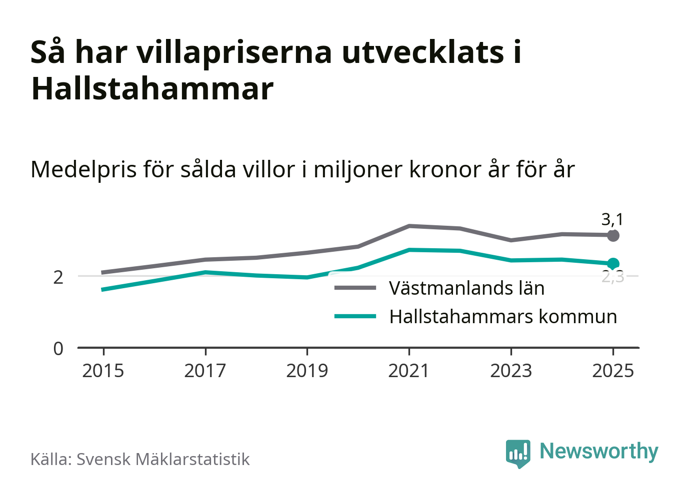 2,3 miljoner kronor är medelpriset för de villor som såldes i Hallstahammars kommun under året, eller 20 220 kronor per kvadratmeter. Det innebär en prisminskning med fem procent på ett år.