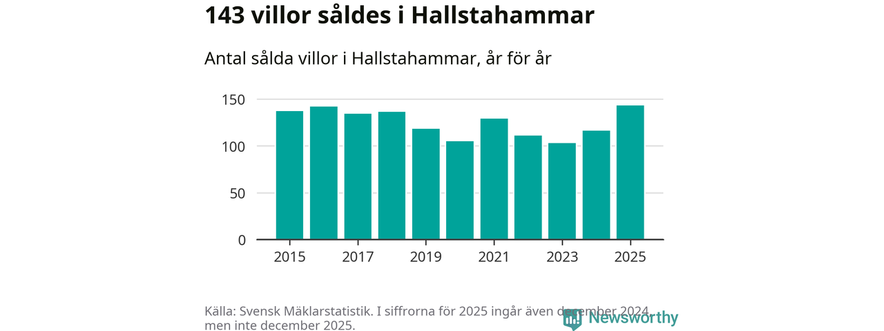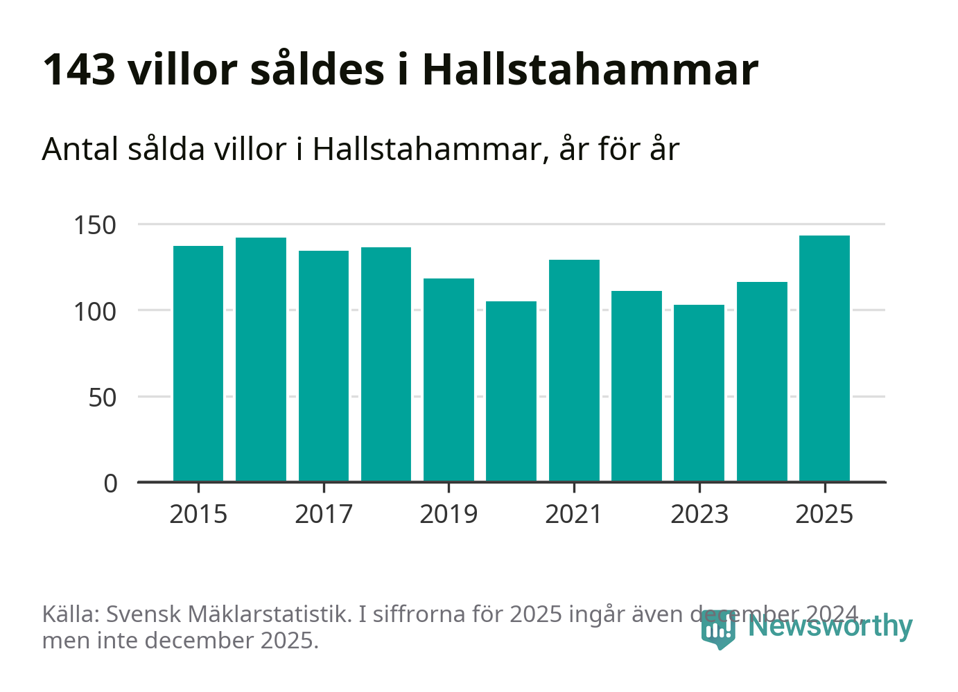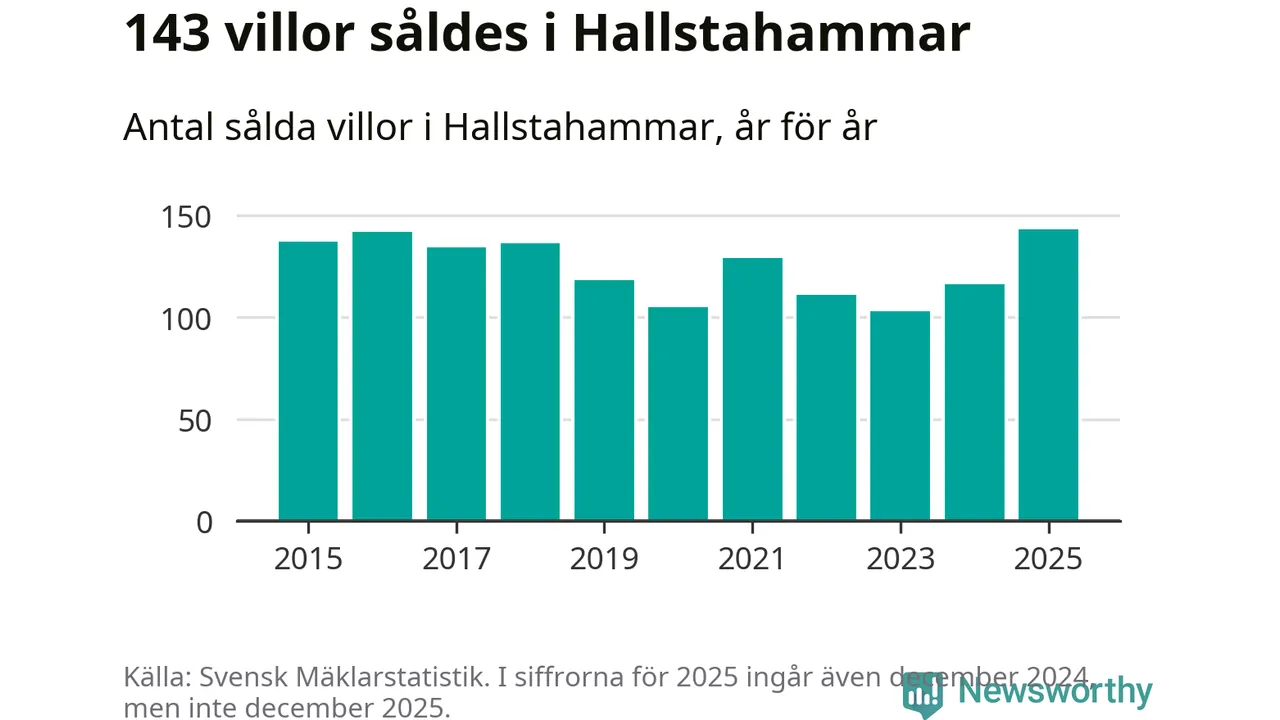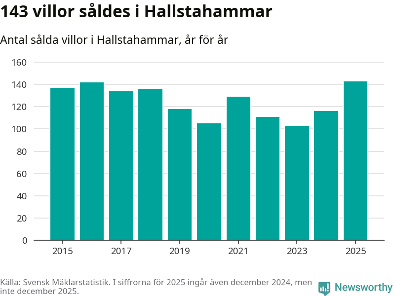 Däremot ökade antalet sålda villor. Totalt såldes 143 villor, att jämföra med 116 under 2024. Det är fler än något annat år sedan 2015.