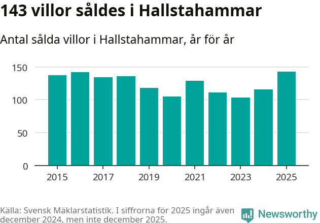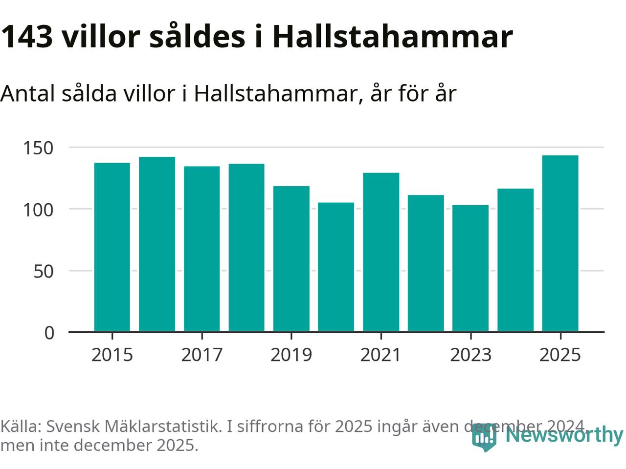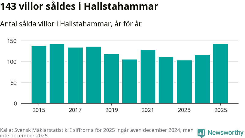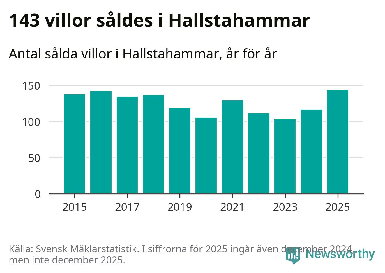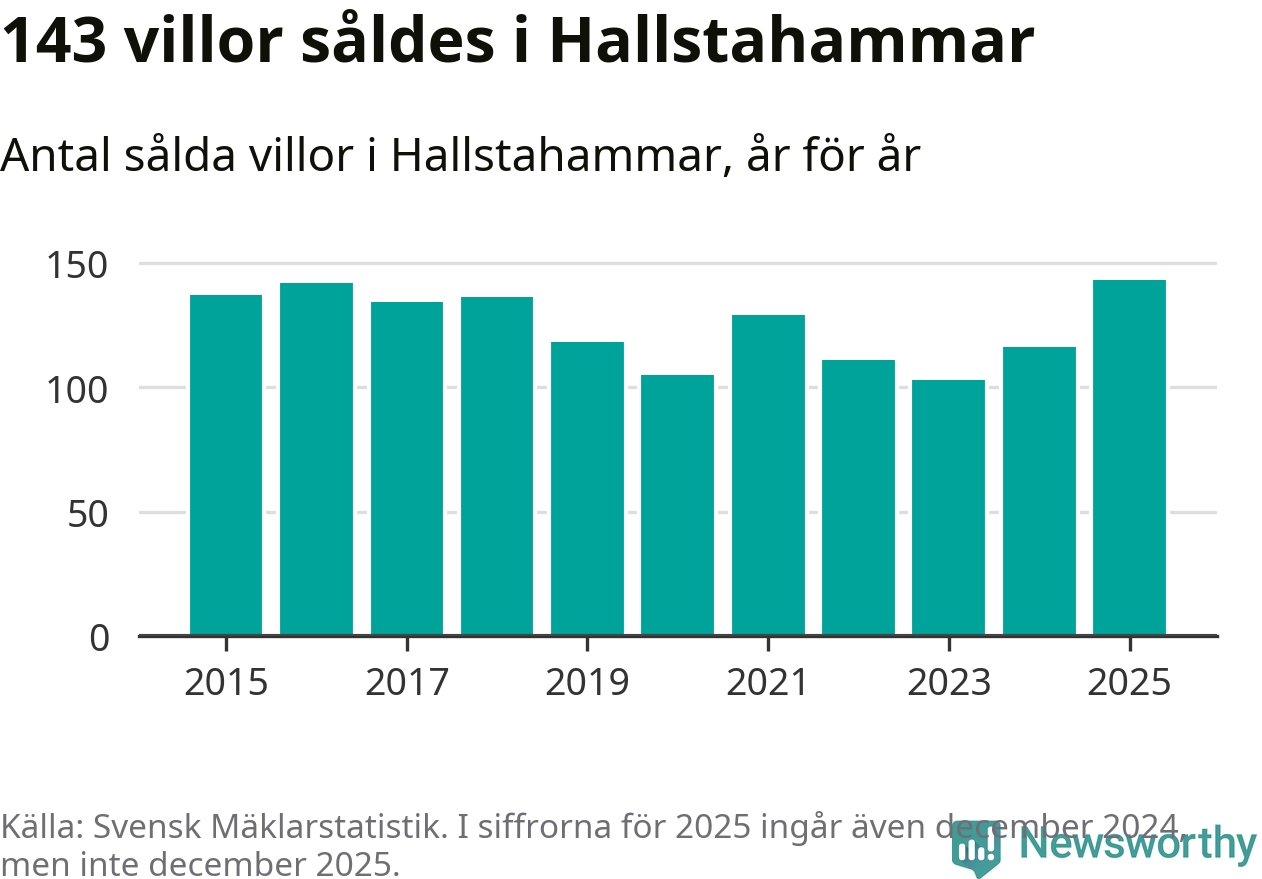 Däremot ökade antalet sålda villor. Totalt såldes 143 villor, att jämföra med 116 under 2024. Det är fler än något annat år sedan 2015.