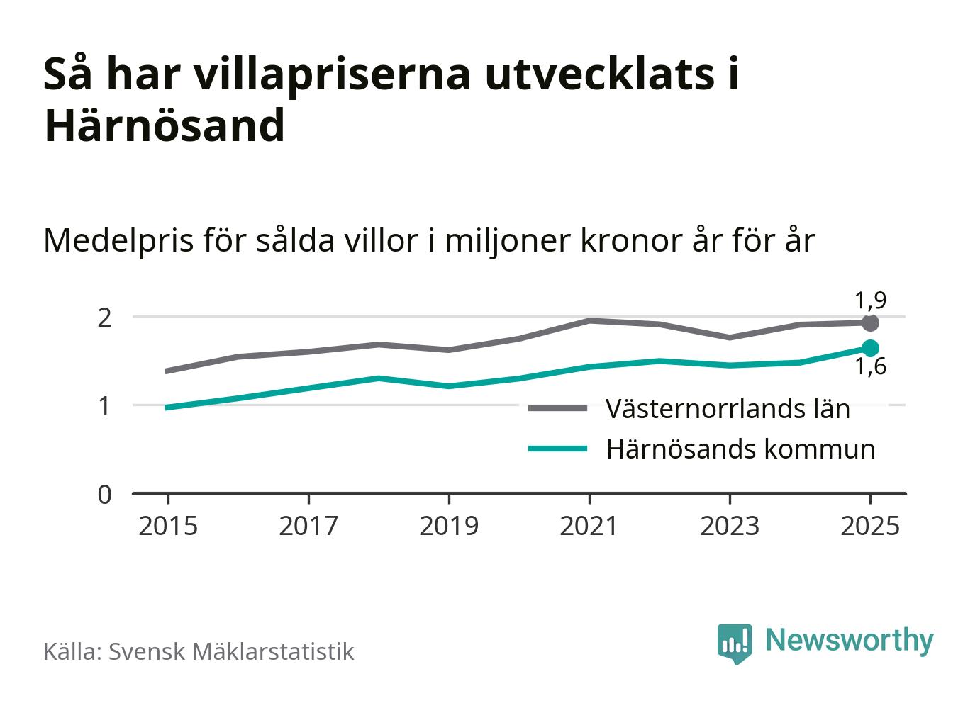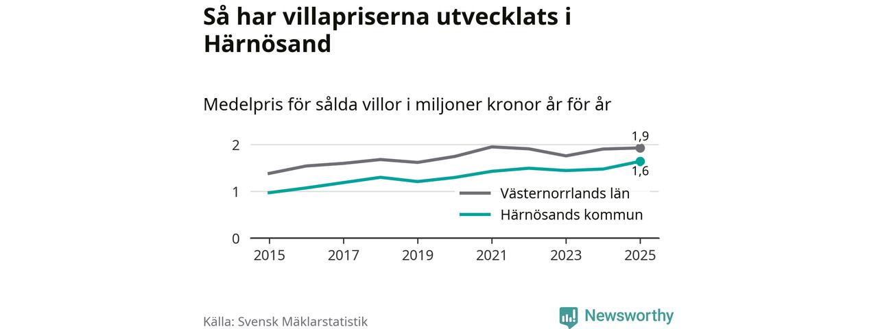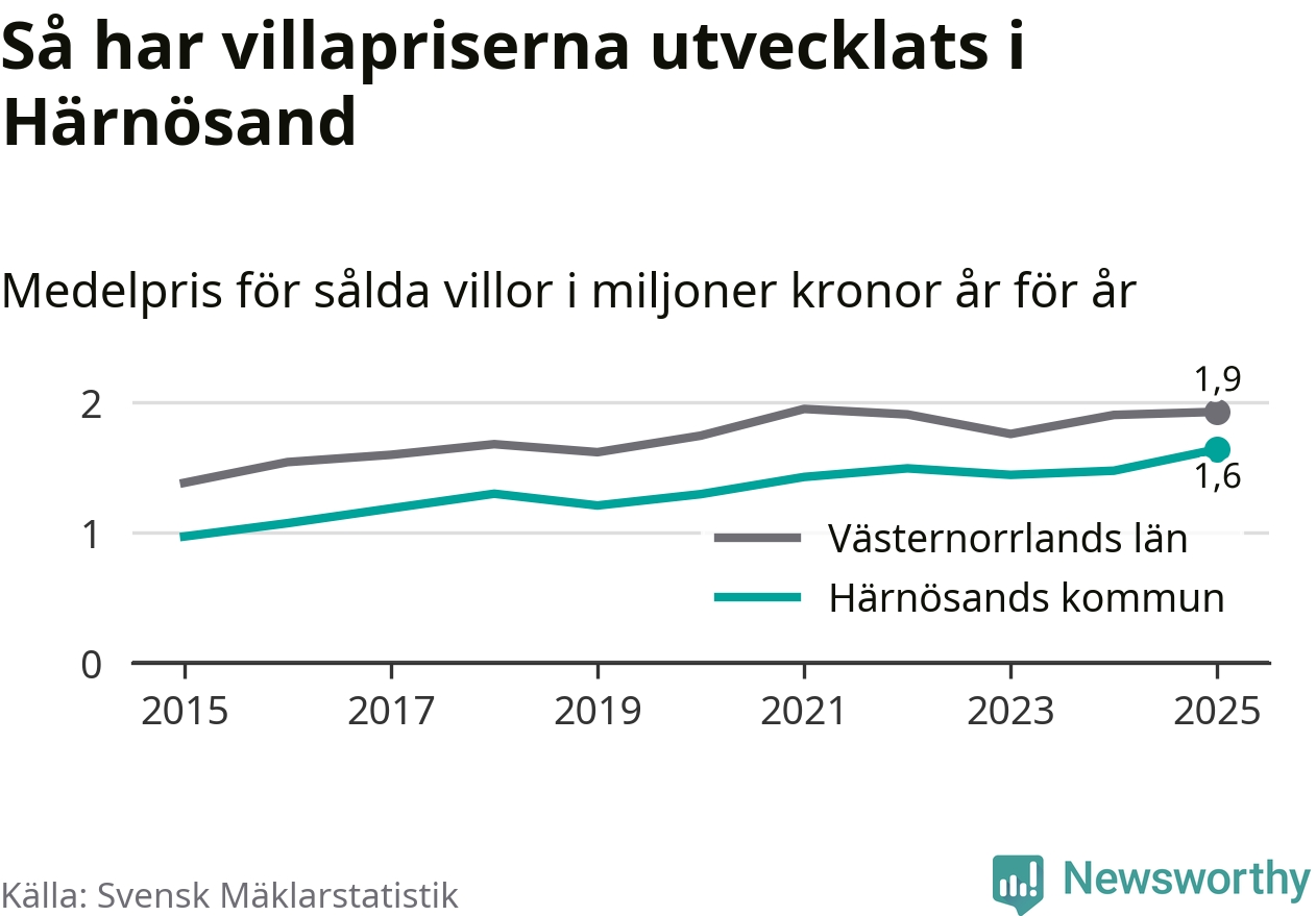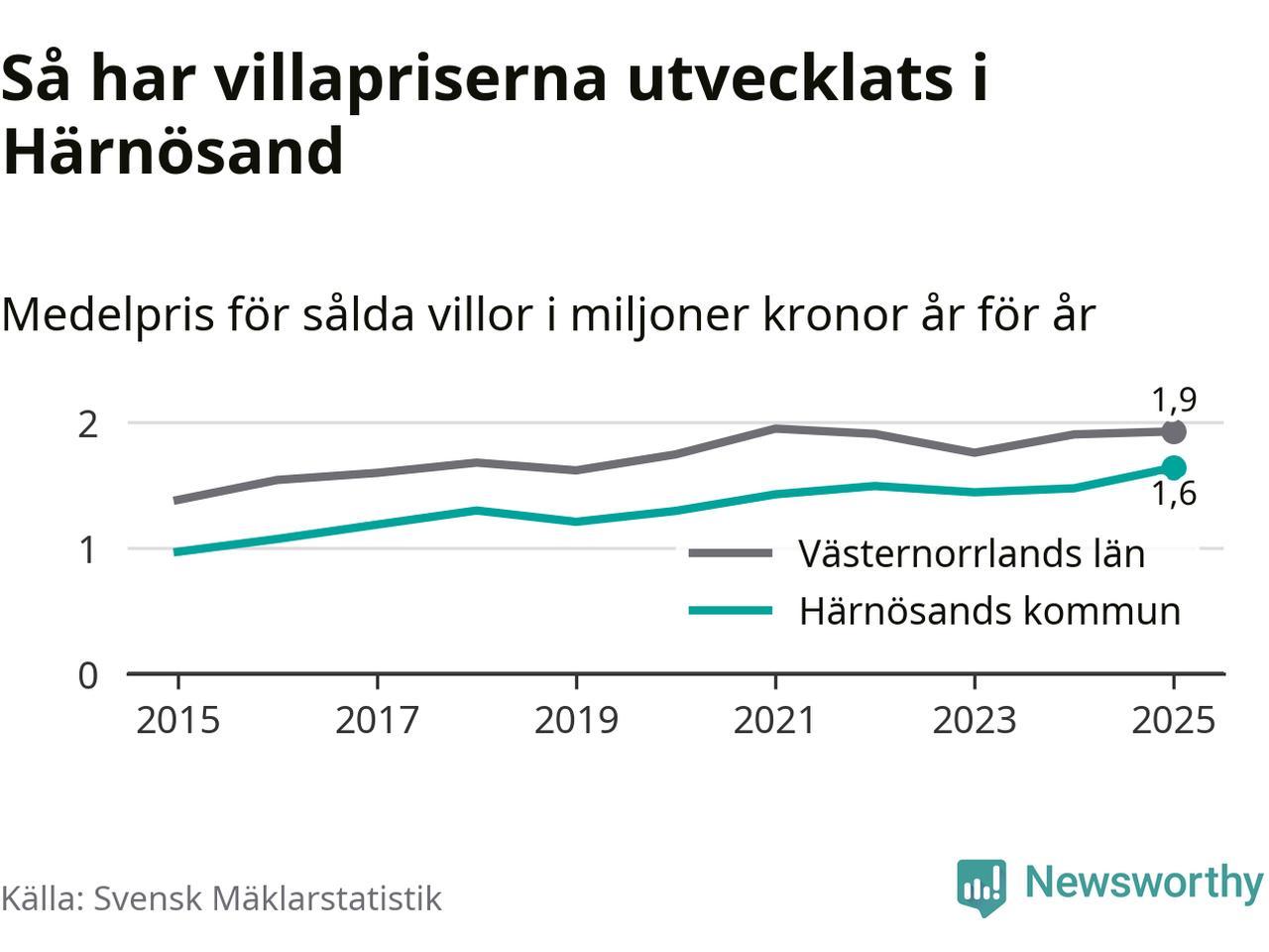 1,6 miljoner kronor är medelpriset för de villor som såldes i Härnösands kommun under året, eller 13 816 kronor per kvadratmeter. Det innebär en prisökning med elva procent på ett år. Det är det högsta årssnittet på åtminstone tio år.