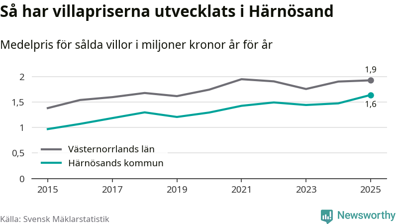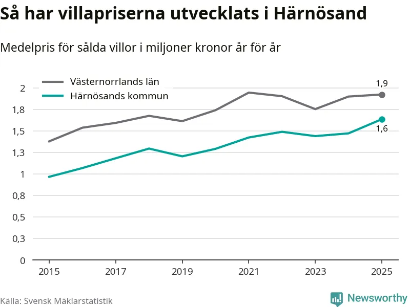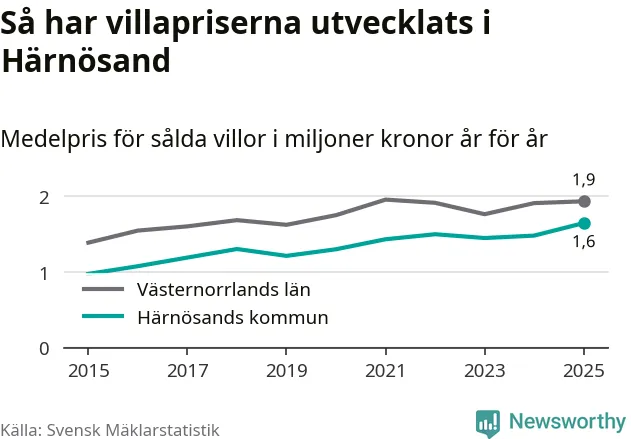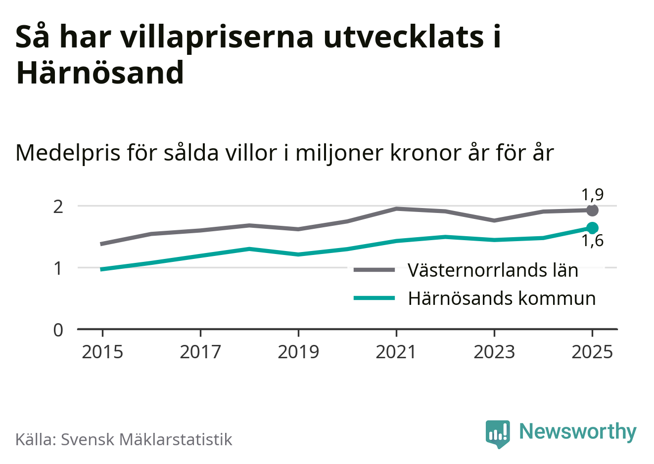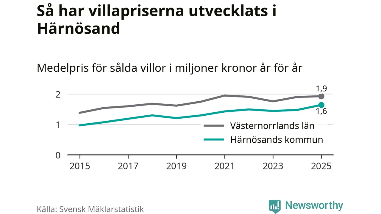 1,6 miljoner kronor är medelpriset för de villor som såldes i Härnösands kommun under året, eller 13 816 kronor per kvadratmeter. Det innebär en prisökning med elva procent på ett år. Det är det högsta årssnittet på åtminstone tio år.