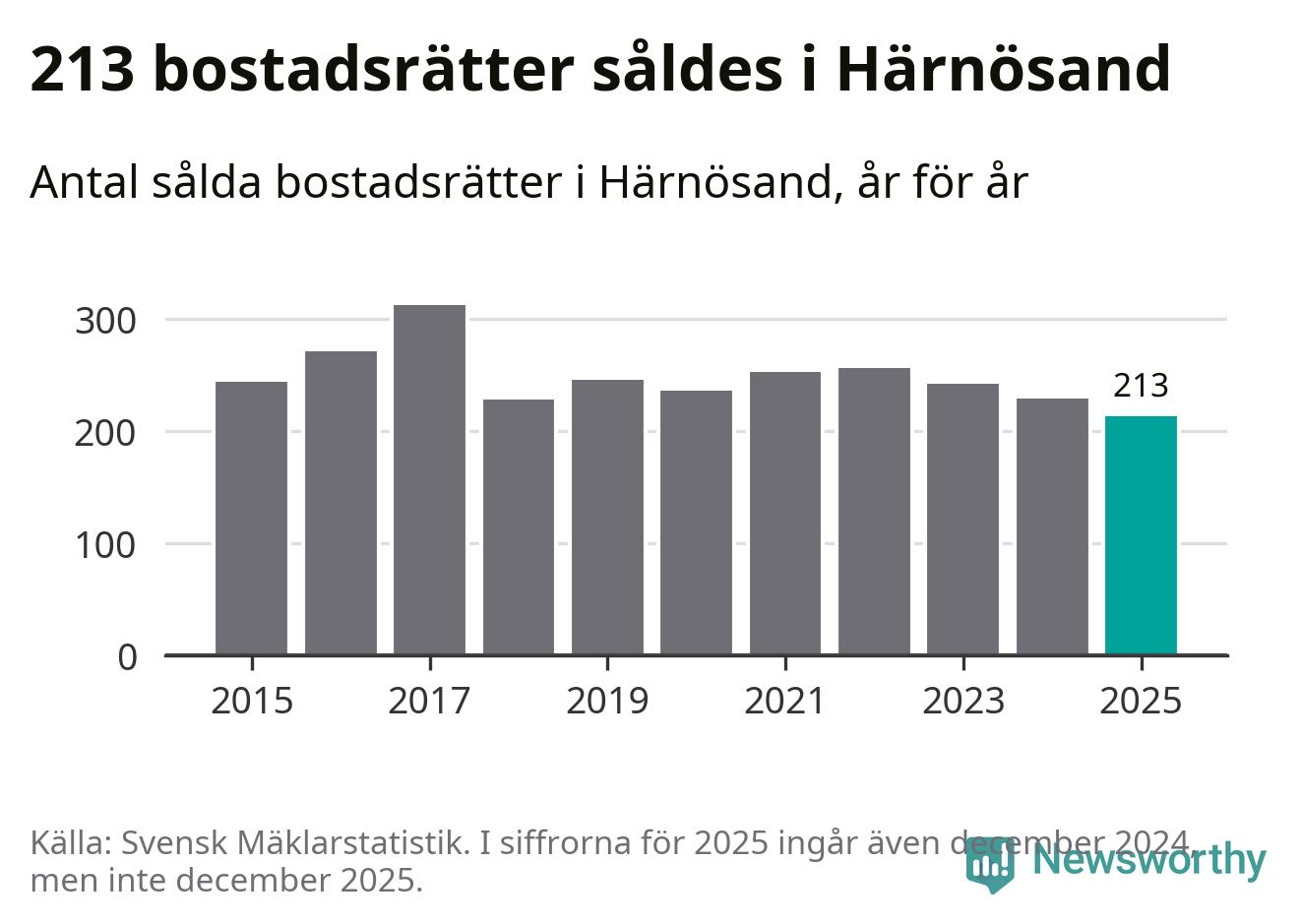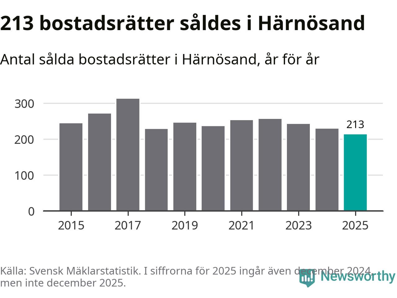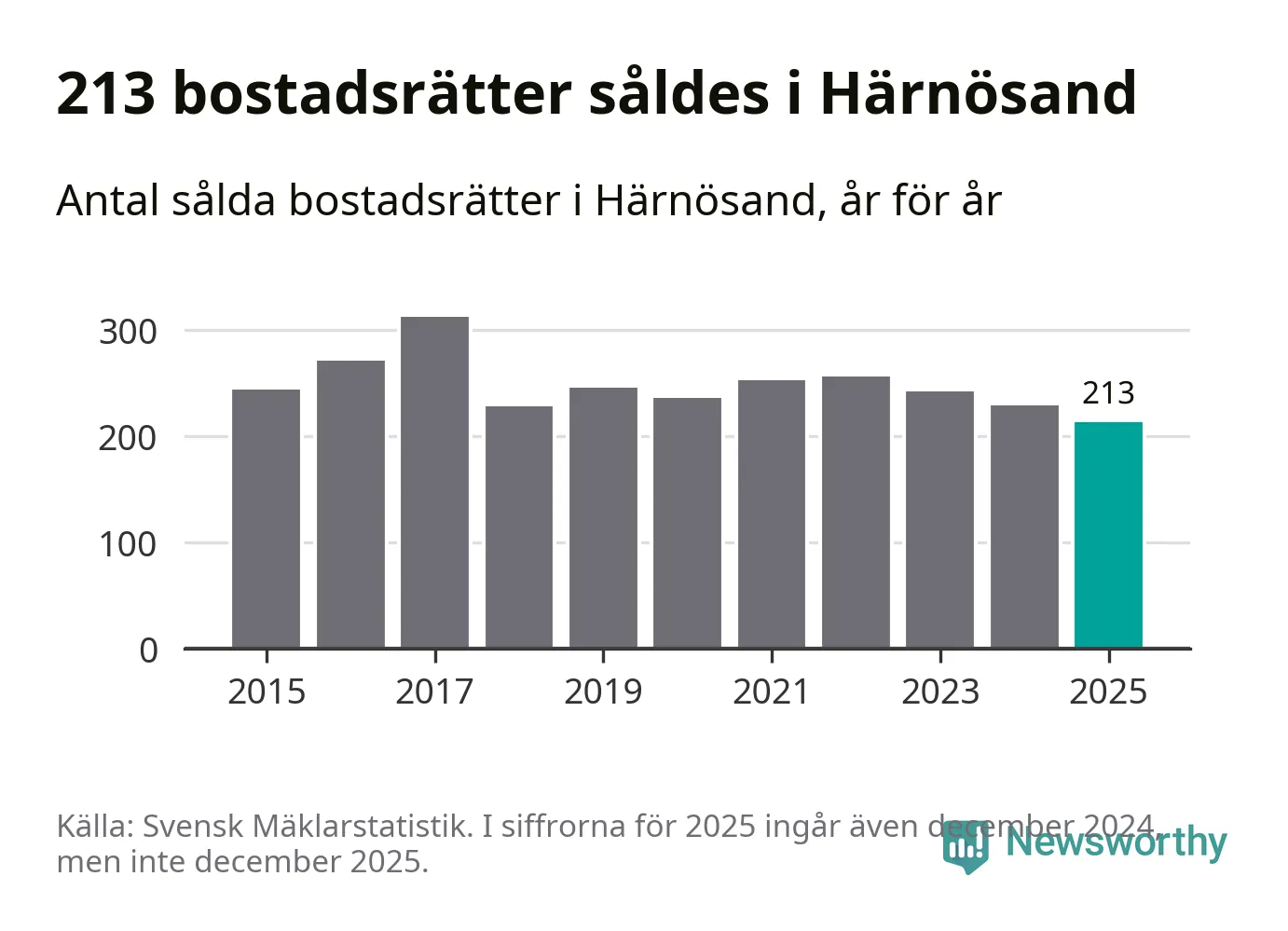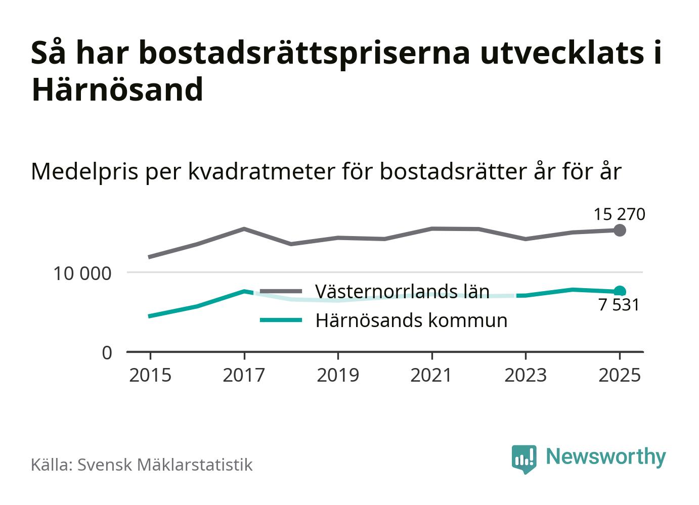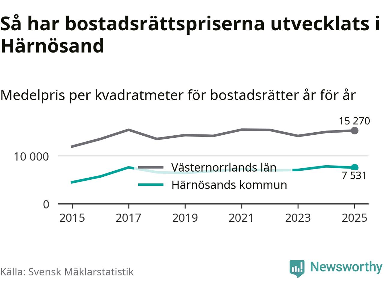 Det såldes totalt 213 bostadsrätter i Härnösands kommun under året. Det är färre än något annat år sedan 2015. Genomsnittspriset per kvadratmeter landade på 7 531 kronor. Det är en minskning med tre procent i kommunen på ett år.