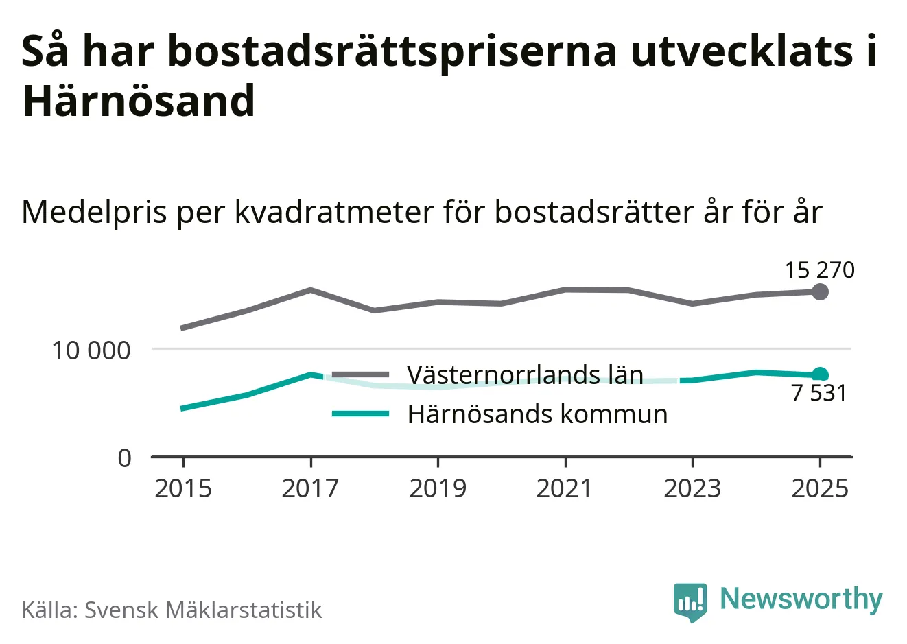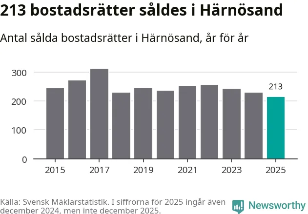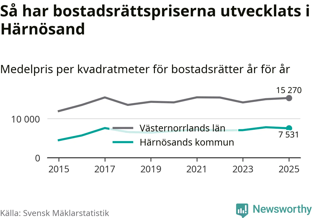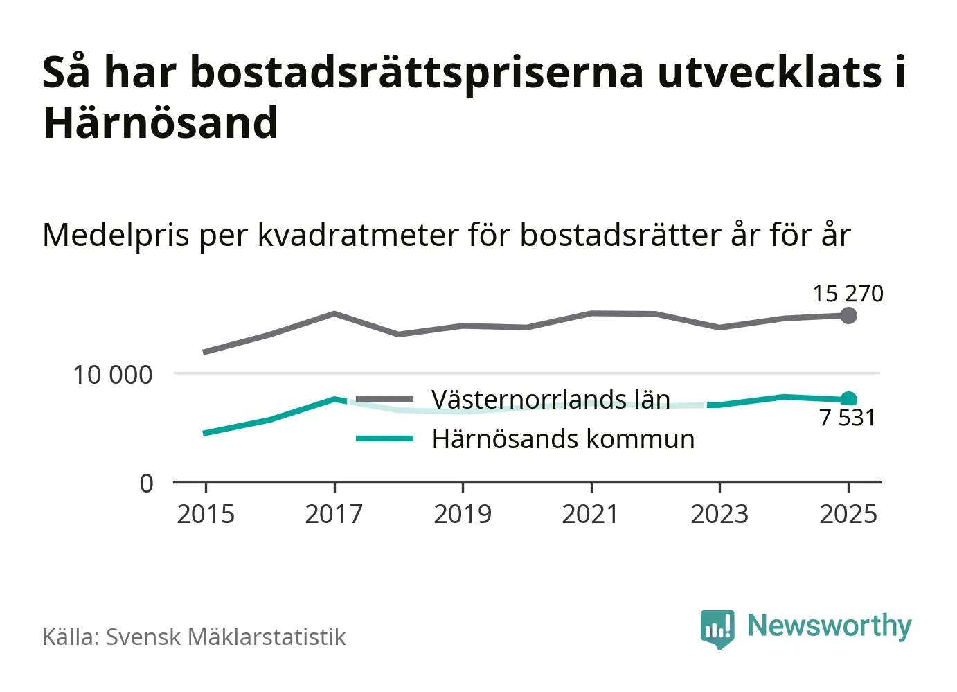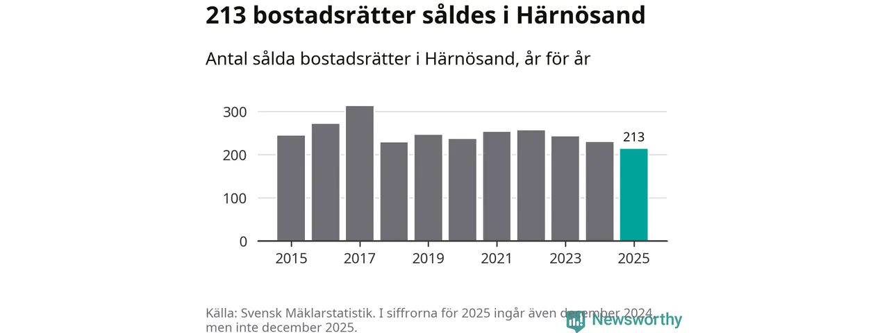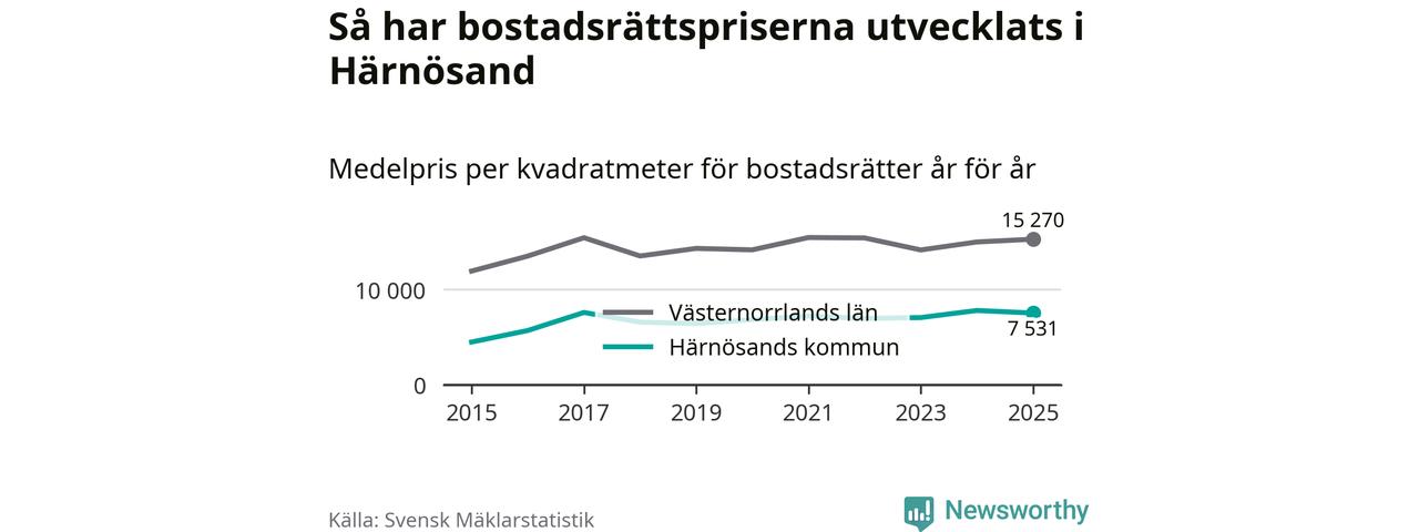 Det såldes totalt 213 bostadsrätter i Härnösands kommun under året. Det är färre än något annat år sedan 2015. Genomsnittspriset per kvadratmeter landade på 7 531 kronor. Det är en minskning med tre procent i kommunen på ett år.