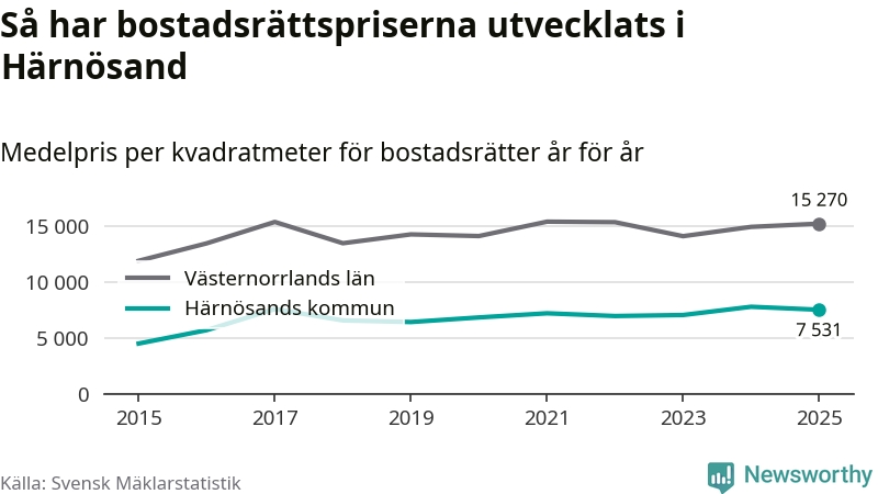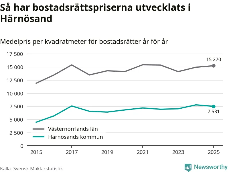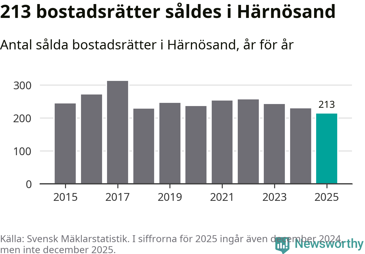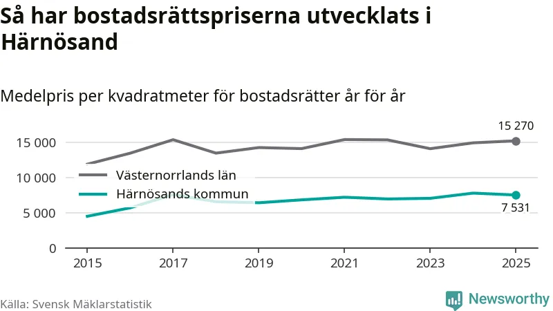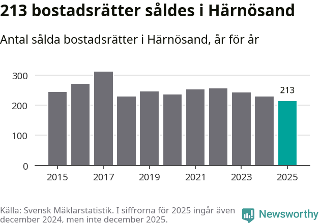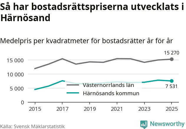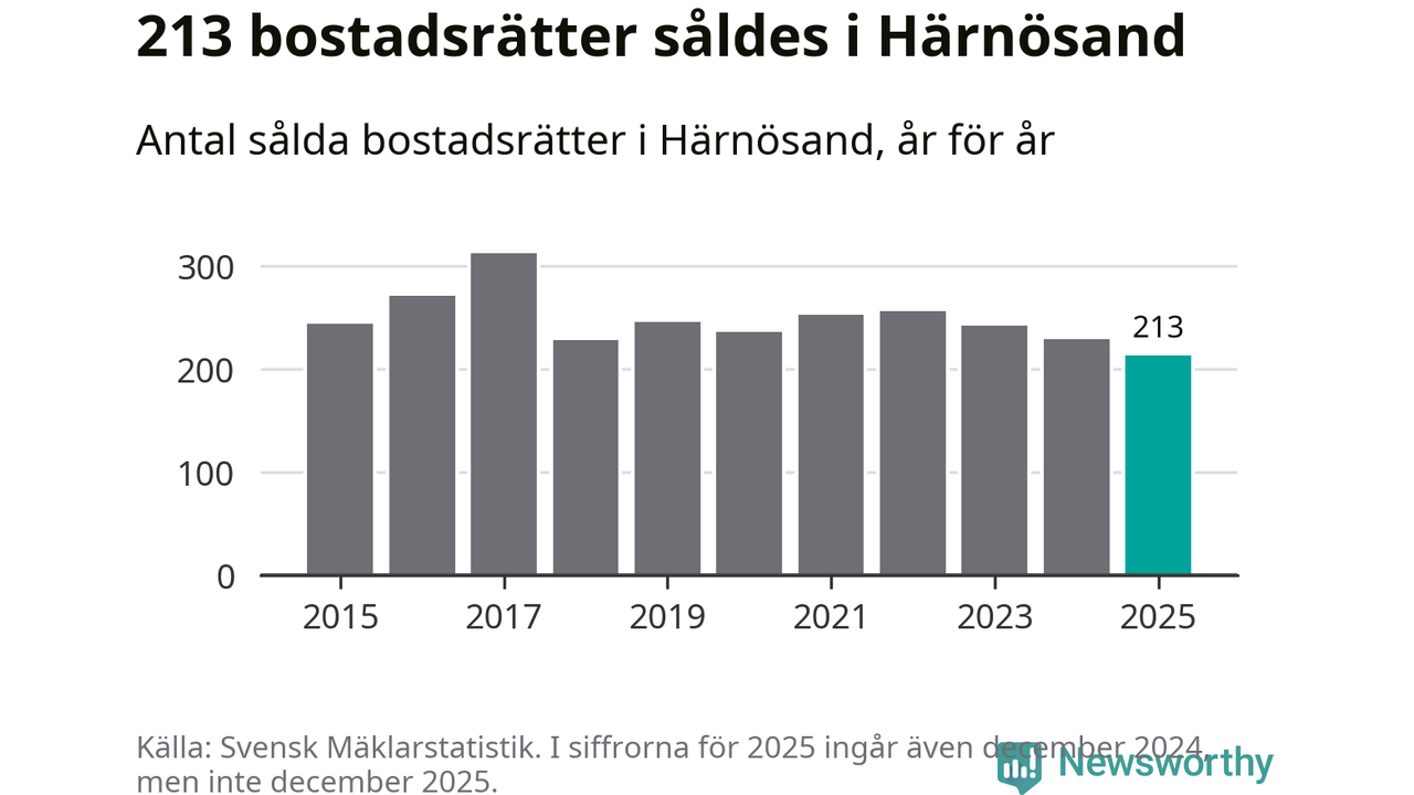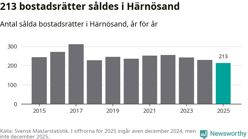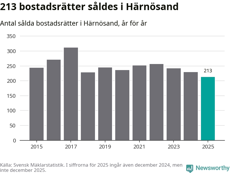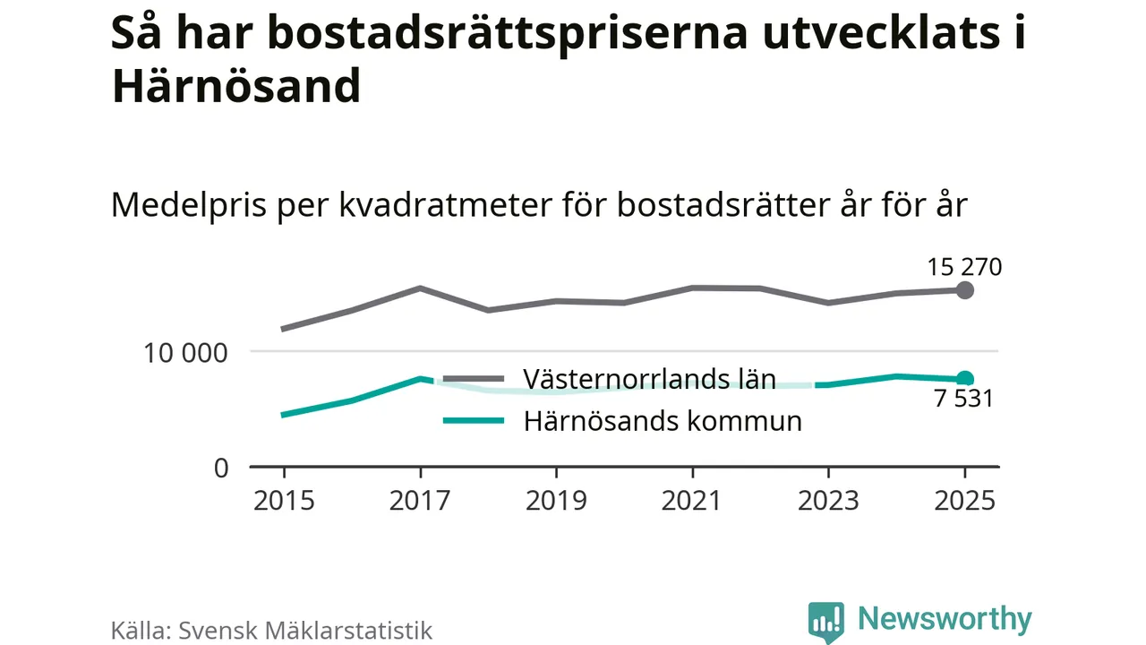 Det såldes totalt 213 bostadsrätter i Härnösands kommun under året. Det är färre än något annat år sedan 2015. Genomsnittspriset per kvadratmeter landade på 7 531 kronor. Det är en minskning med tre procent i kommunen på ett år.