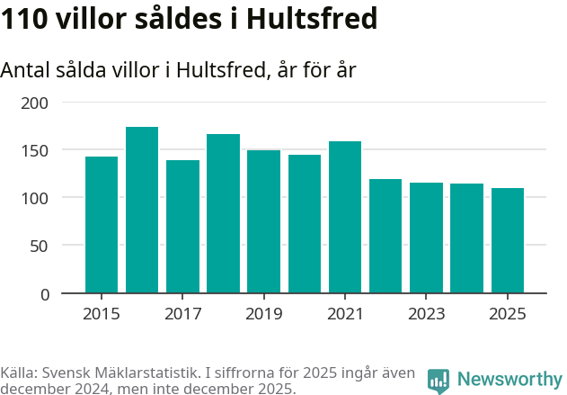 Däremot minskade antalet sålda villor något. Totalt såldes 110 villor, att jämföra med 114 under 2024. Det är färre än något annat år sedan 2015.