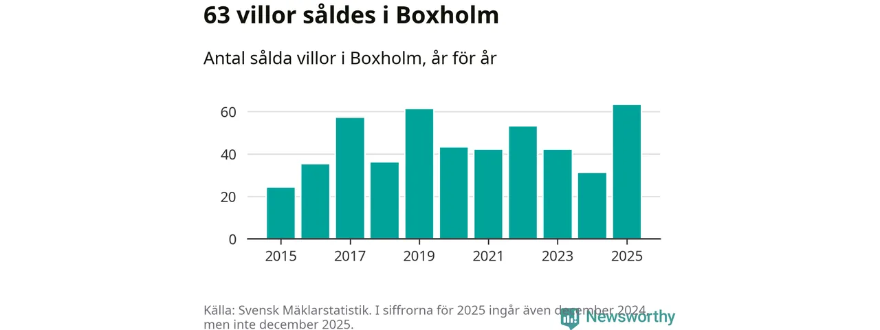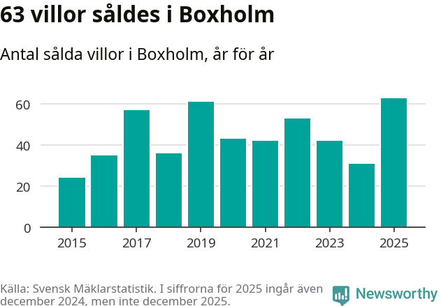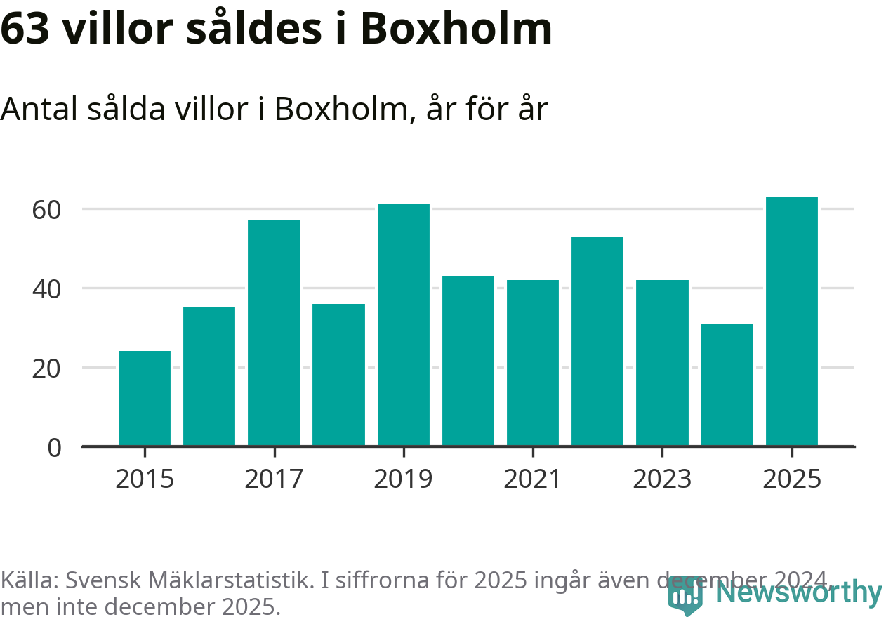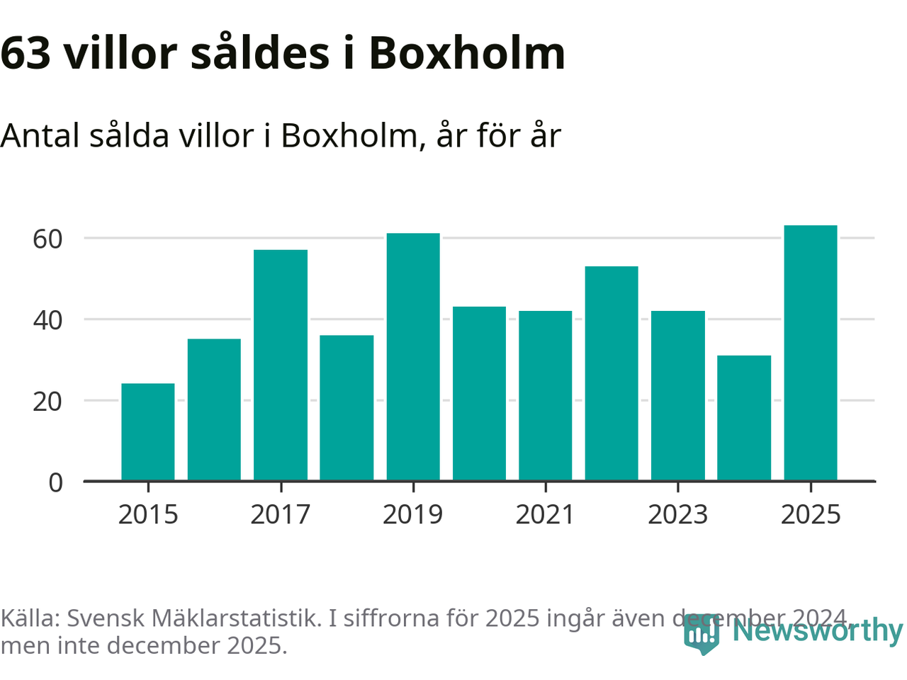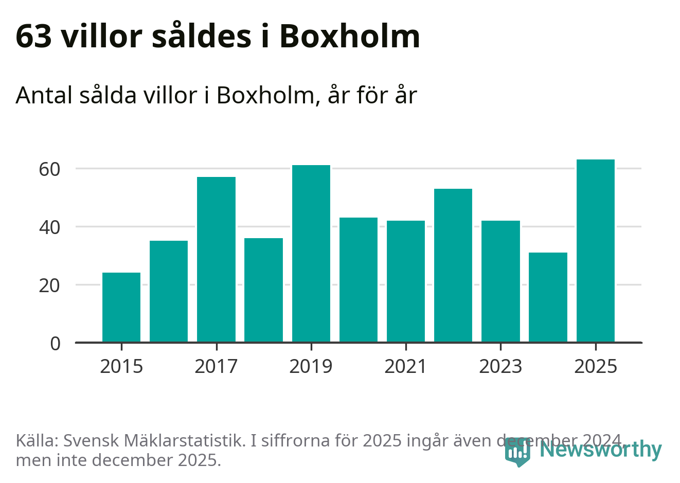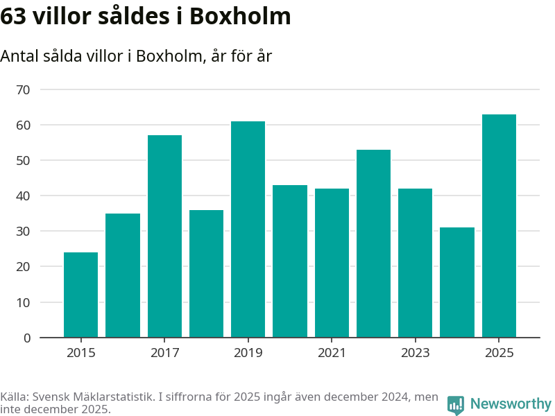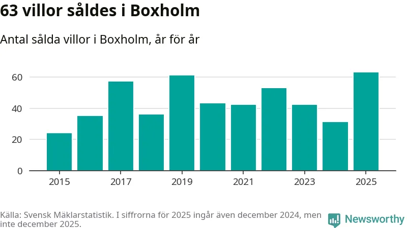 Antalet sålda villor ökade också. Totalt såldes 63 villor, att jämföra med 31 under 2024. Det är fler än något annat år sedan 2015.