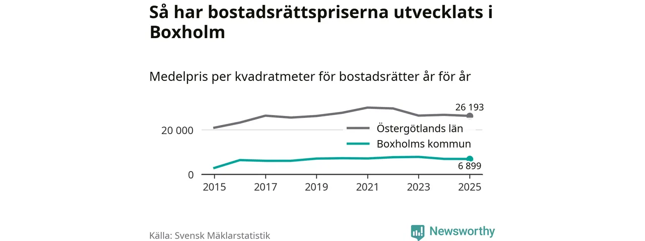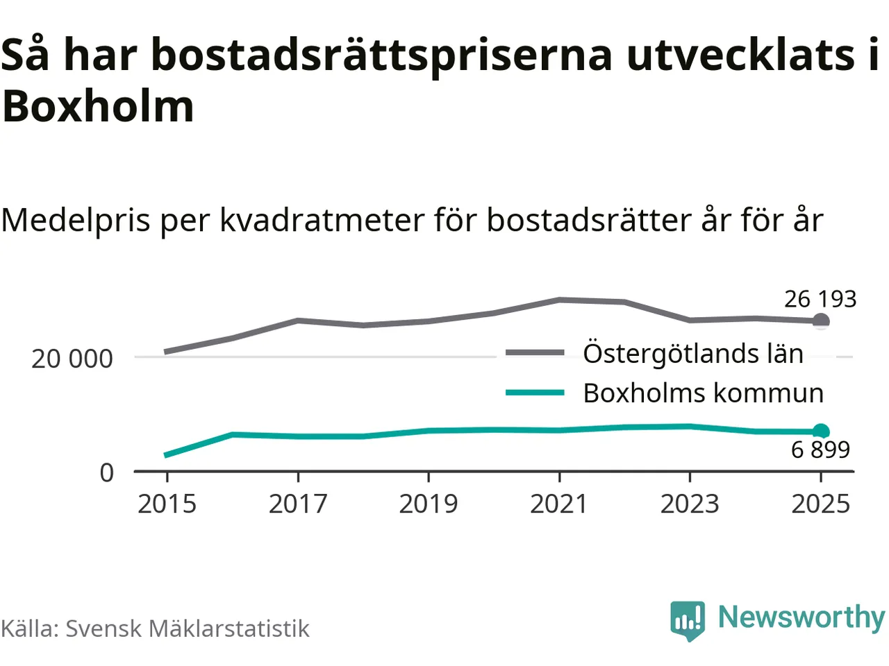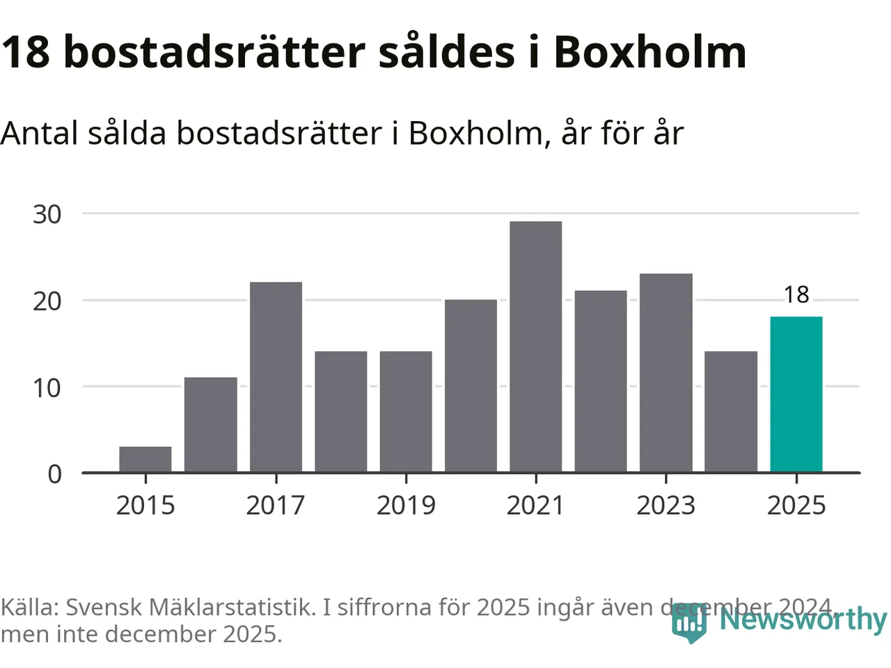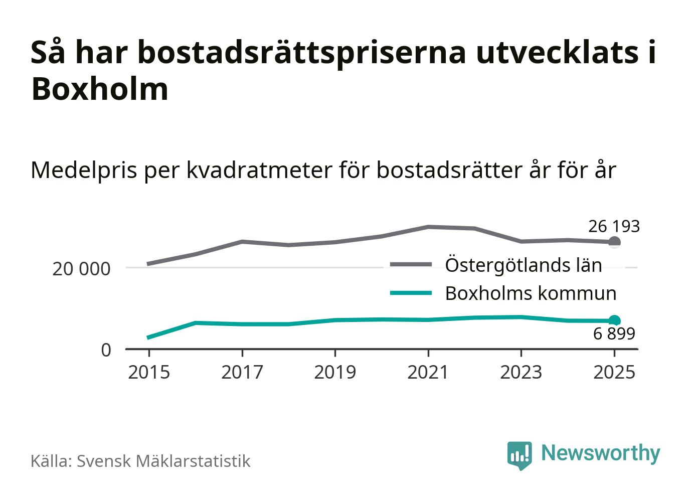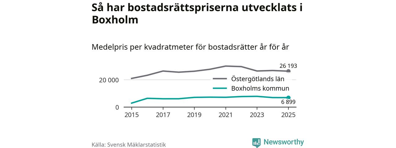 När det gäller bostadsrätter i Boxholms kommun såldes 18 under året. Snittet per kvadratmeter landade på omkring 6 900 kronor. Det är ingen större skillnad jämfört med förra året.