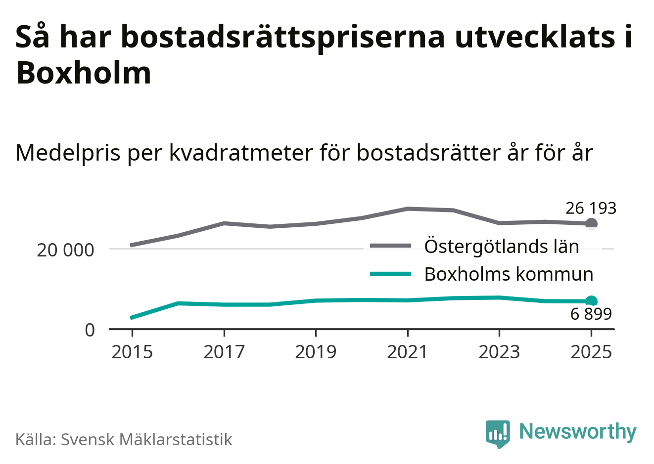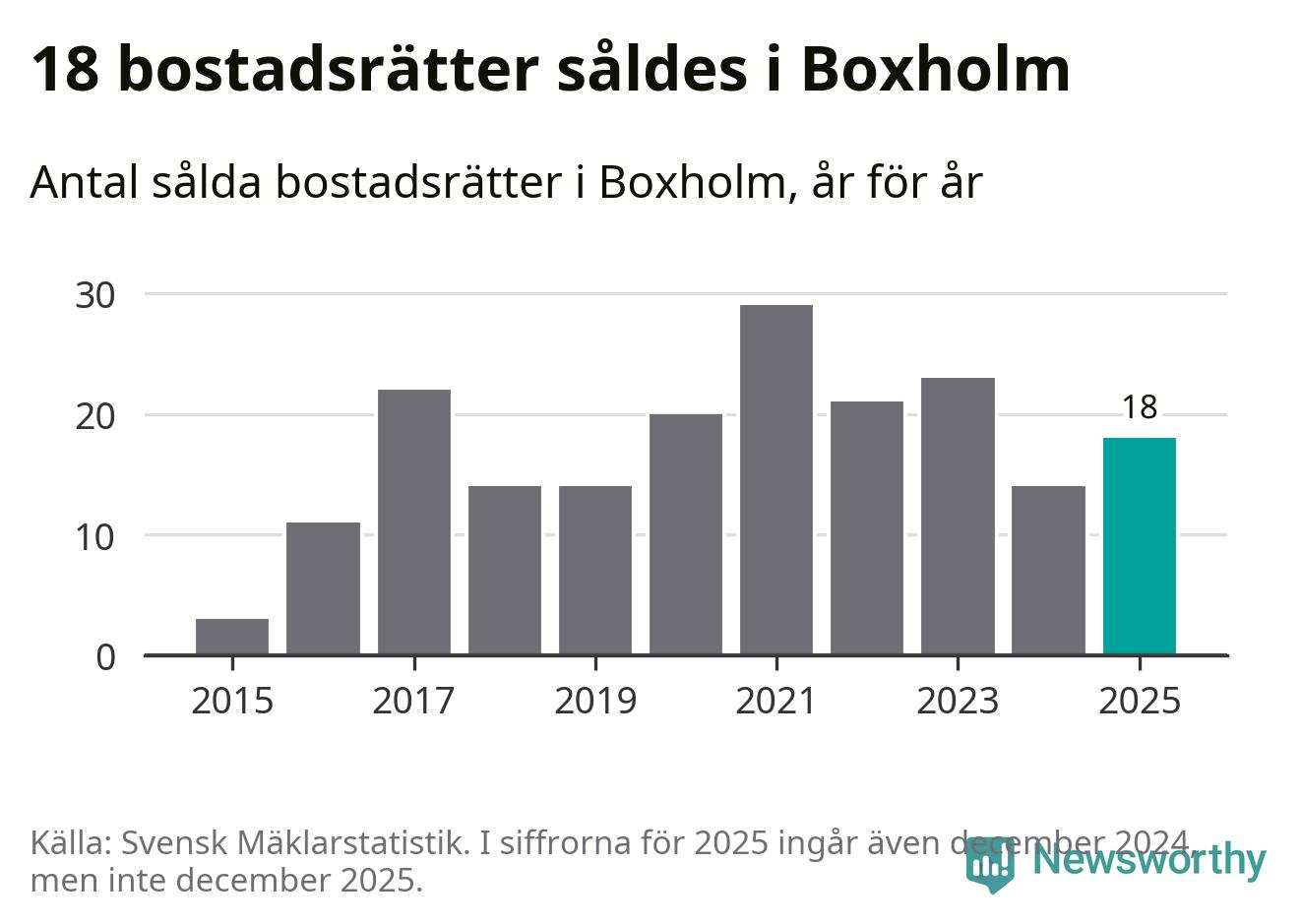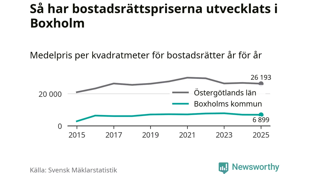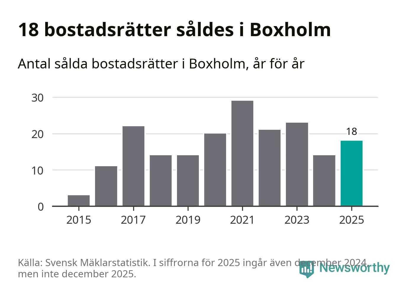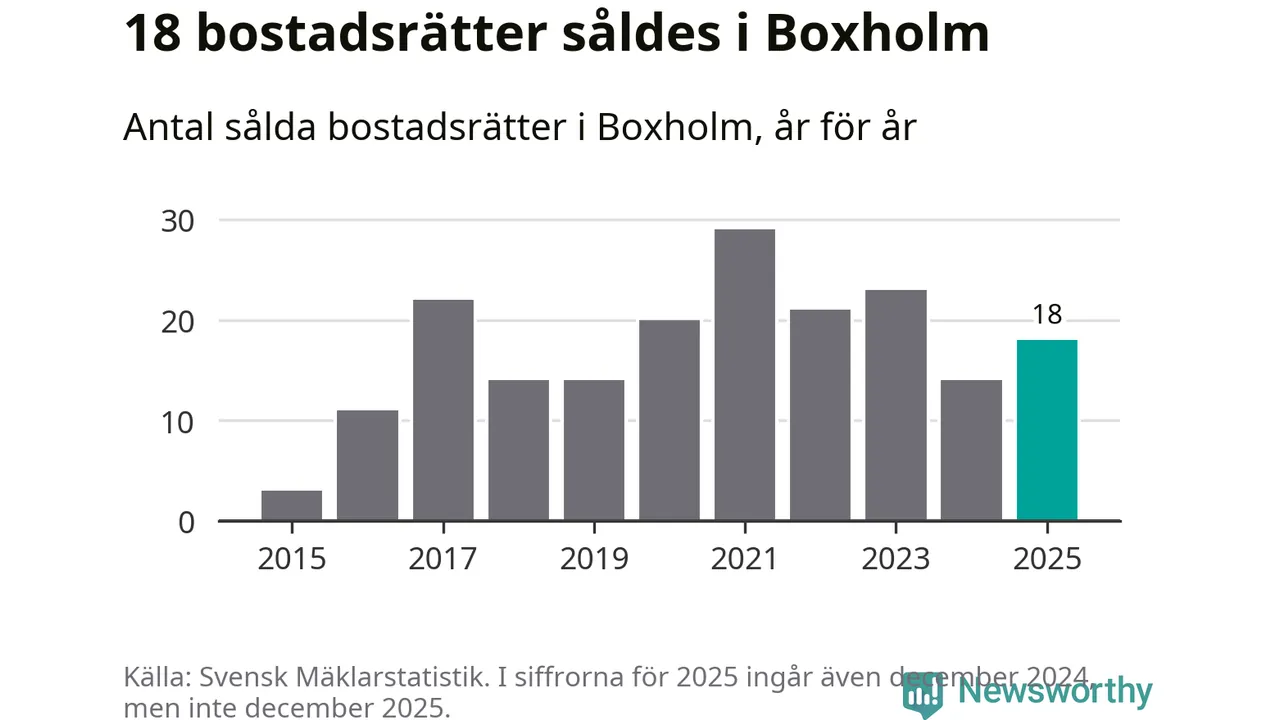 När det gäller bostadsrätter i Boxholms kommun såldes 18 under året. Snittet per kvadratmeter landade på omkring 6 900 kronor. Det är ingen större skillnad jämfört med förra året.