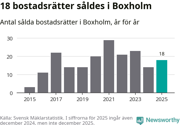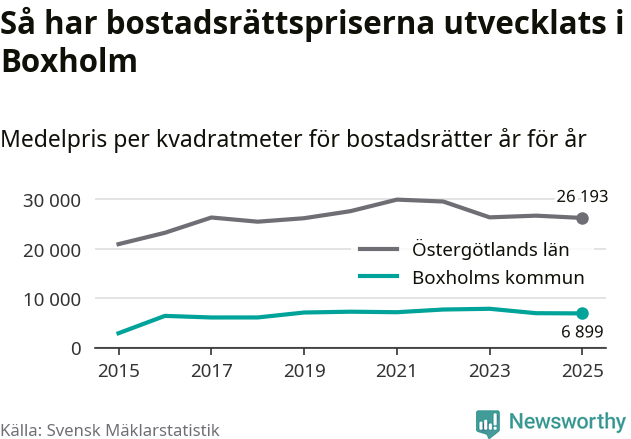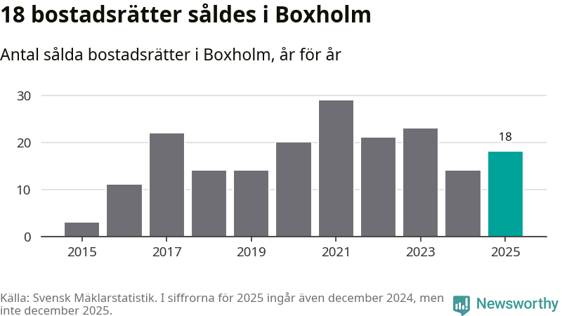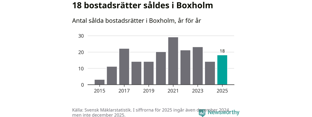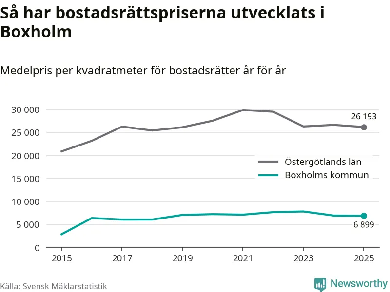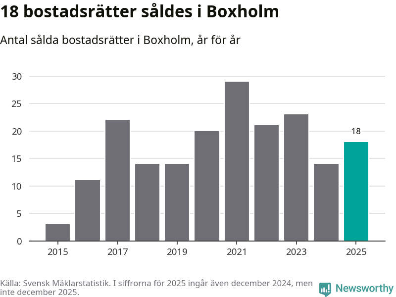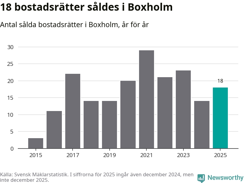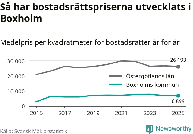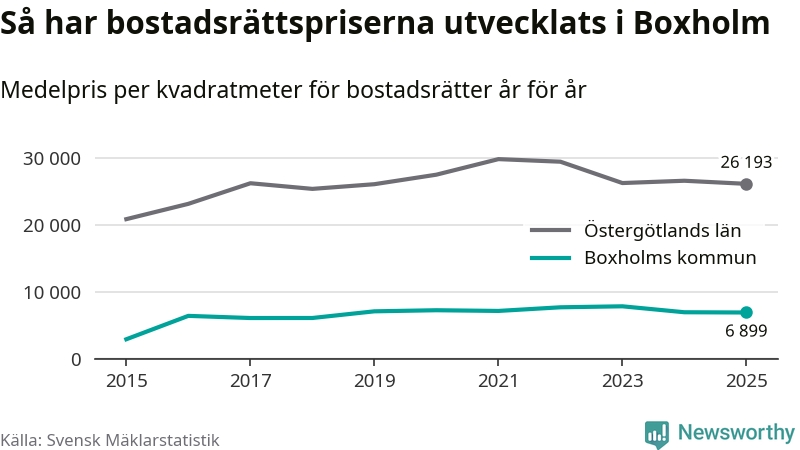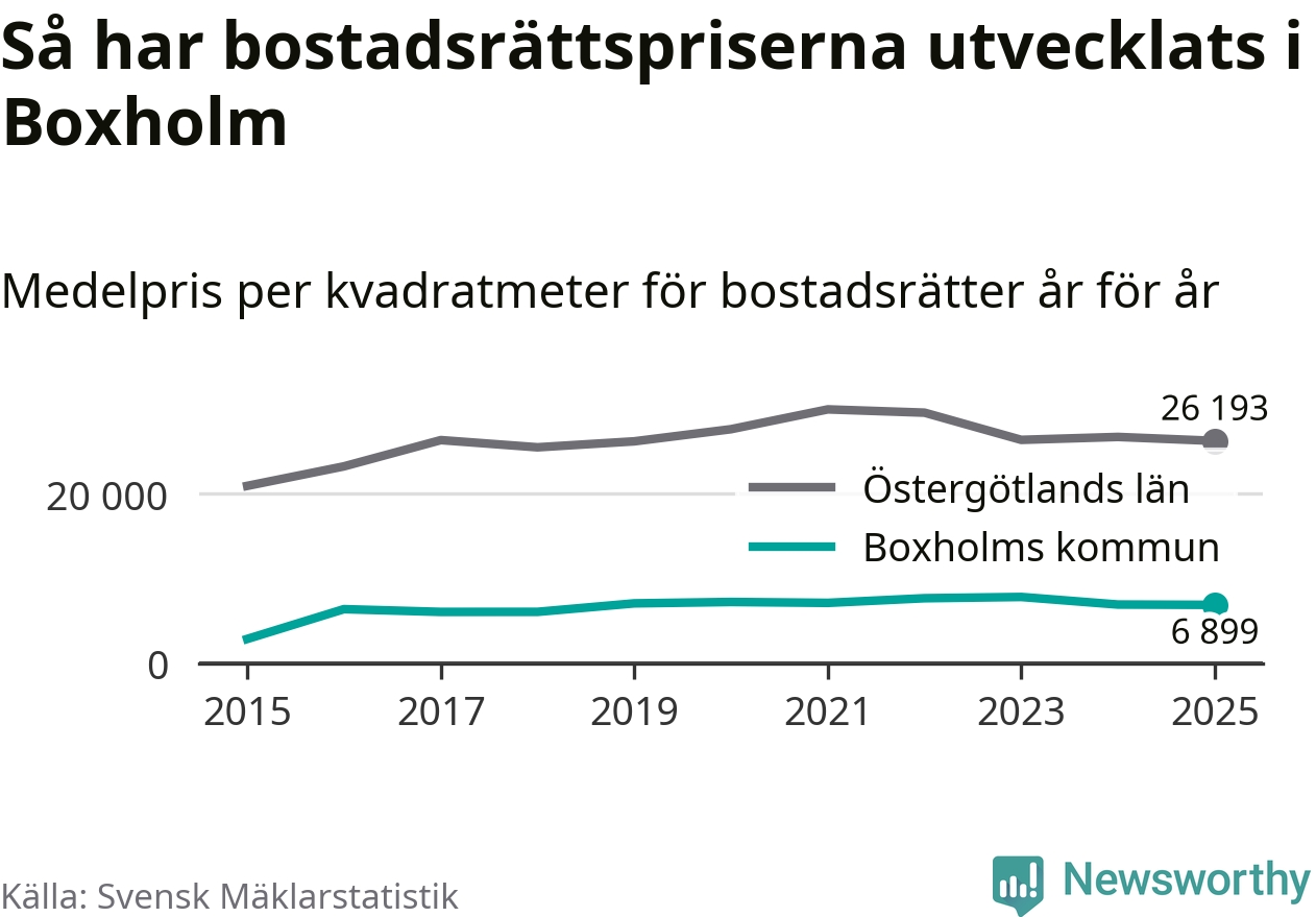 När det gäller bostadsrätter i Boxholms kommun såldes 18 under året. Snittet per kvadratmeter landade på omkring 6 900 kronor. Det är ingen större skillnad jämfört med förra året.