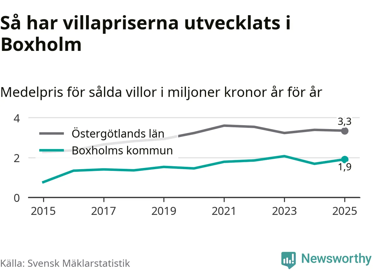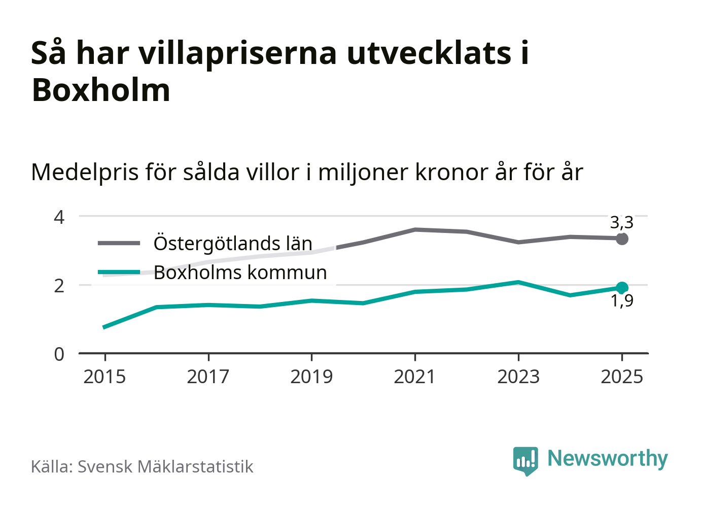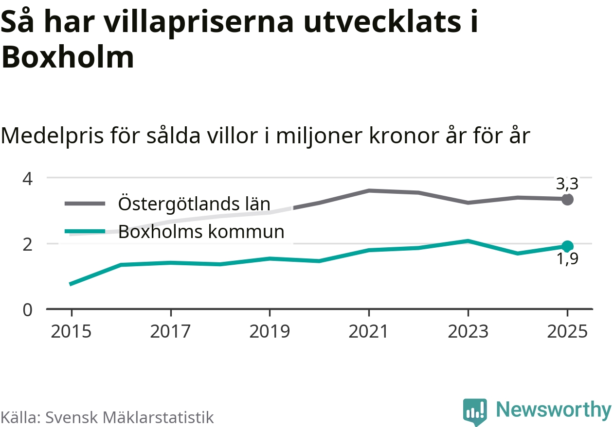 1,9 miljoner kronor är medelpriset för de villor som såldes i Boxholms kommun under året, eller 17 288 kronor per kvadratmeter. Det innebär en prisökning med 13 procent på ett år.
