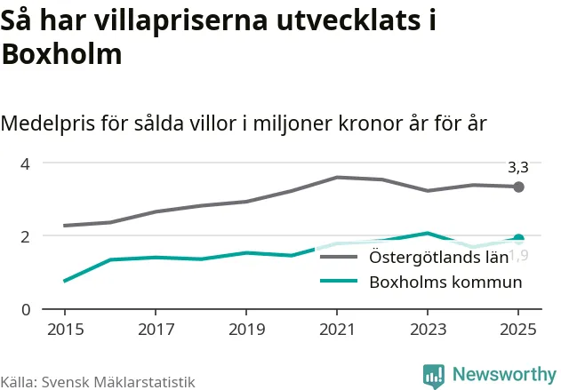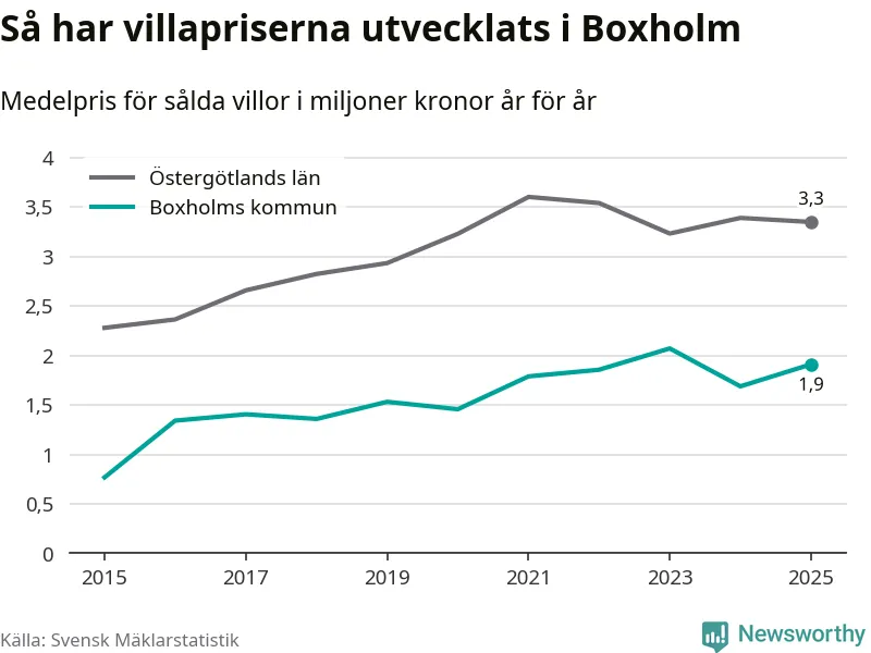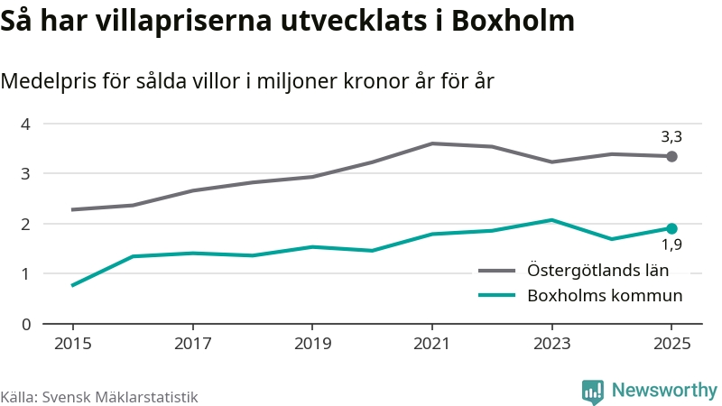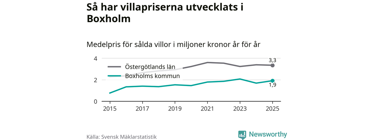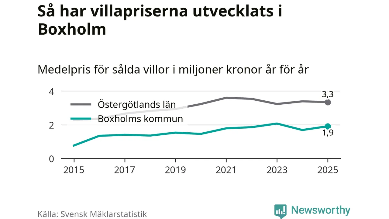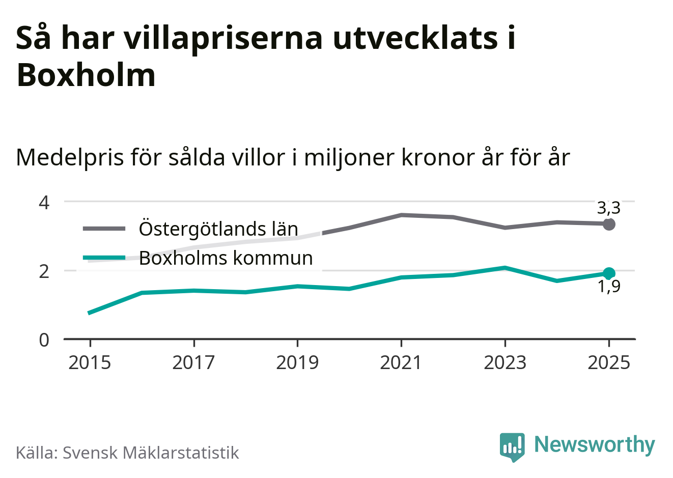 1,9 miljoner kronor är medelpriset för de villor som såldes i Boxholms kommun under året, eller 17 288 kronor per kvadratmeter. Det innebär en prisökning med 13 procent på ett år.