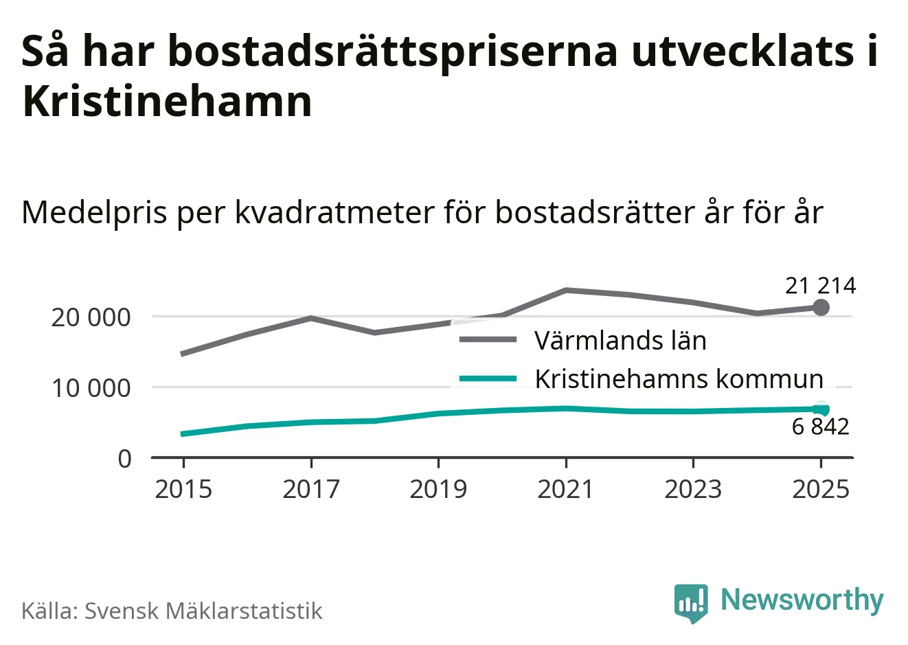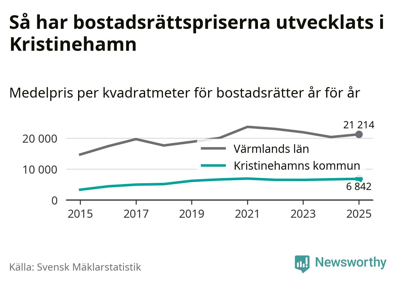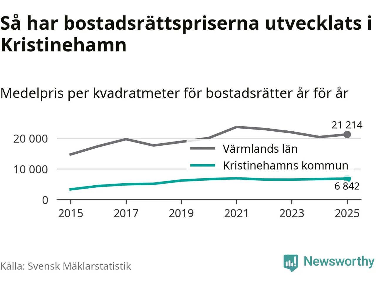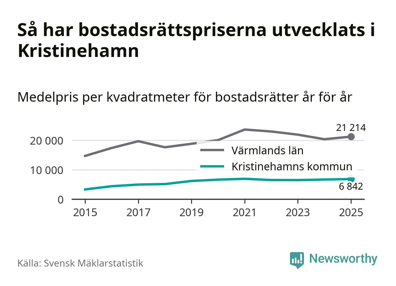 Det såldes totalt 210 bostadsrätter i Kristinehamns kommun under året. Genomsnittspriset per kvadratmeter landade på 6 842 kronor. Det är en ökning med två procent i kommunen på ett år.