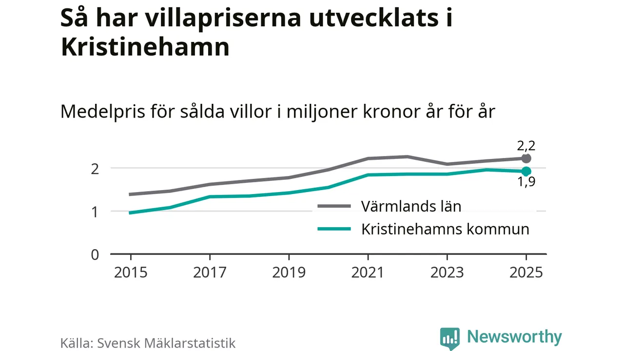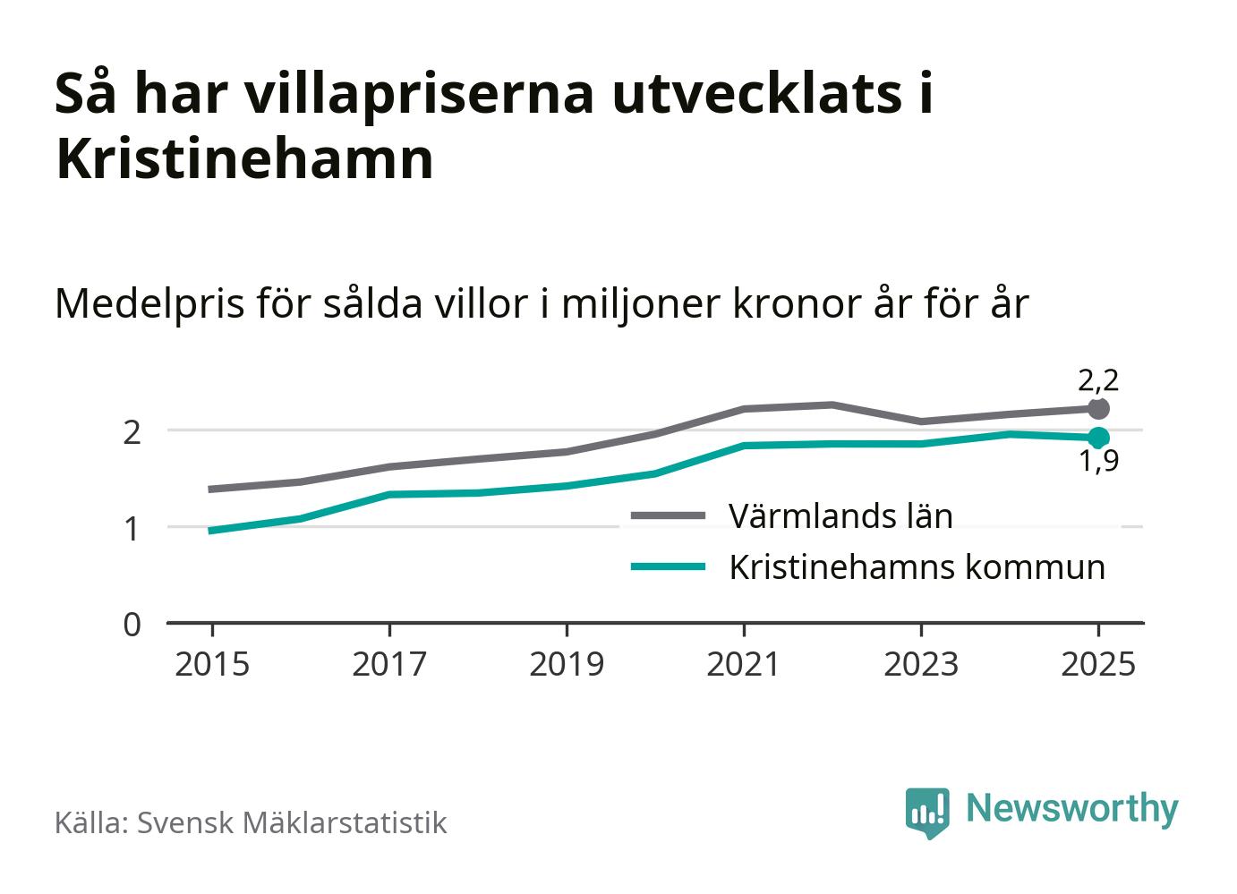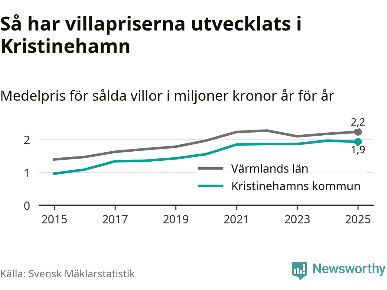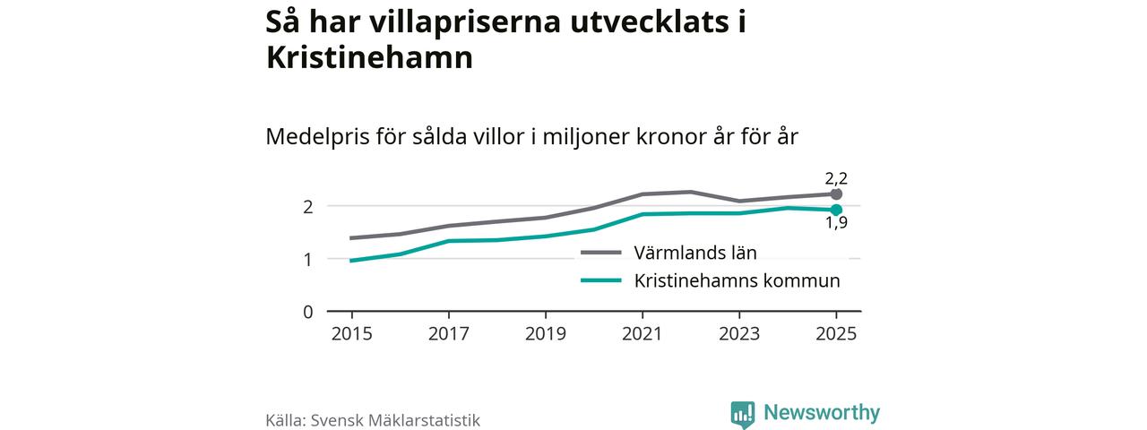 1,9 miljoner kronor är medelpriset för de villor som såldes i Kristinehamns kommun under året, eller 16 221 kronor per kvadratmeter. Det innebär en prisminskning med två procent på ett år.