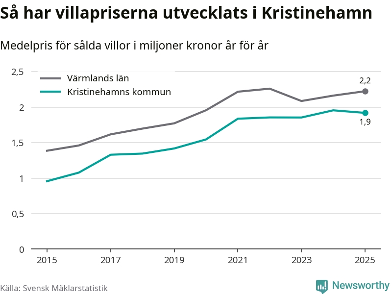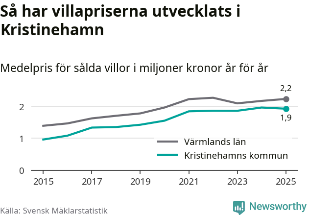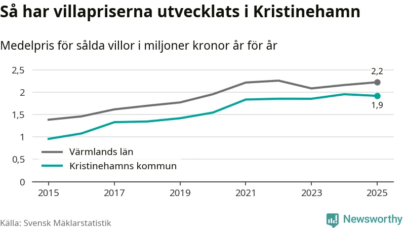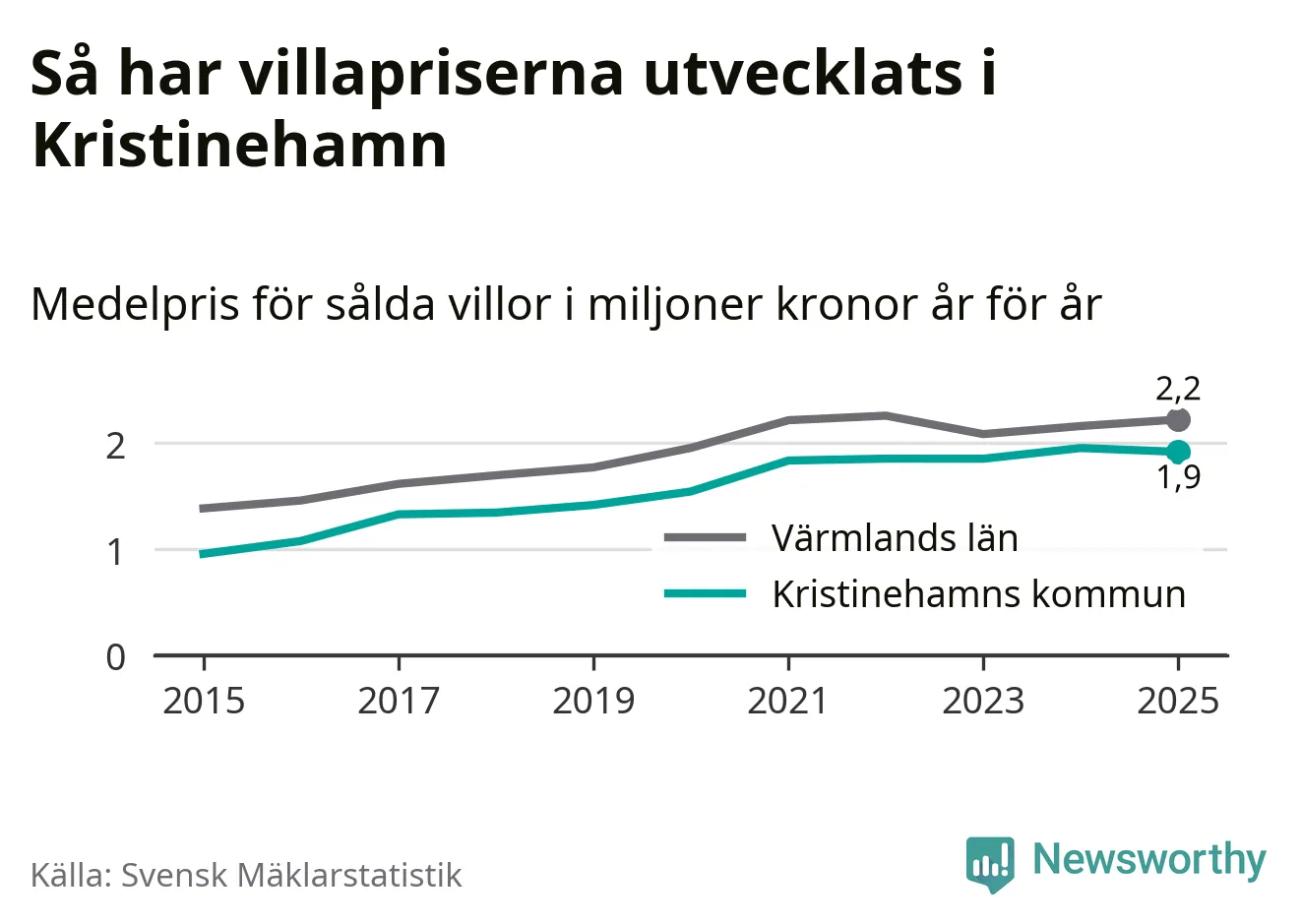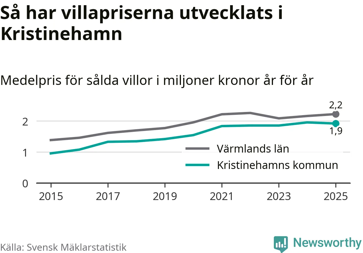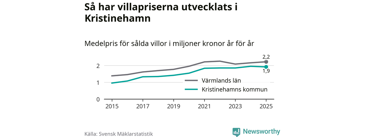 1,9 miljoner kronor är medelpriset för de villor som såldes i Kristinehamns kommun under året, eller 16 221 kronor per kvadratmeter. Det innebär en prisminskning med två procent på ett år.