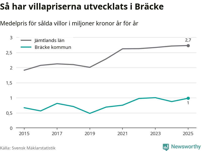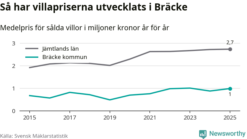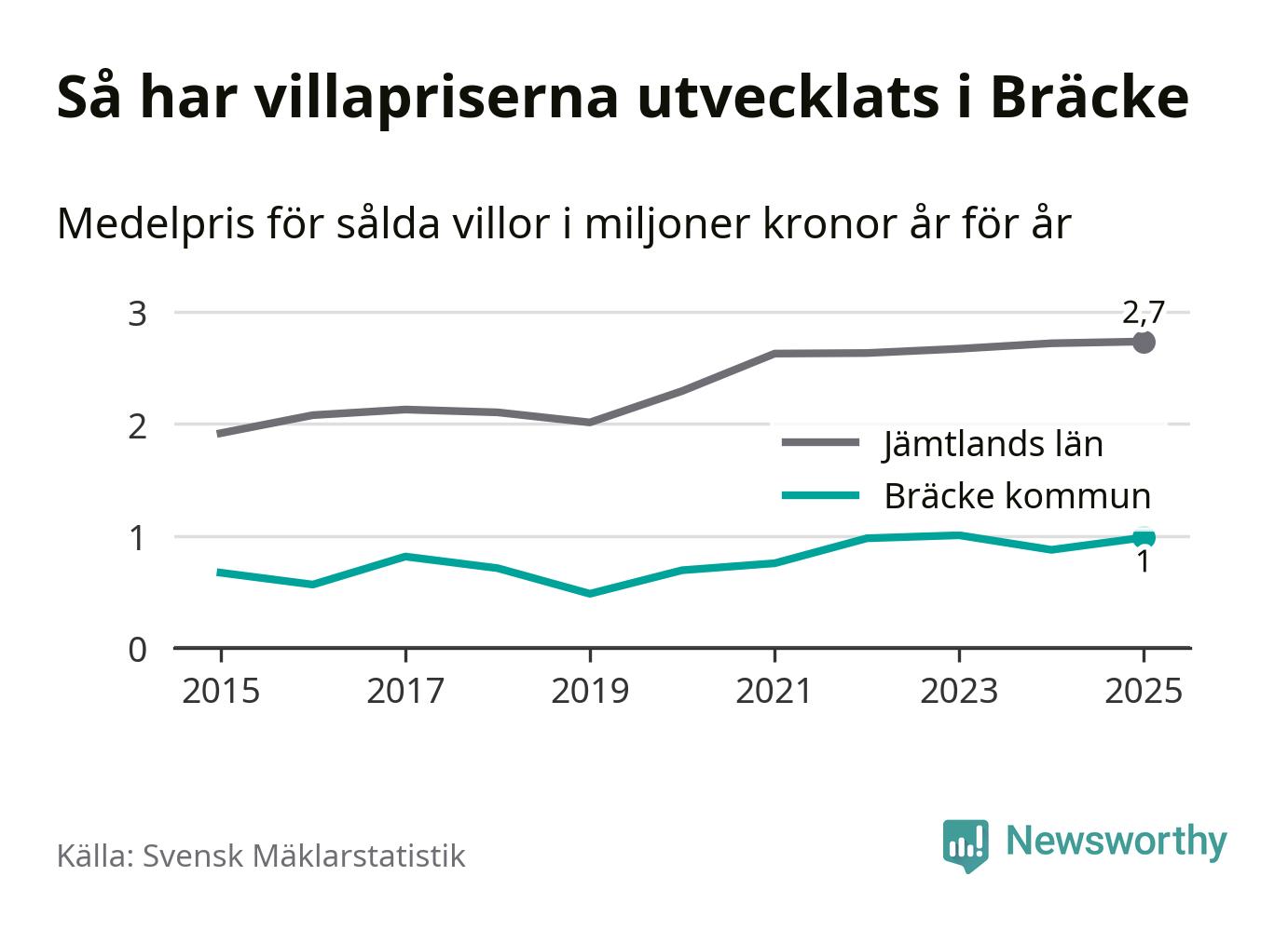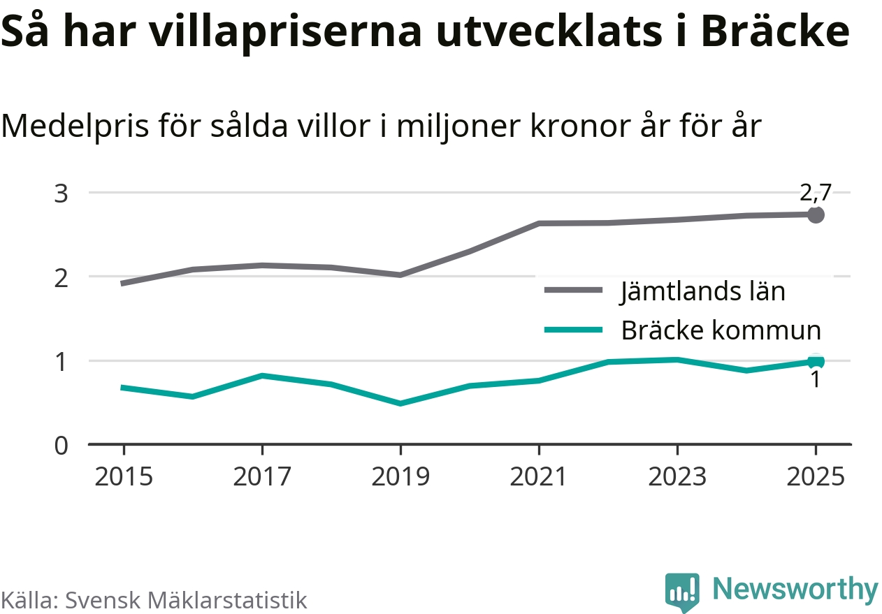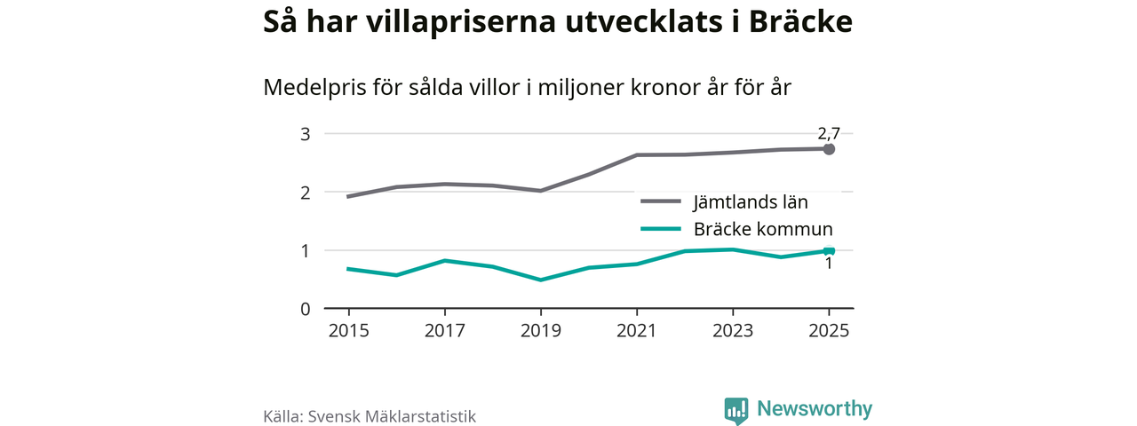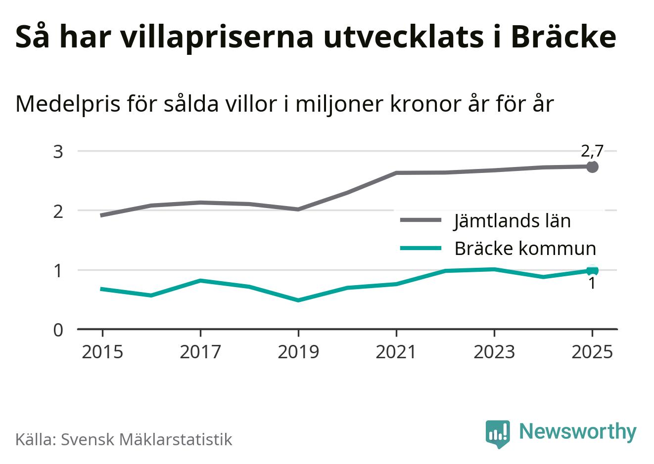 985 000 kronor är medelpriset för de villor som såldes i Bräcke kommun under året, eller 7 489 kronor per kvadratmeter. Det innebär en prisökning med 13 procent på ett år.