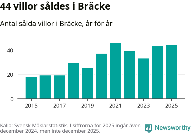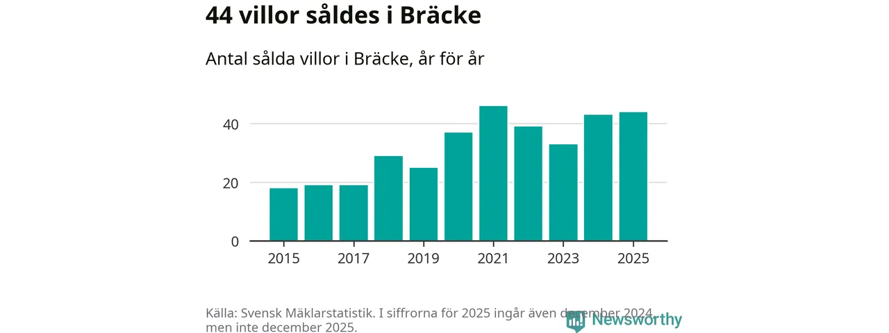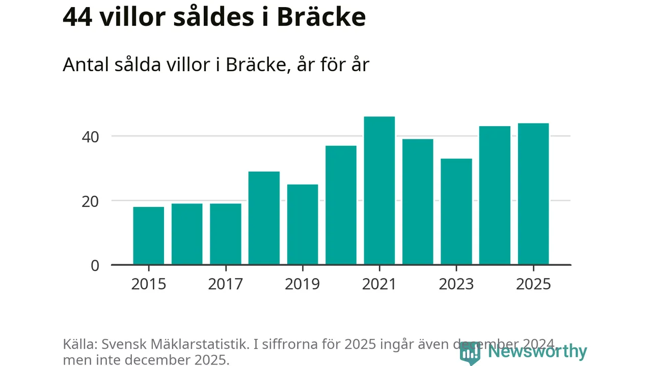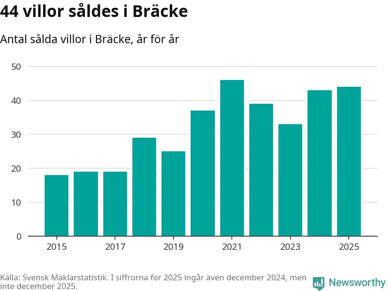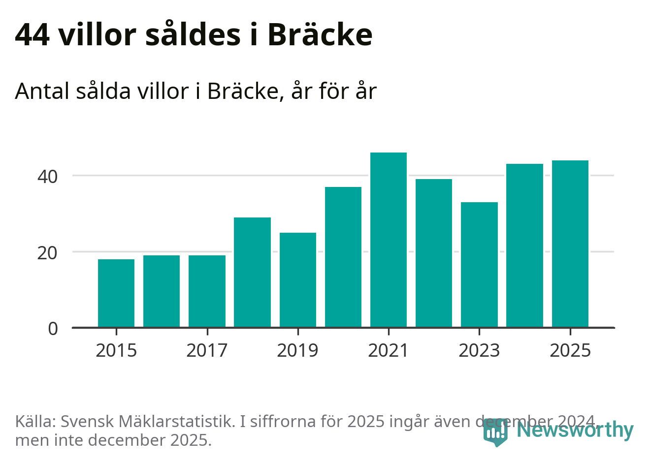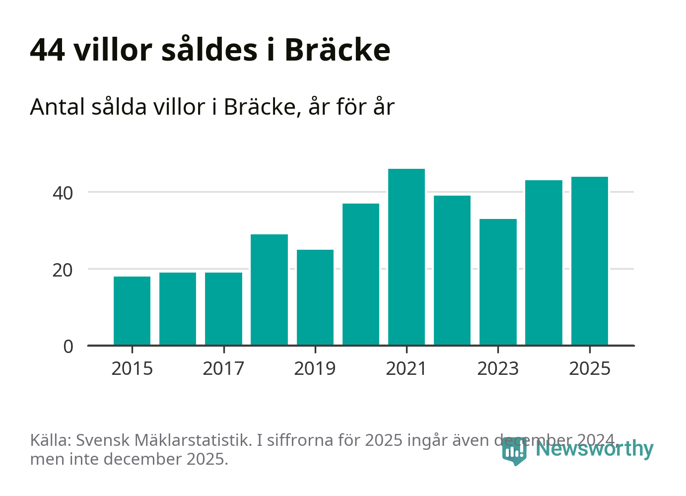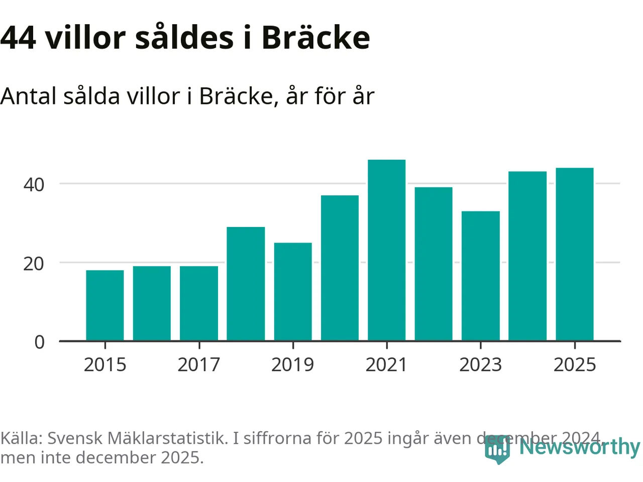 Antalet sålda villor ökade också något. Totalt såldes 44 villor, att jämföra med 43 under 2024. Det är andra året i rad som antalet sålda villor ökar i kommunen.
