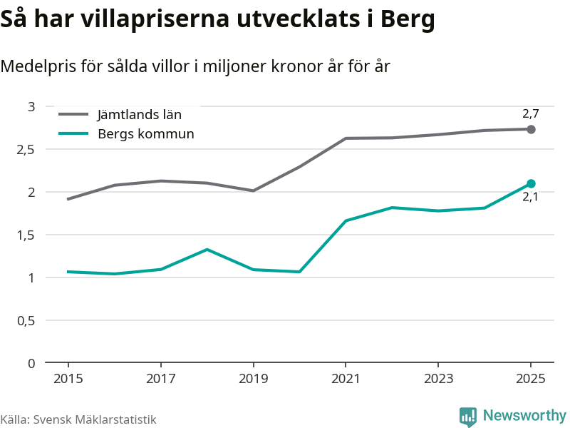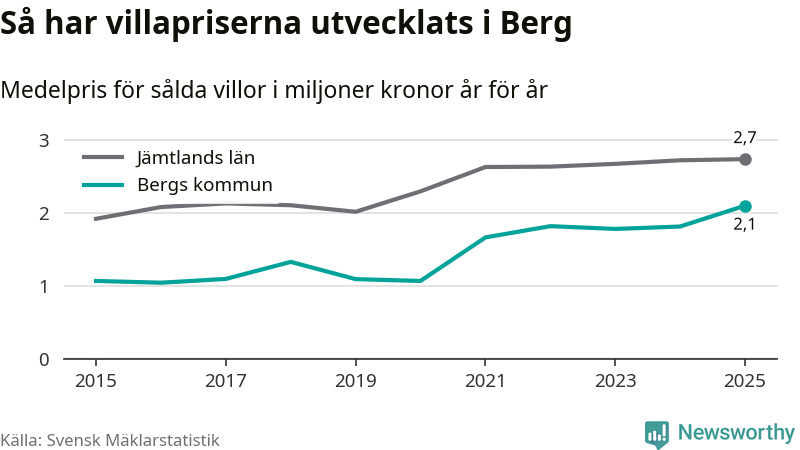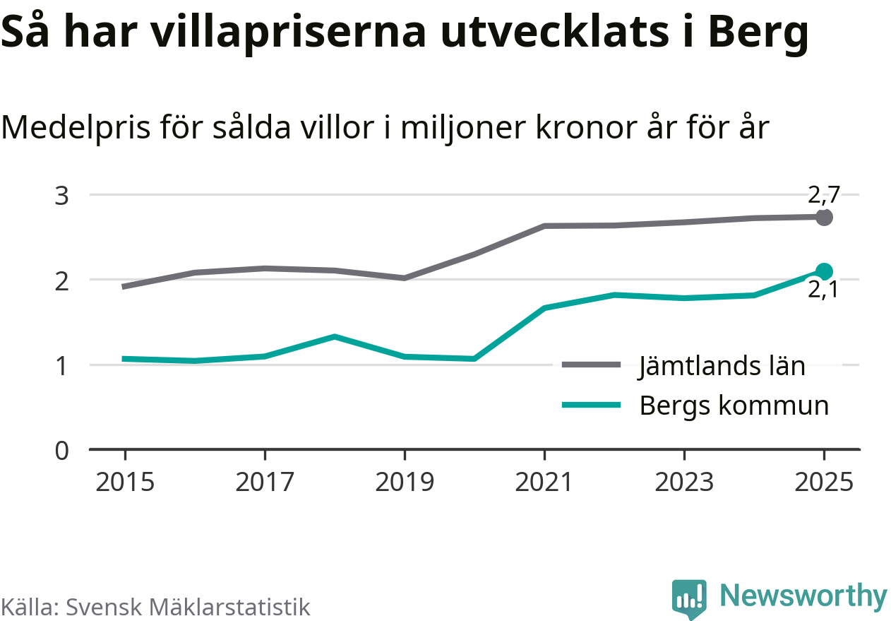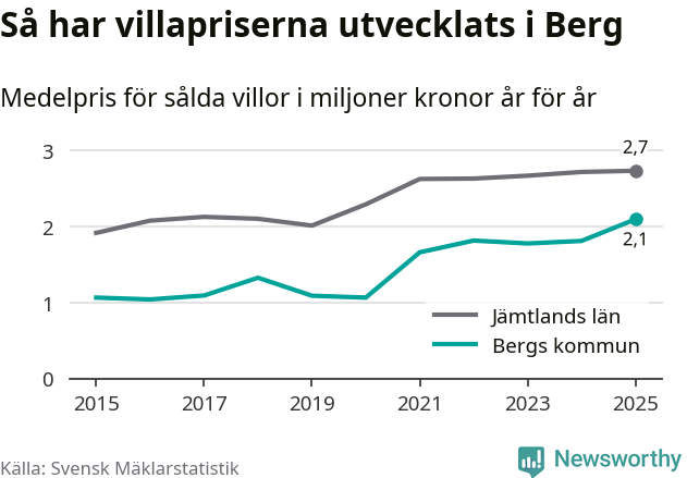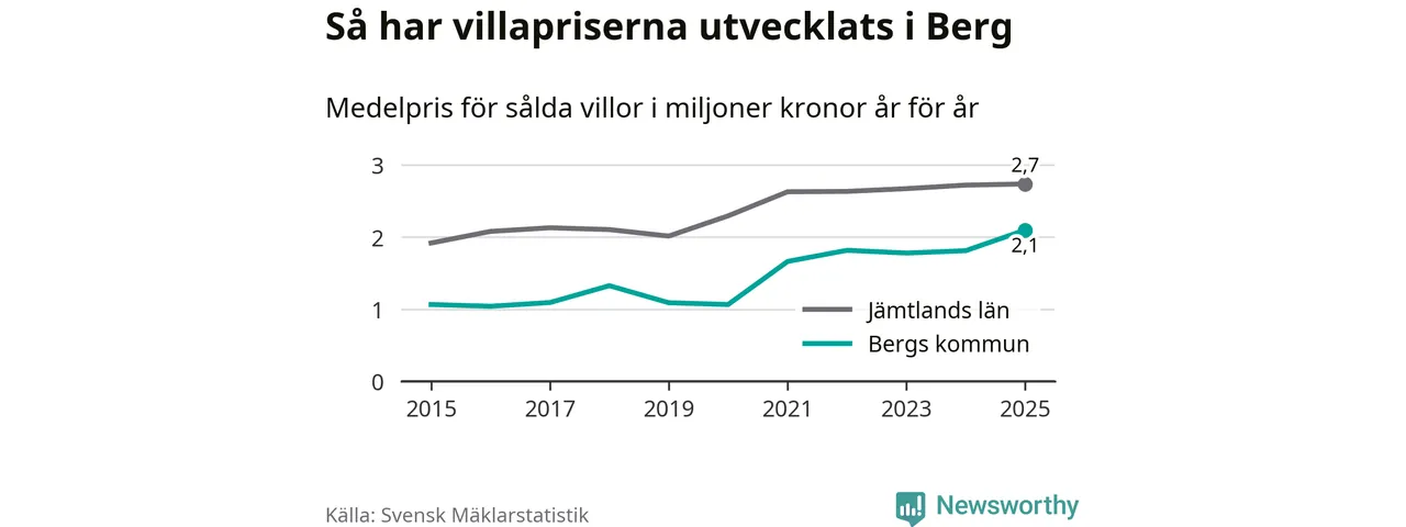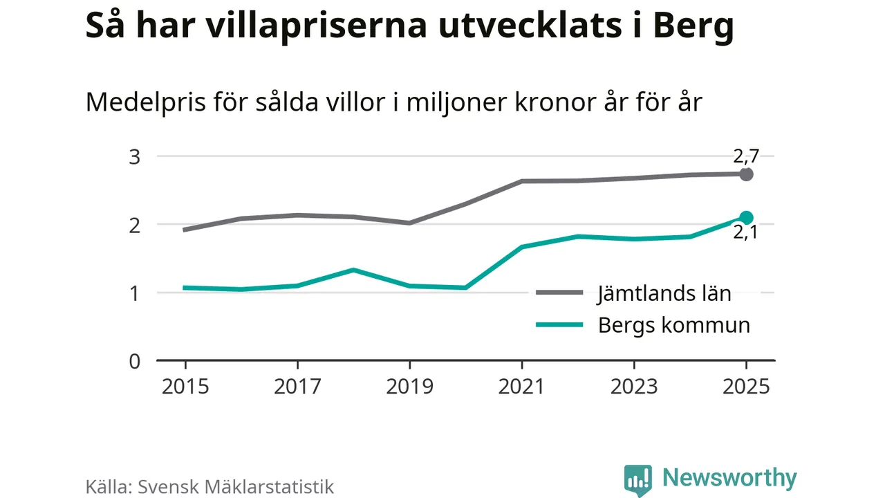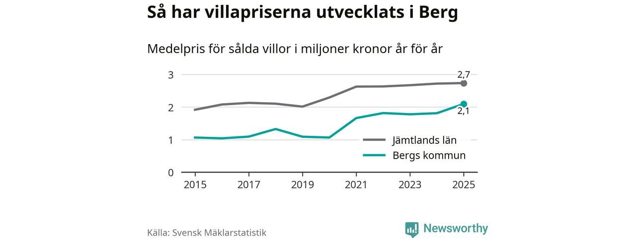 2,1 miljoner kronor är medelpriset för de villor som såldes i Bergs kommun under året, eller 21 659 kronor per kvadratmeter. Det innebär en prisökning med 16 procent på ett år. Det är det högsta årssnittet på åtminstone tio år. Bryter man upp siffrorna per kvartal har dock ännu högre villapriser noterats i Berg vintern 2021/22.