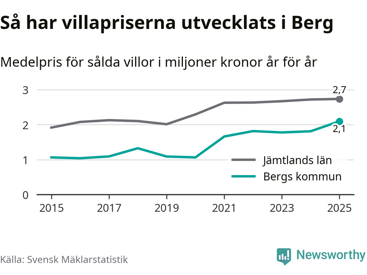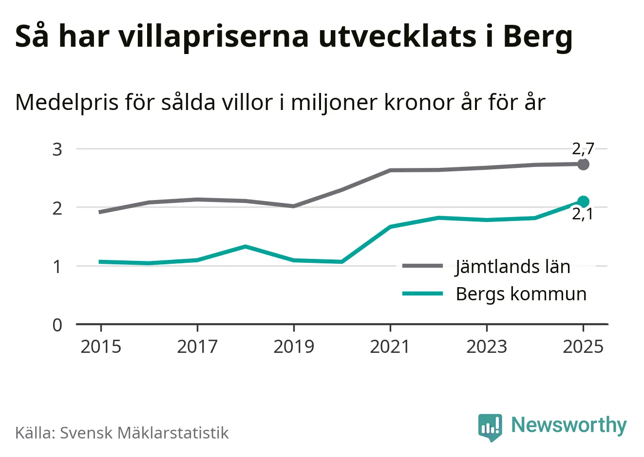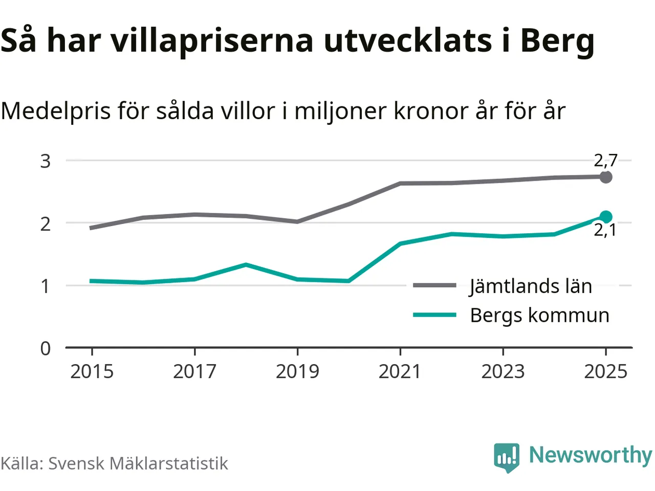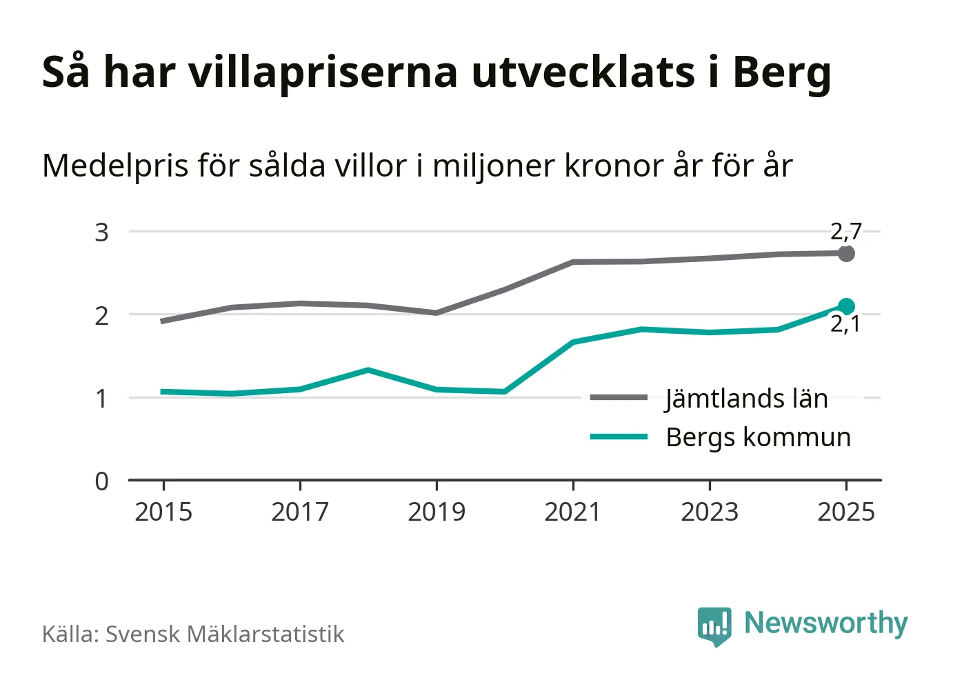2,1 miljoner kronor är medelpriset för de villor som såldes i Bergs kommun under året, eller 21 659 kronor per kvadratmeter. Det innebär en prisökning med 16 procent på ett år. Det är det högsta årssnittet på åtminstone tio år. Bryter man upp siffrorna per kvartal har dock ännu högre villapriser noterats i Berg vintern 2021/22.