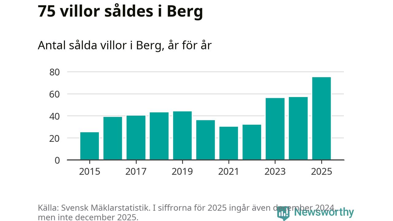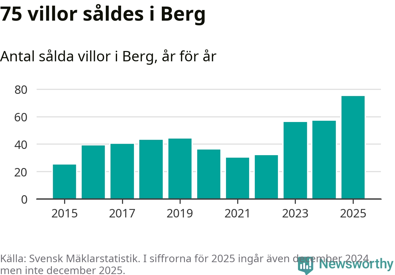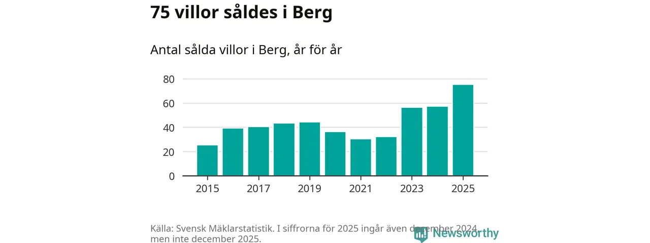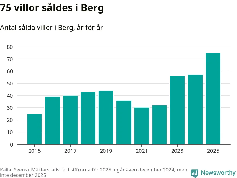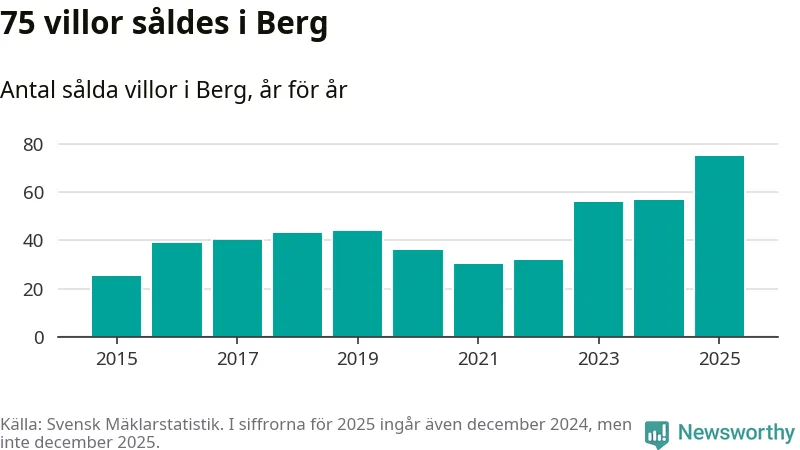 Antalet sålda villor ökade också. Totalt såldes 75 villor, att jämföra med 57 under 2024. Det är fler än något annat år sedan 2015.