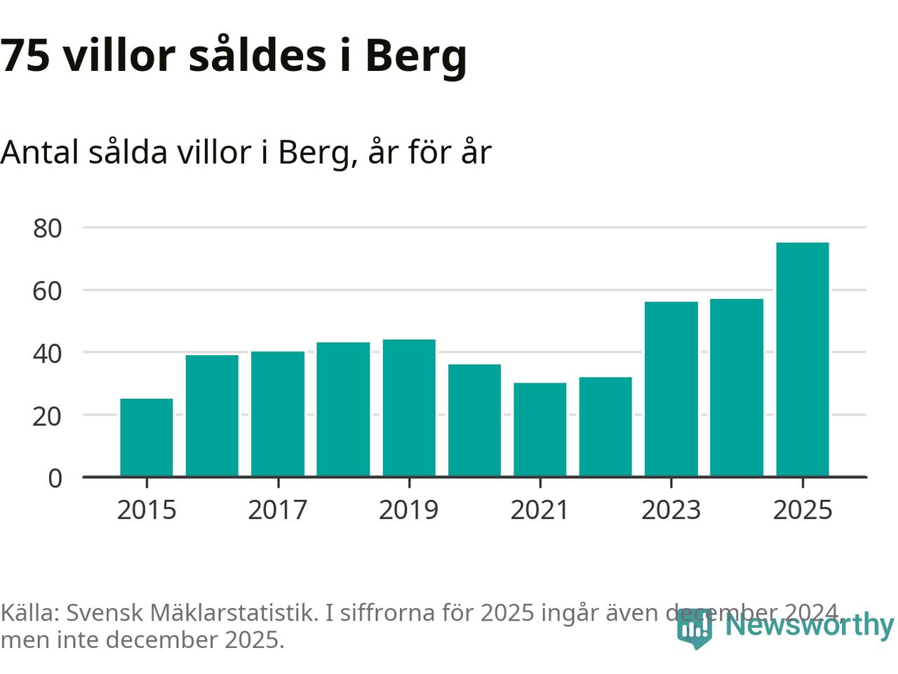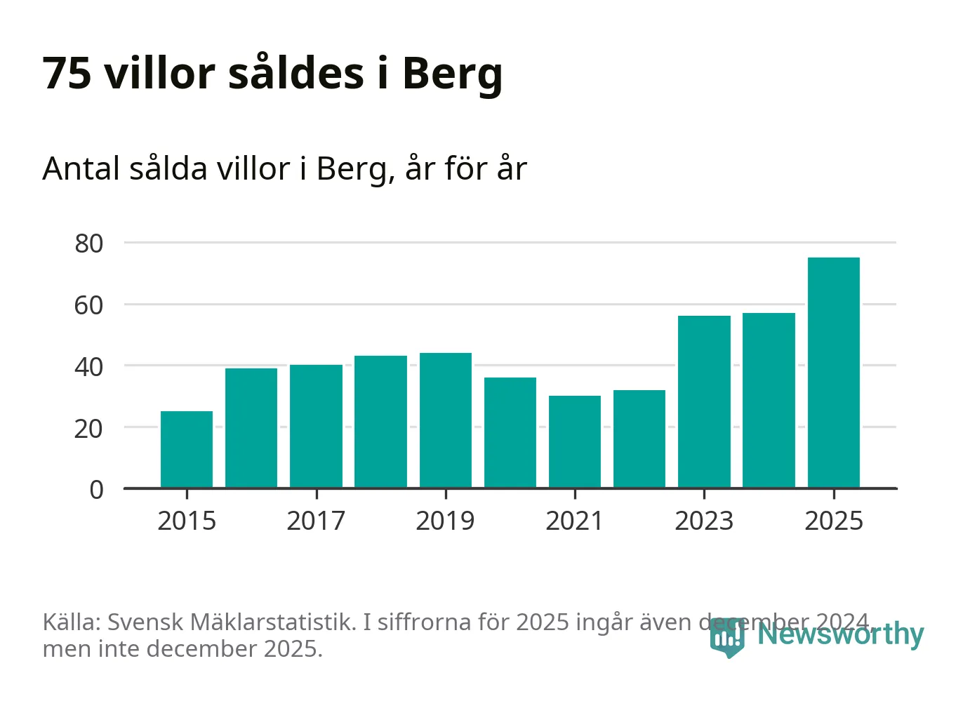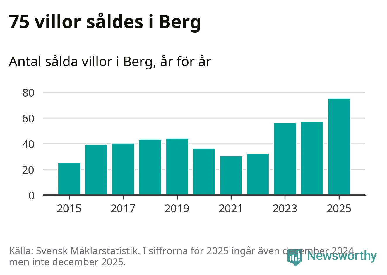 Antalet sålda villor ökade också. Totalt såldes 75 villor, att jämföra med 57 under 2024. Det är fler än något annat år sedan 2015.