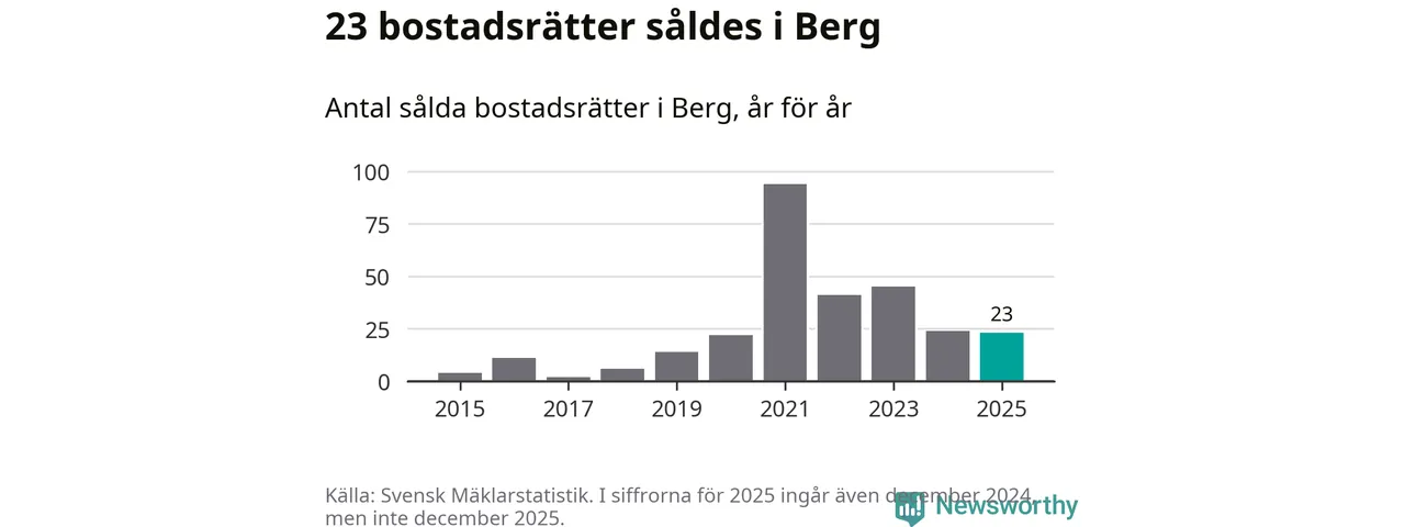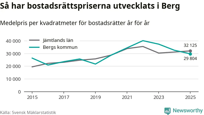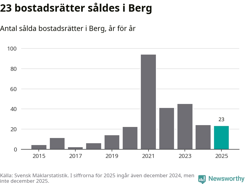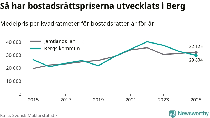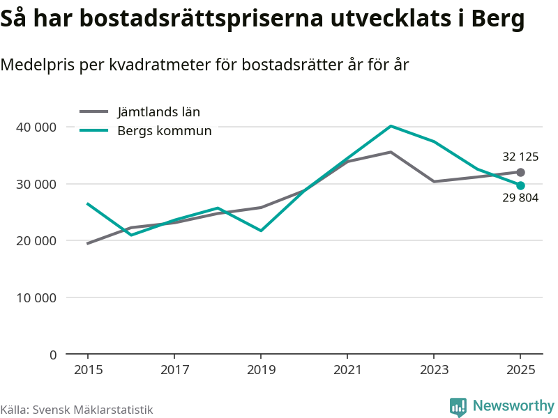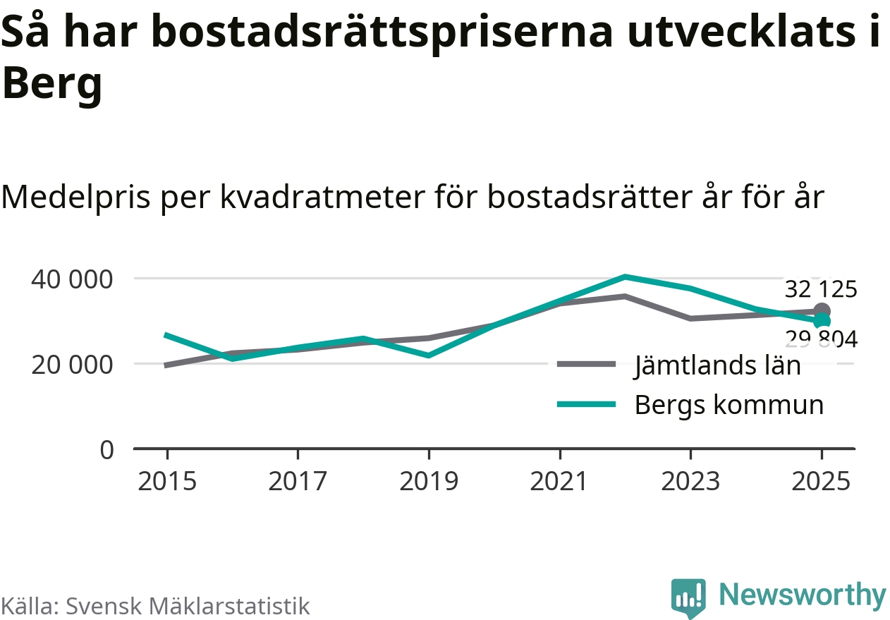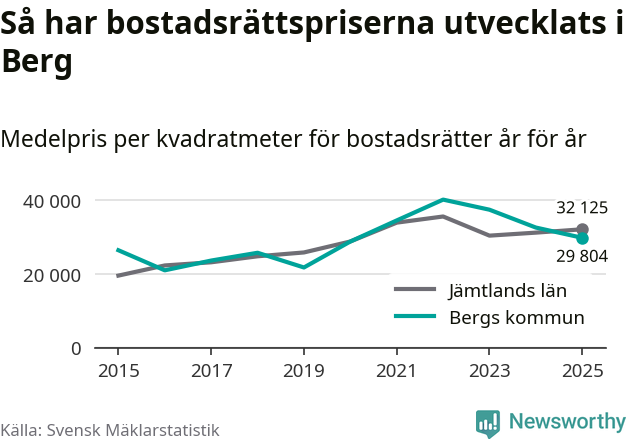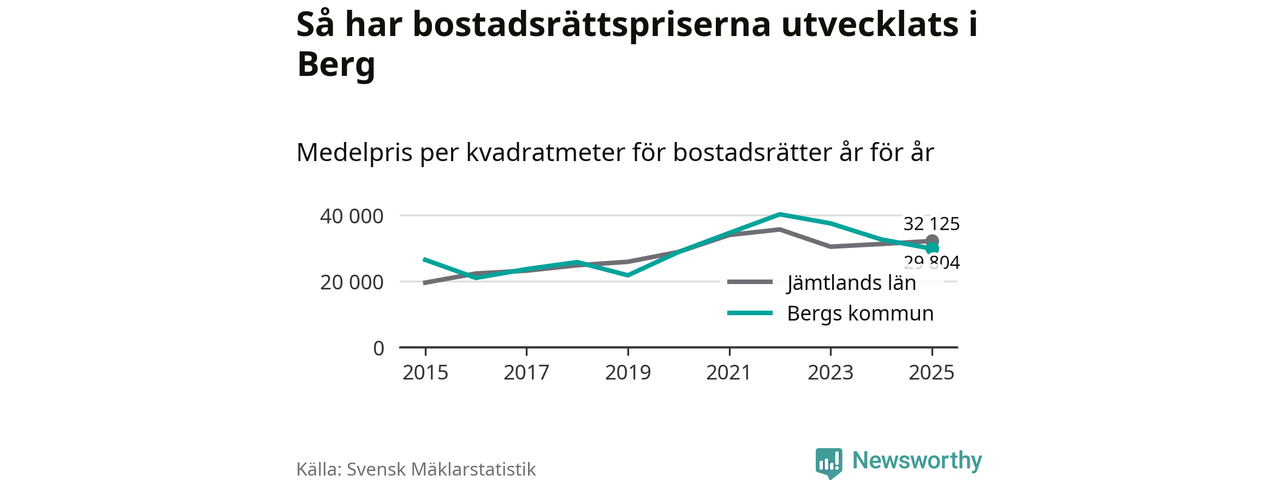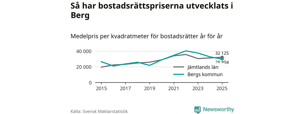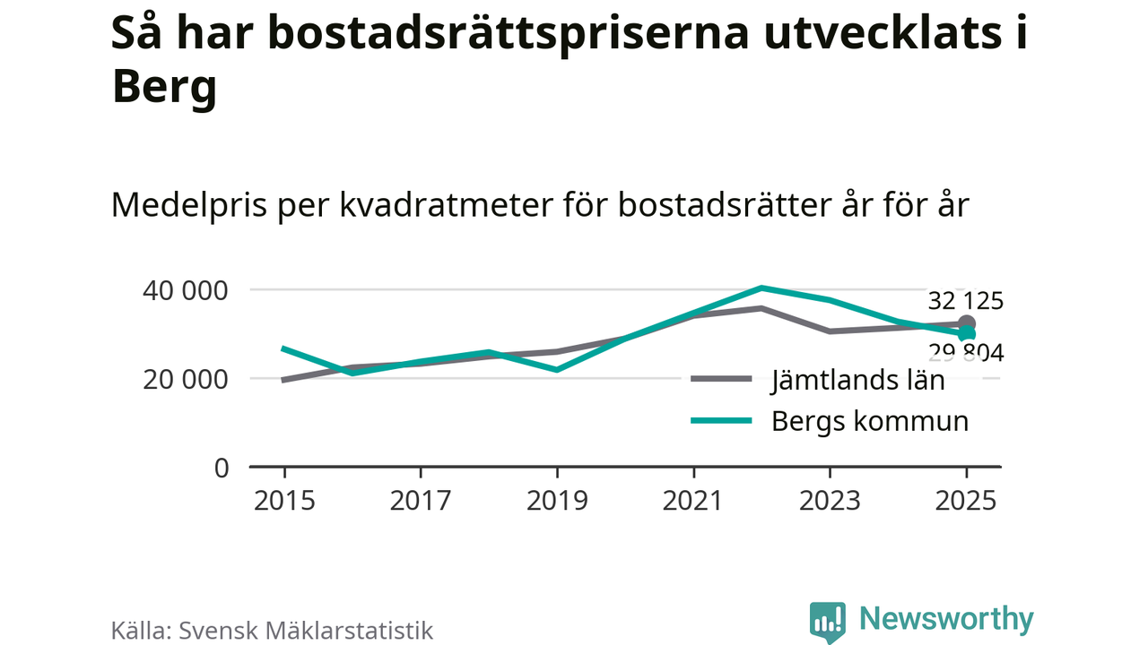 Det såldes totalt 23 bostadsrätter i Bergs kommun under året. Genomsnittspriset per kvadratmeter landade på 29 804 kronor. Det är en minskning med nio procent i kommunen på ett år.