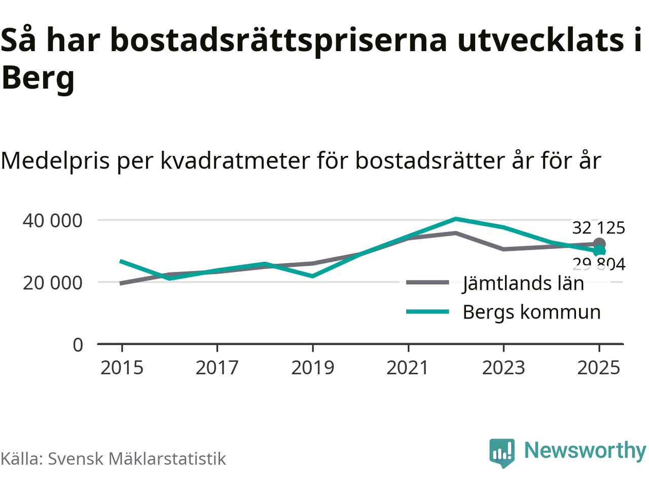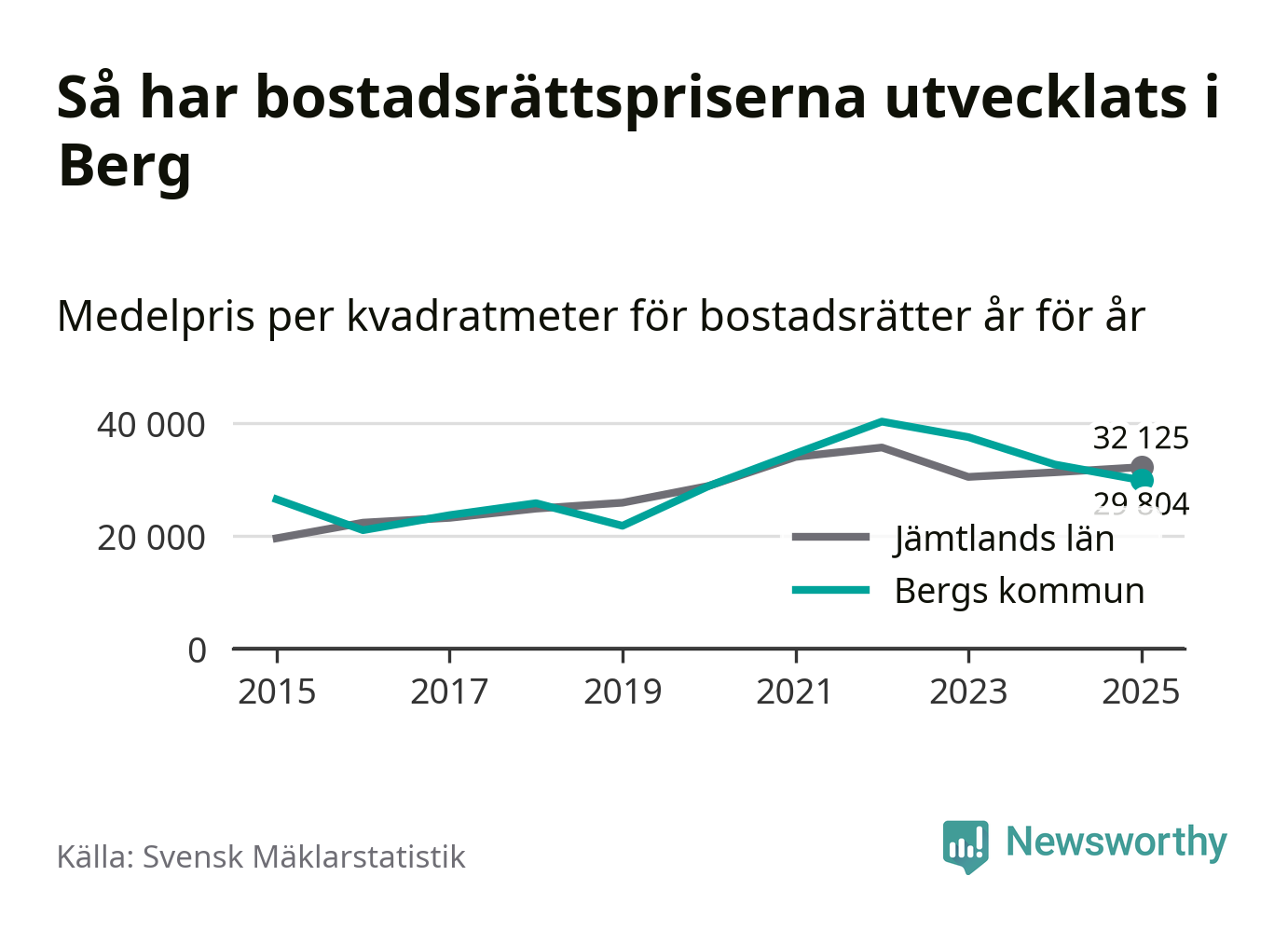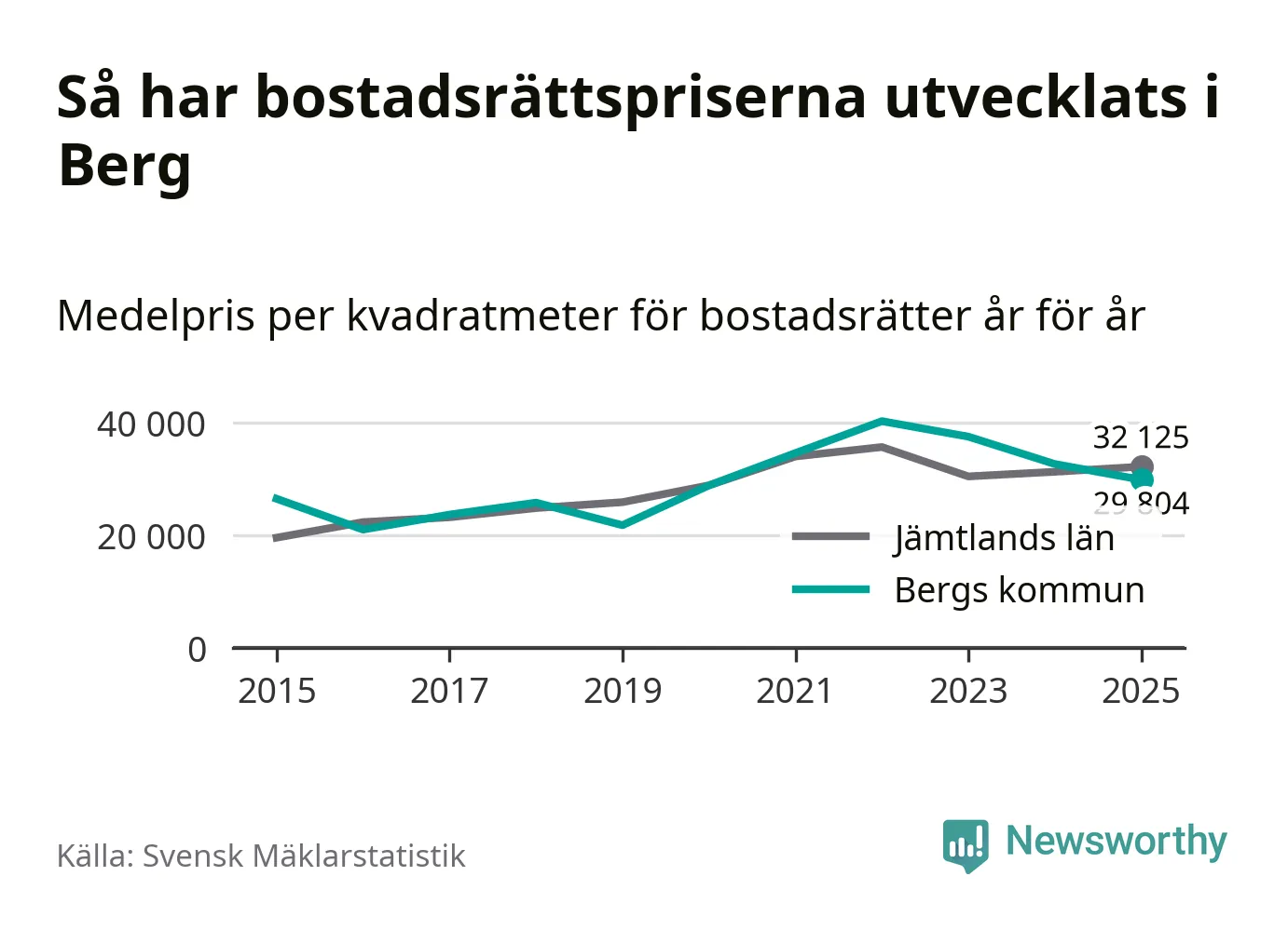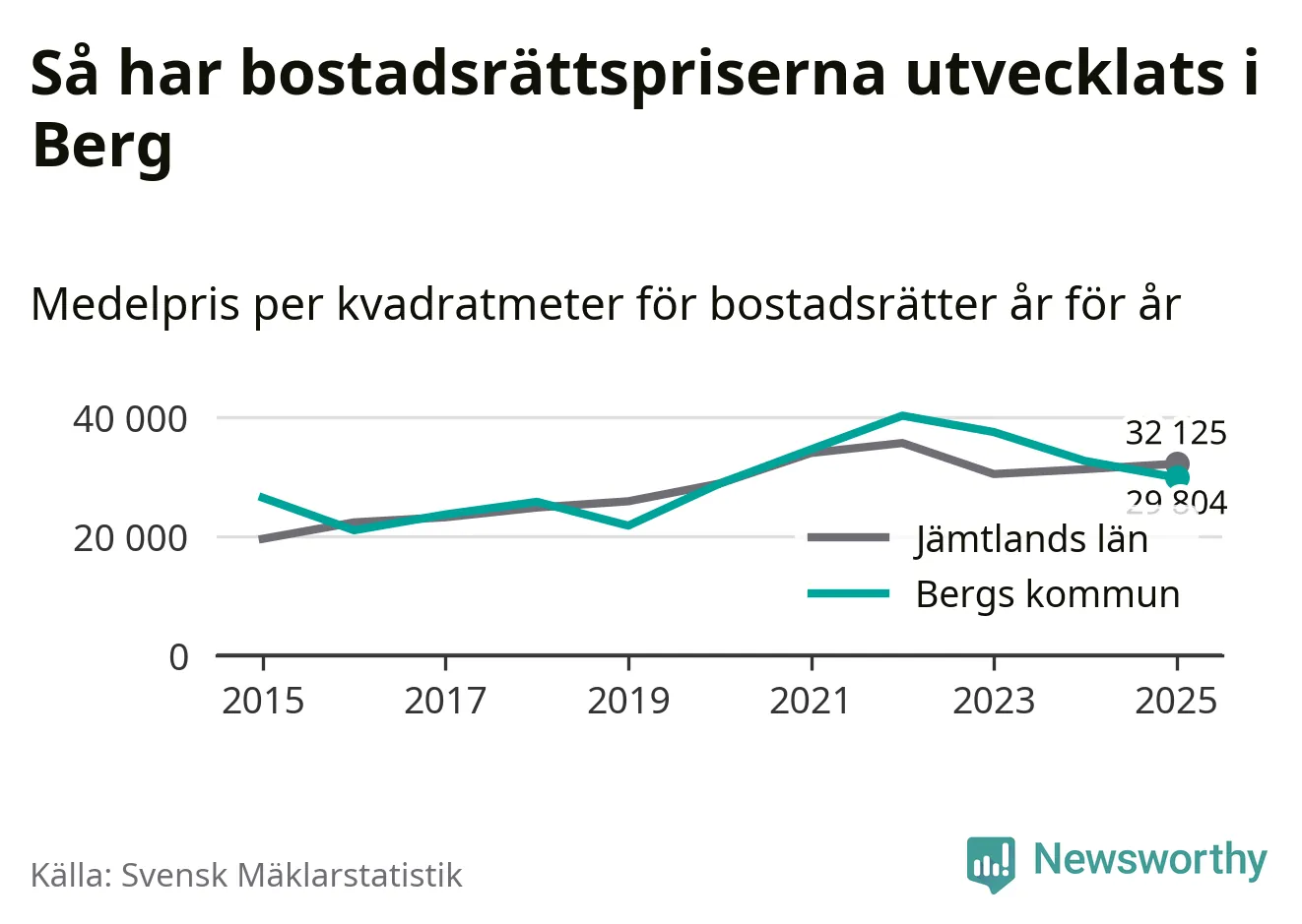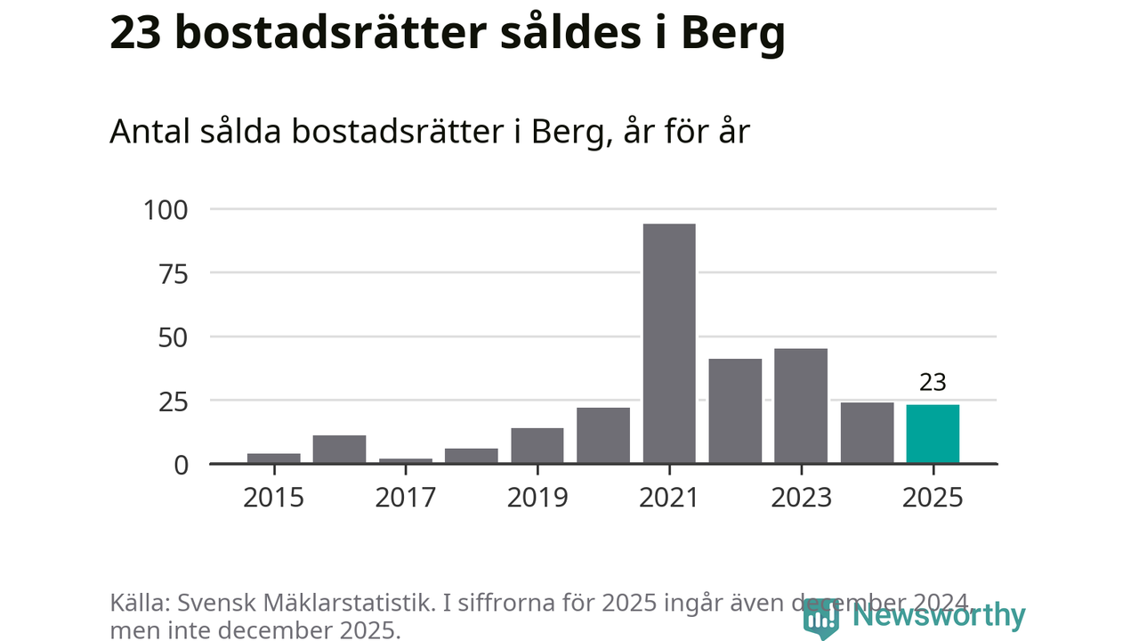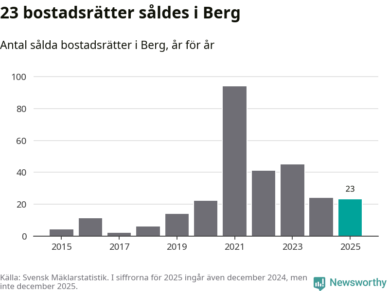 Det såldes totalt 23 bostadsrätter i Bergs kommun under året. Genomsnittspriset per kvadratmeter landade på 29 804 kronor. Det är en minskning med nio procent i kommunen på ett år.
